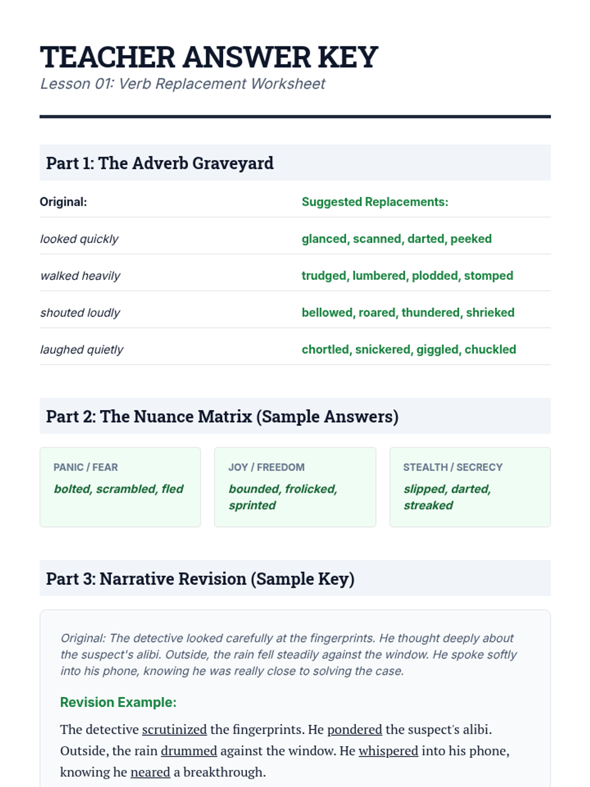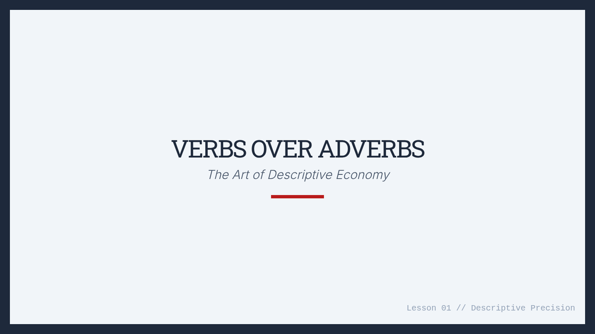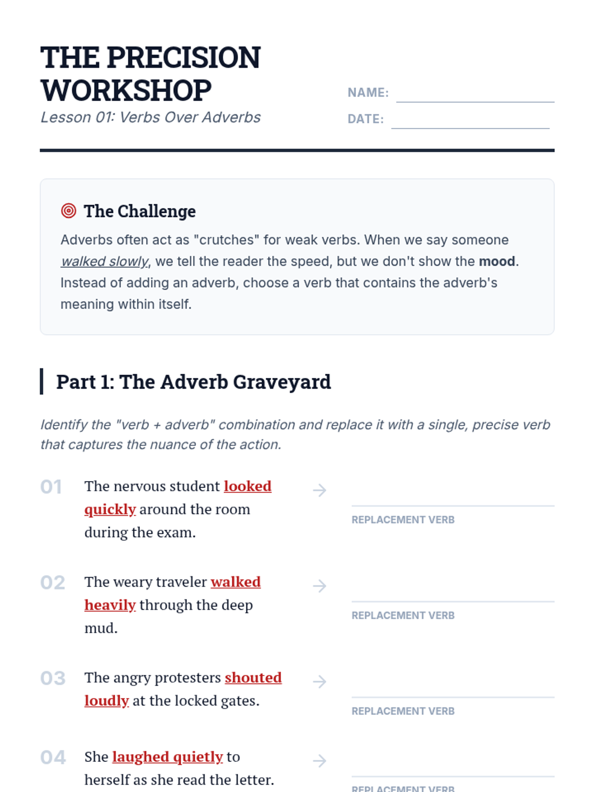 A 5-lesson workshop-style sequence for 11th grade ELA focusing on the precise use of adjectives and adverbs. Students move from replacing weak adverbs with strong verbs to mastering the nuances of cumulative vs. coordinate adjectives and eliminating redundancy.