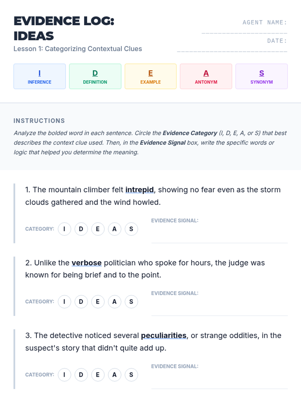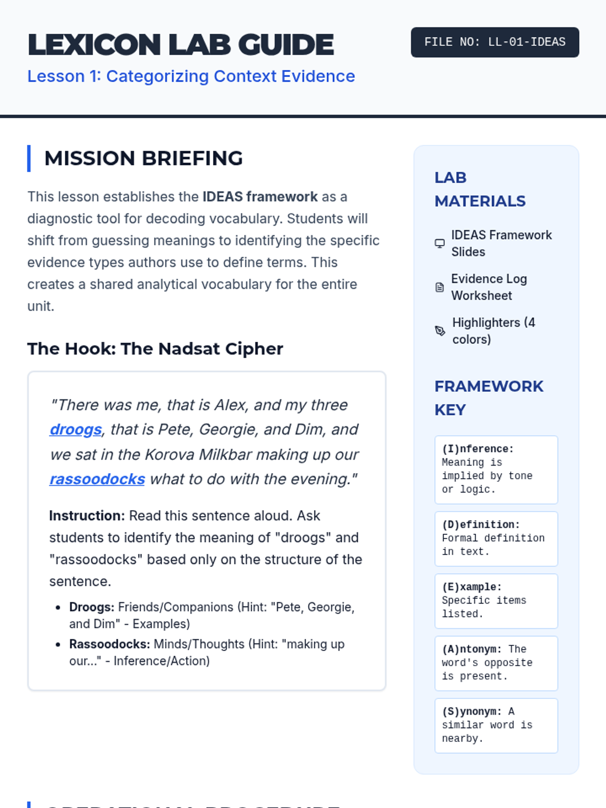 A comprehensive 10th-grade sequence that moves from basic synonym identification to advanced analytical strategies for decoding high-lexile vocabulary. Students use the IDEAS framework, syntactic analysis, and tonal inference to master the skill of determining word meaning in complex texts.