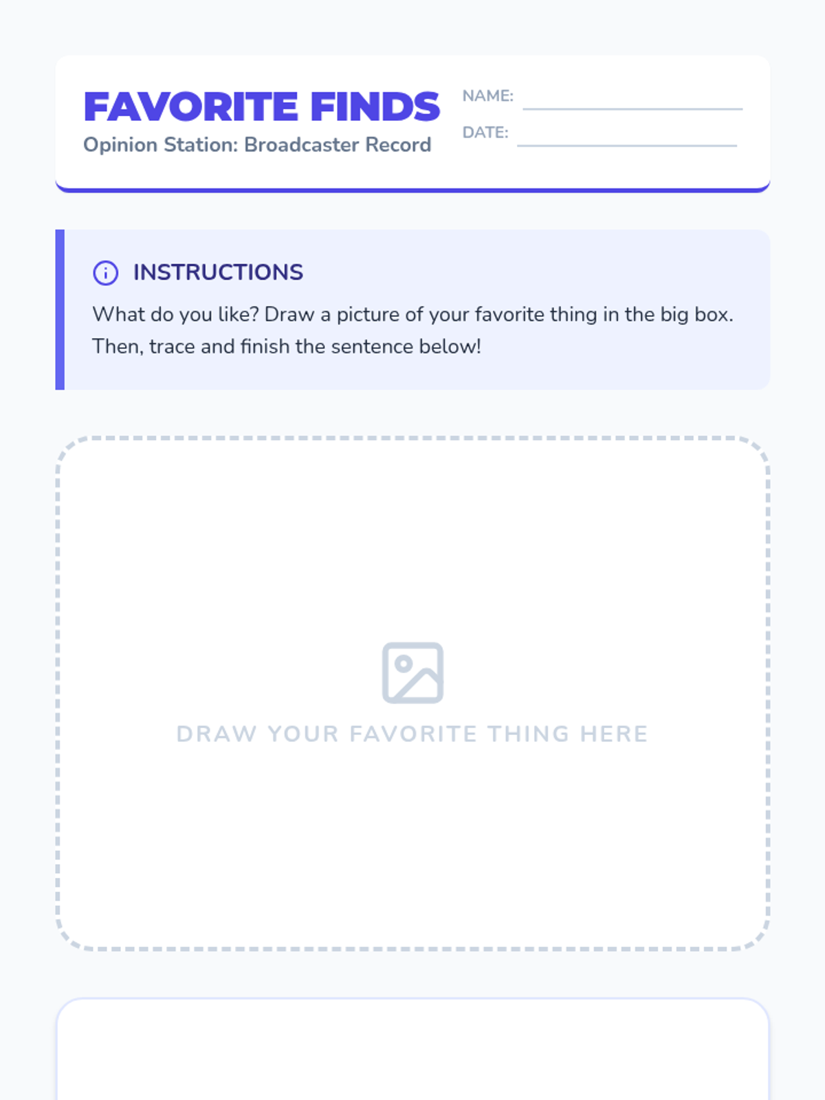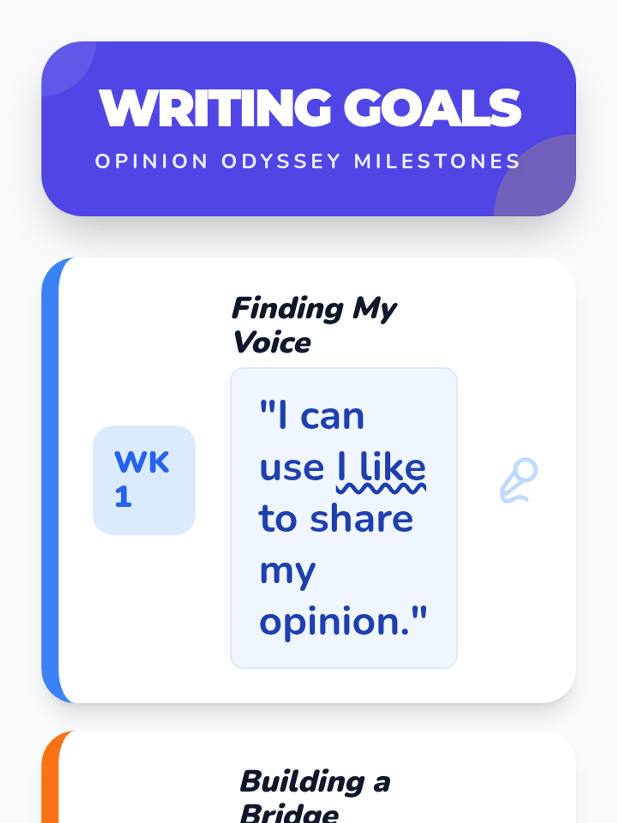 A foundational writing sequence for early learners focused on developing opinion writing skills. Students progress from stating simple preferences to supporting their opinions with reasons and descriptive details using 'I like' and 'because'.