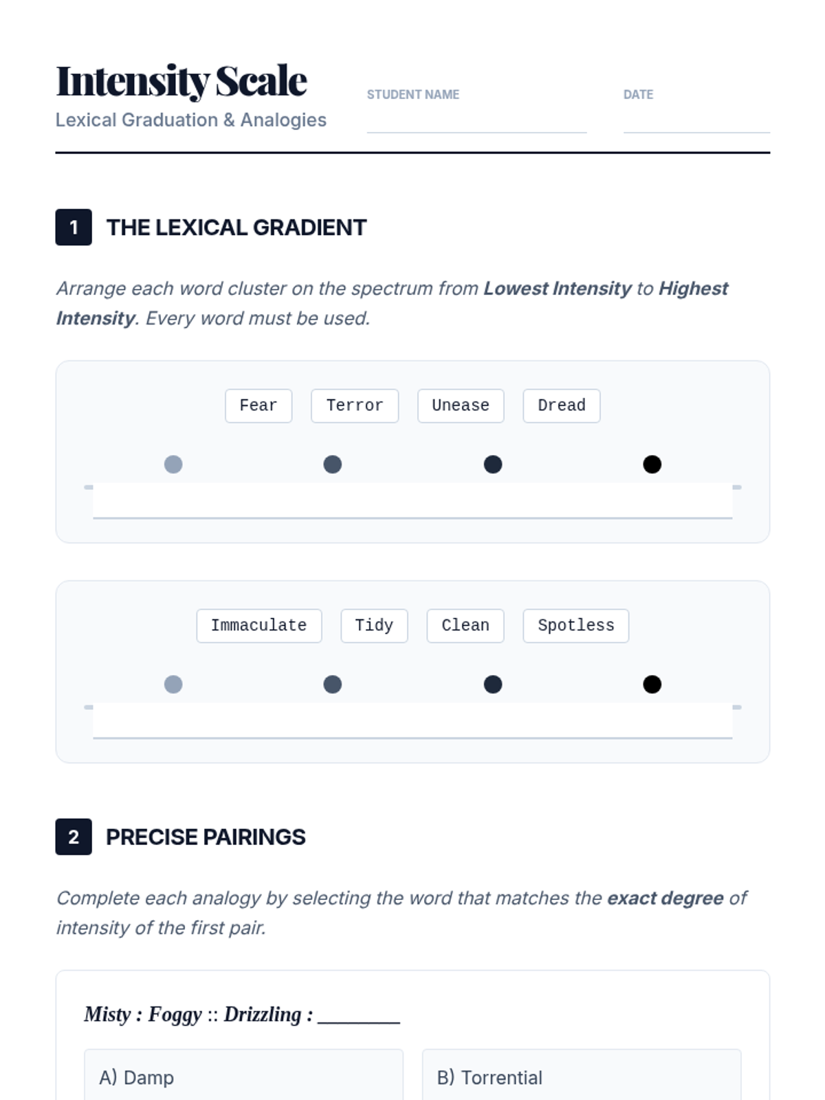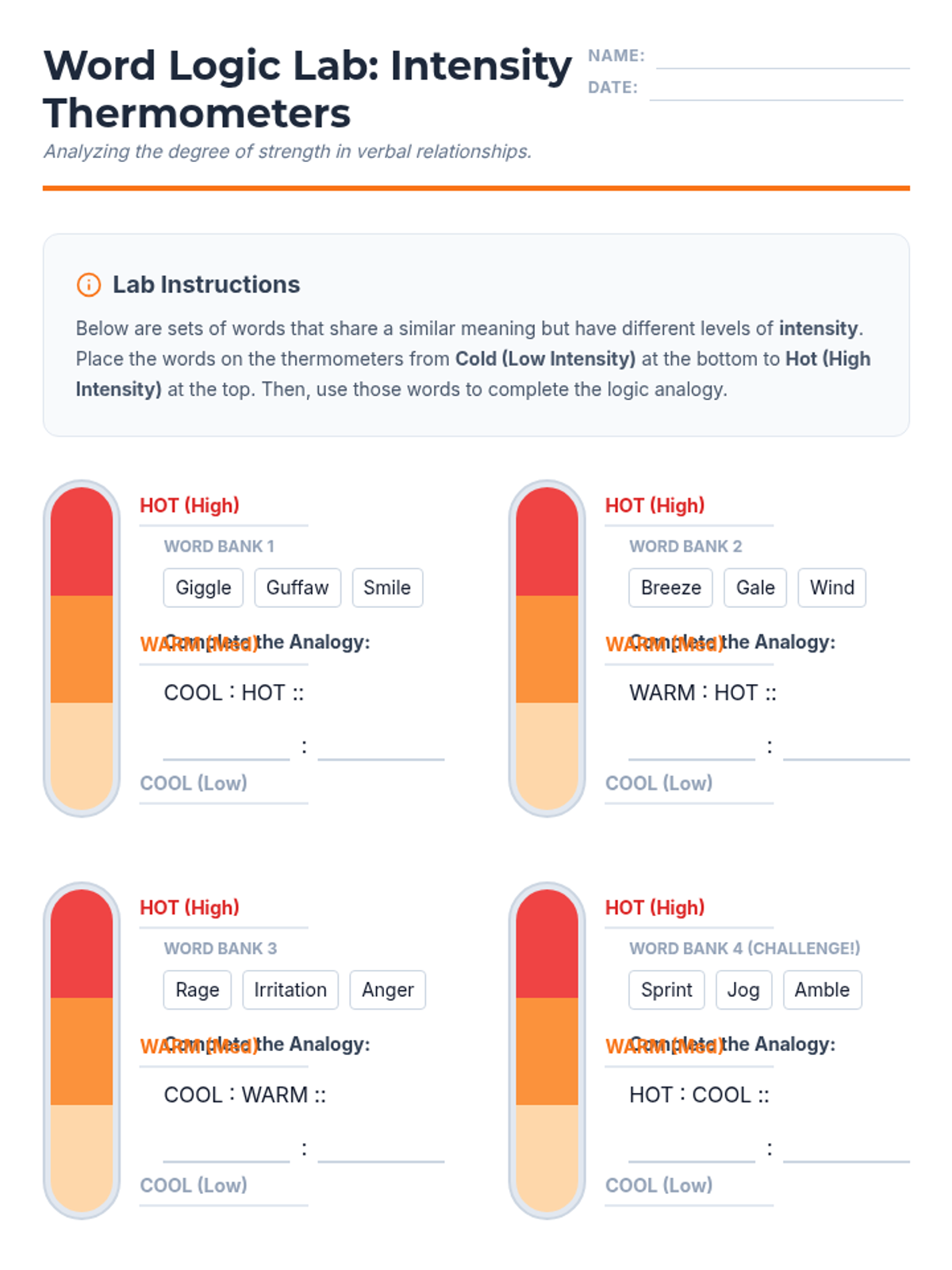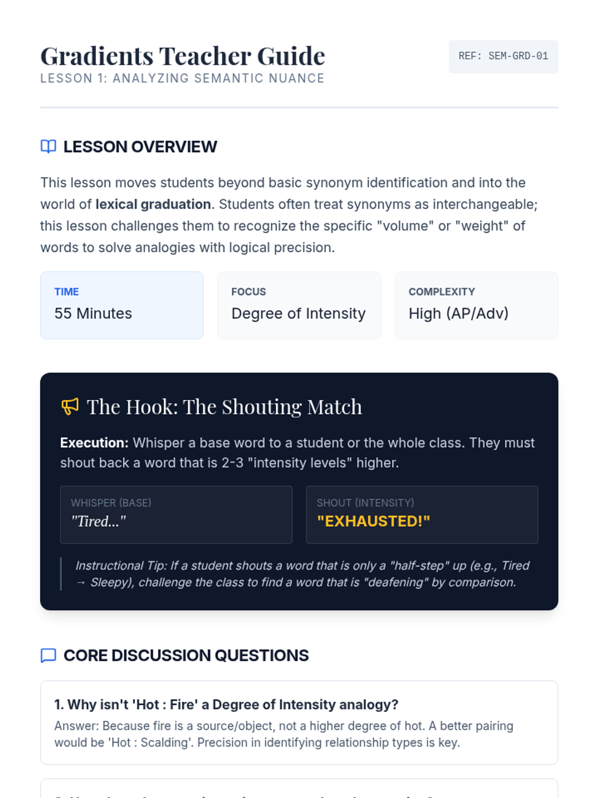 An advanced 11th-grade ELA sequence exploring semantic nuance through analogies. Students analyze word intensity, connotation, taxonomy, and paradoxical relationships to master verbal precision and logical reasoning.