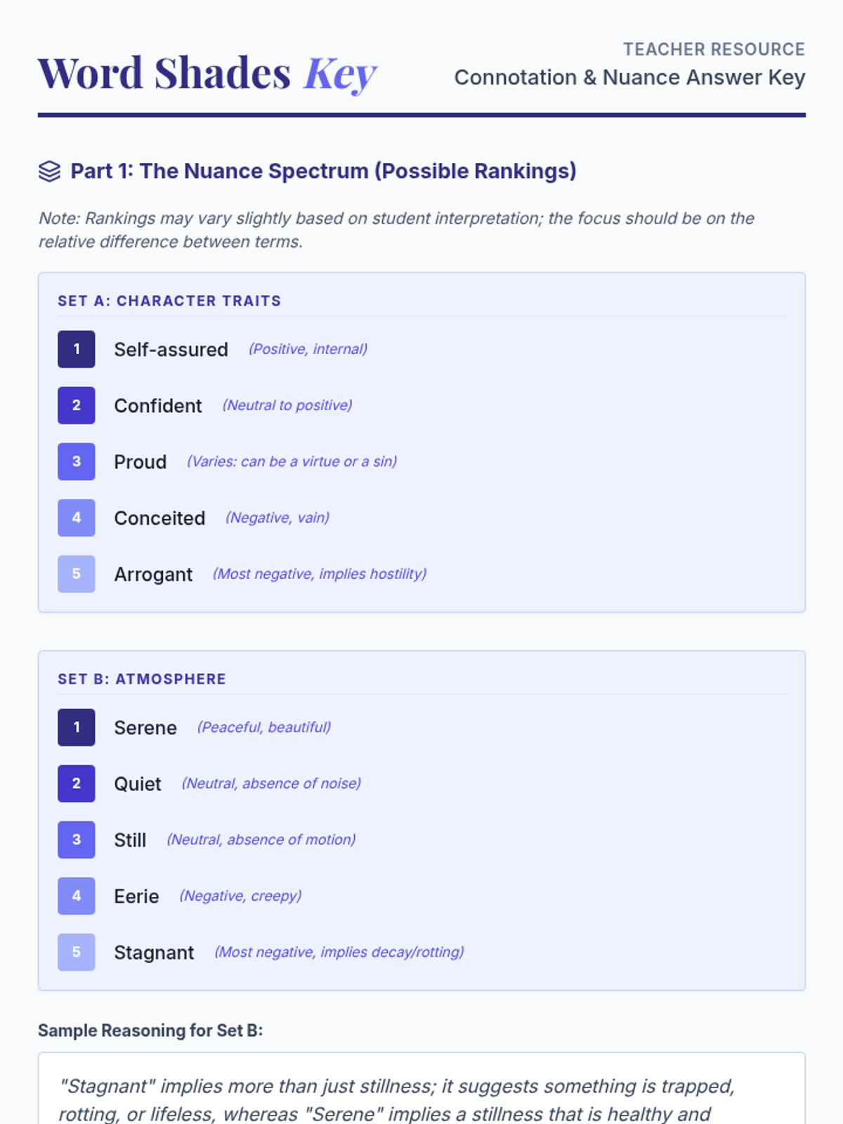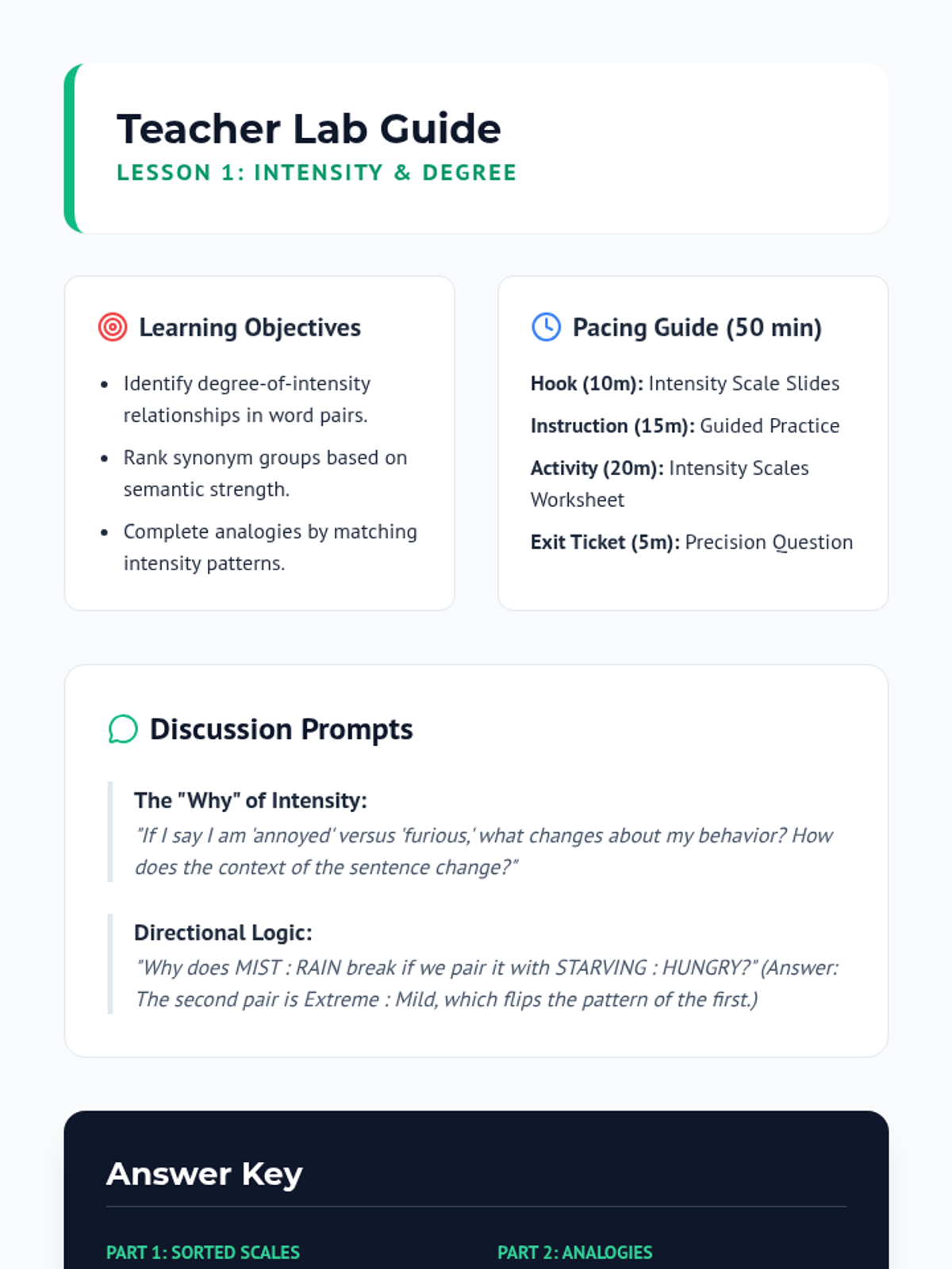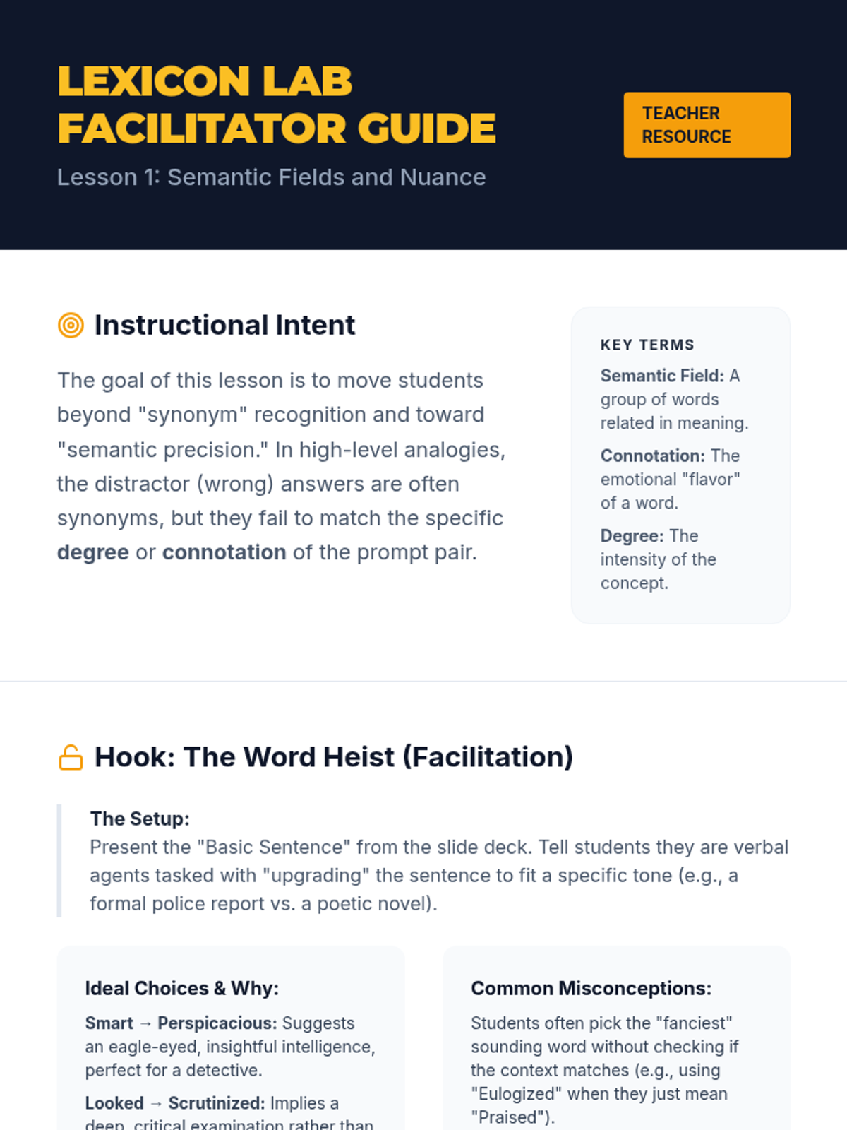 An advanced 11th-grade ELA sequence exploring semantic nuance through analogies. Students analyze word intensity, connotation, taxonomy, and paradoxical relationships to master verbal precision and logical reasoning.