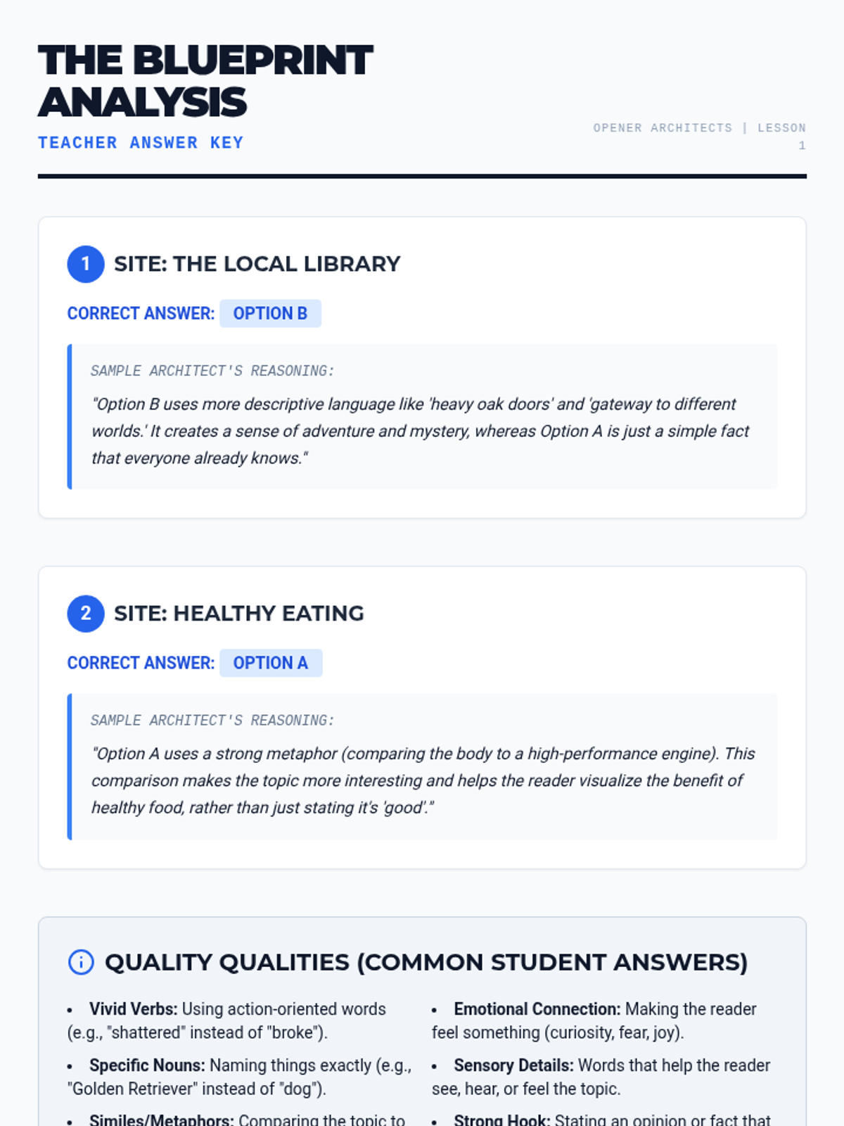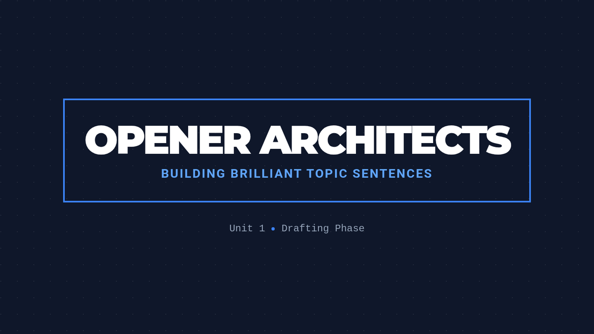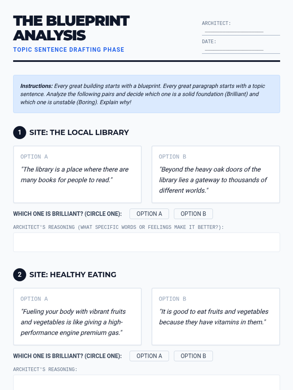 A 5th-grade writing sequence focused on transforming bland topic sentences into engaging 'hooks' that guide the reader while maintaining structural integrity. Students analyze, revise, and peer-review topic sentences using architectural metaphors to understand paragraph construction.