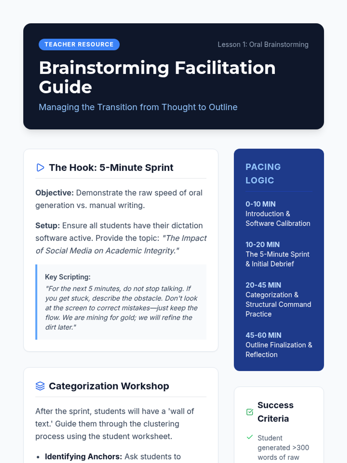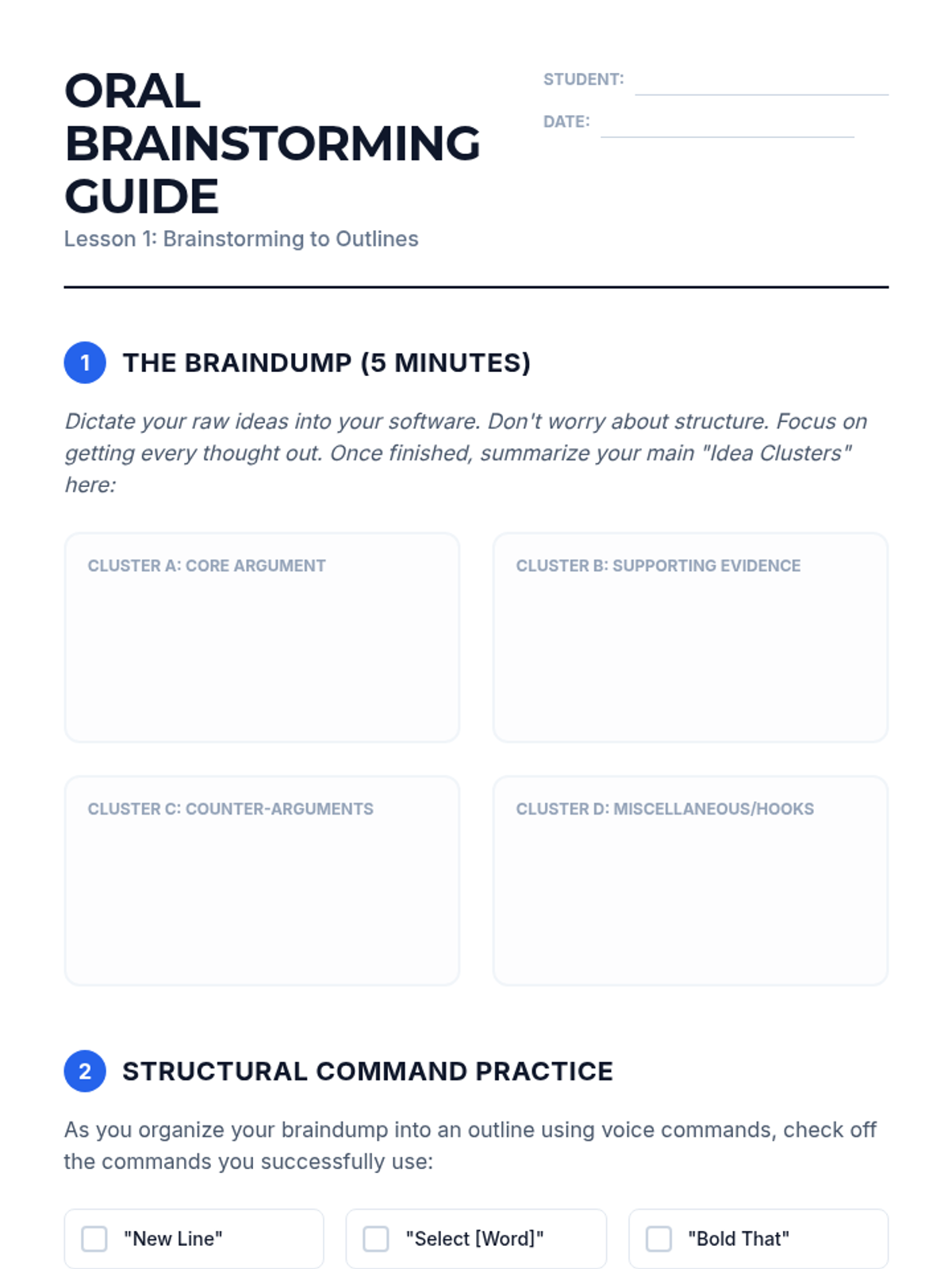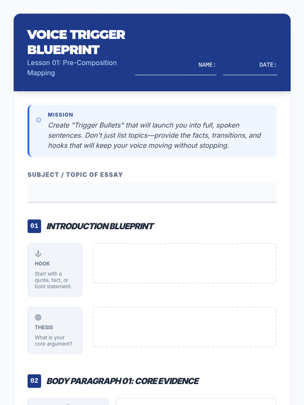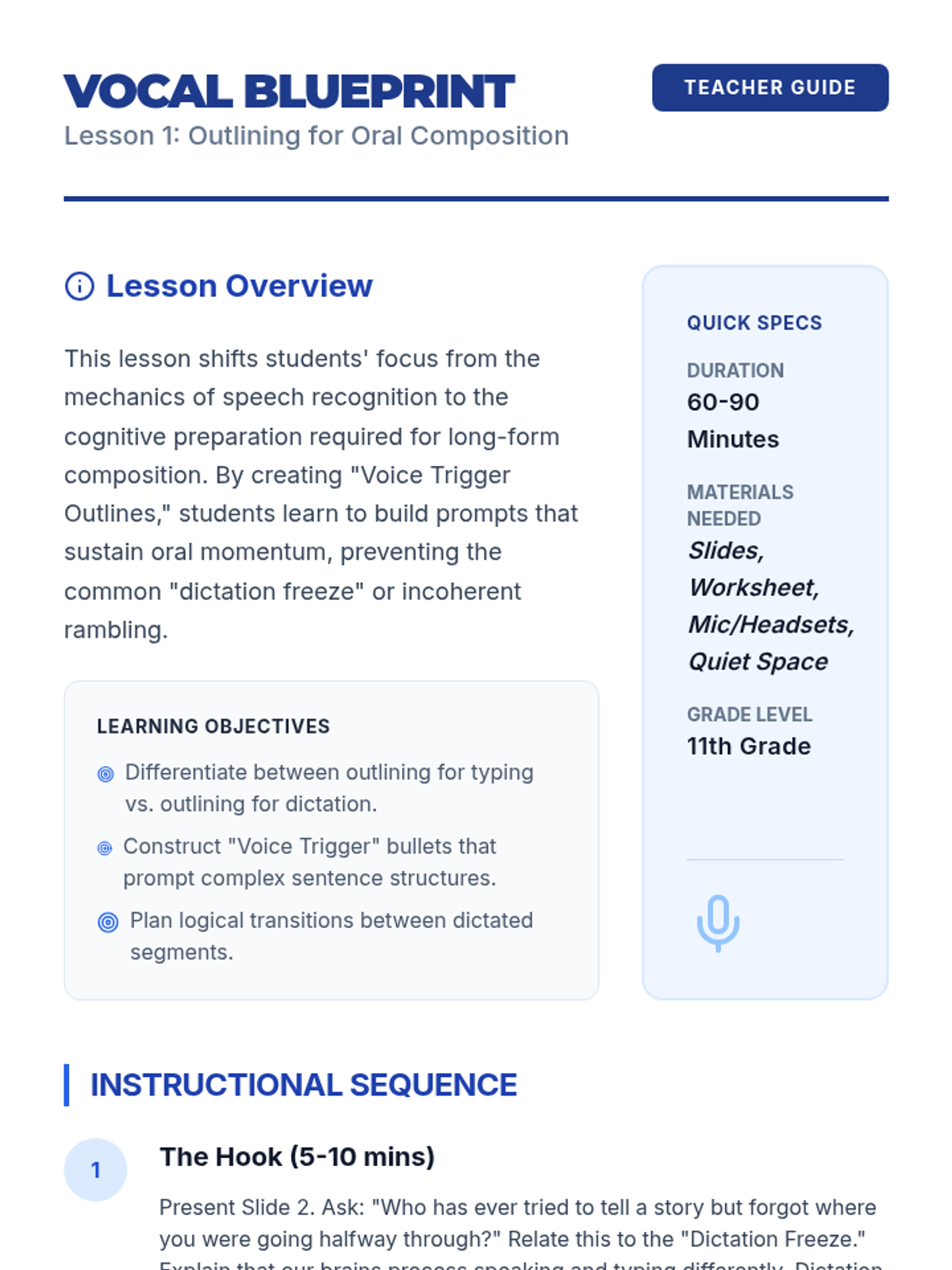 A comprehensive project-based sequence for 11th-grade students to master academic composition using speech recognition technology. Students learn to outline for oral delivery, manage the drafting process, and refine dictated text into professional academic essays.
