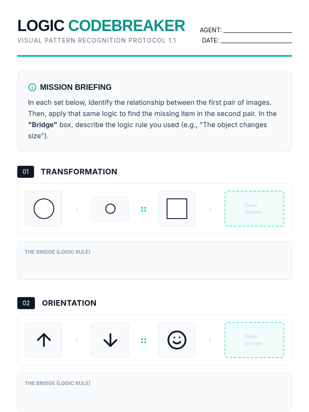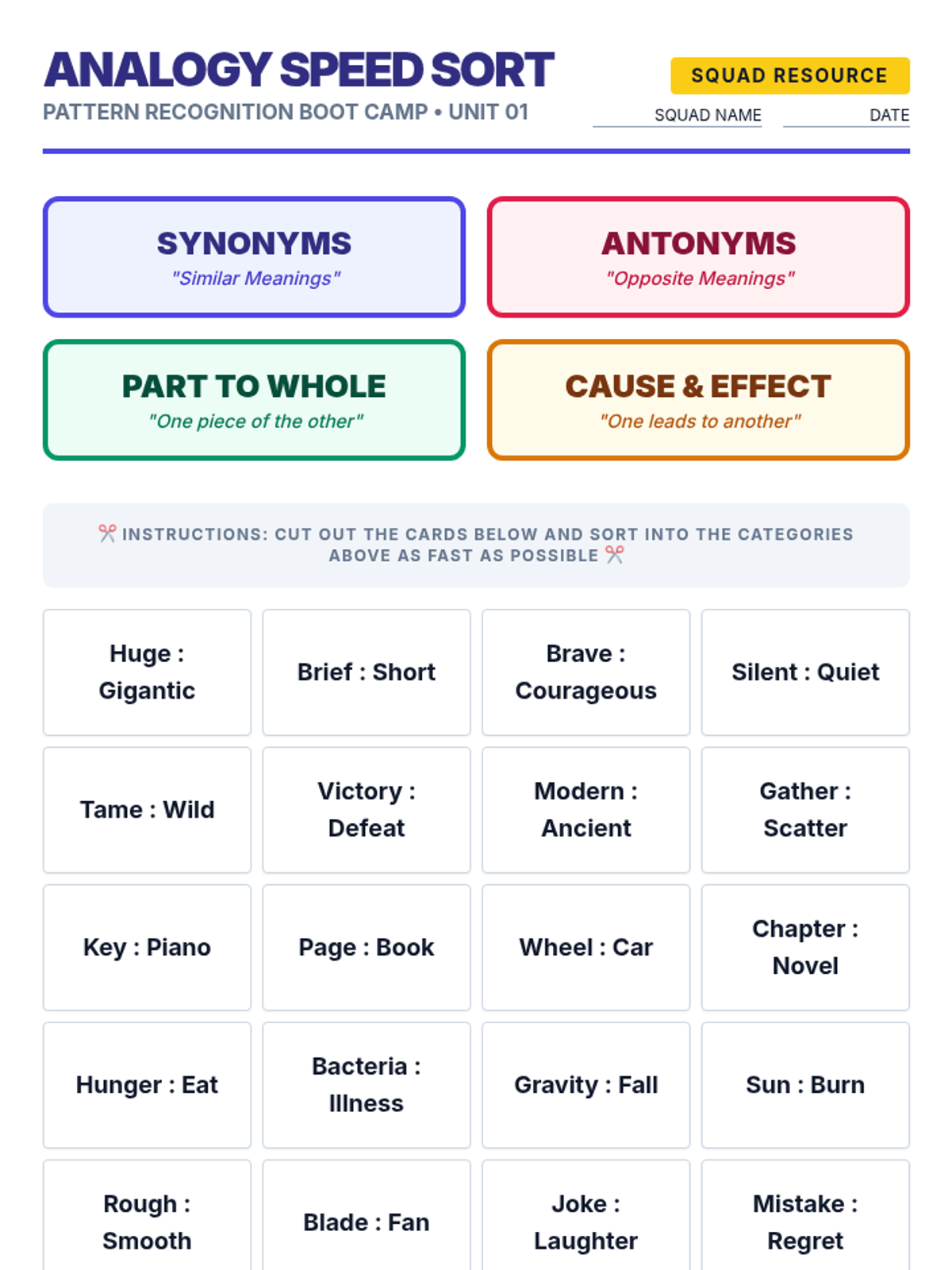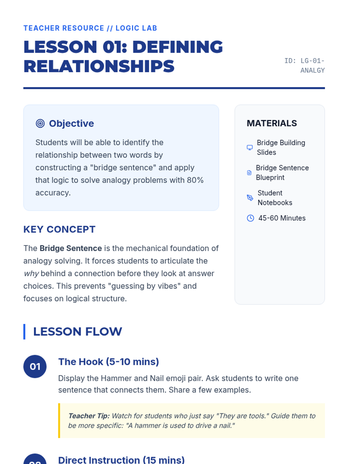 An 8th-grade ELA sequence that transforms analogy instruction into a series of logical puzzles and games. Students move from visual pattern recognition to complex verbal reasoning, learning to identify relationship types and avoid common logical traps.