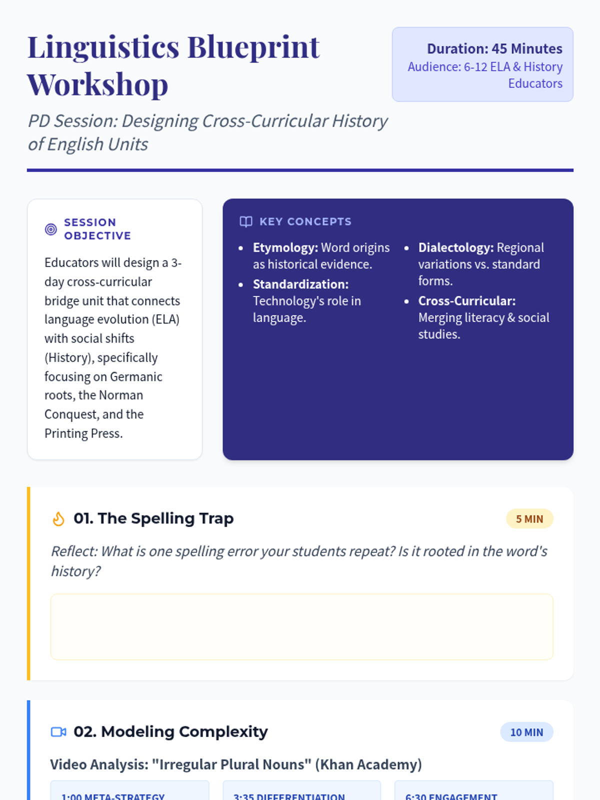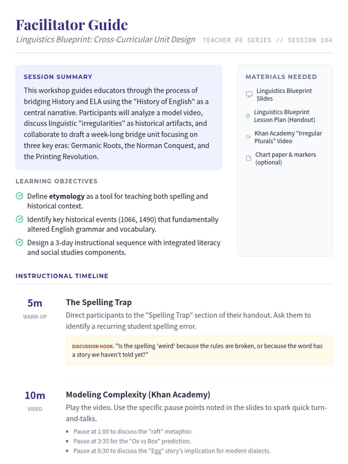 A curriculum development sequence focused on helping teachers bridge ELA and History through linguistics and etymology.
