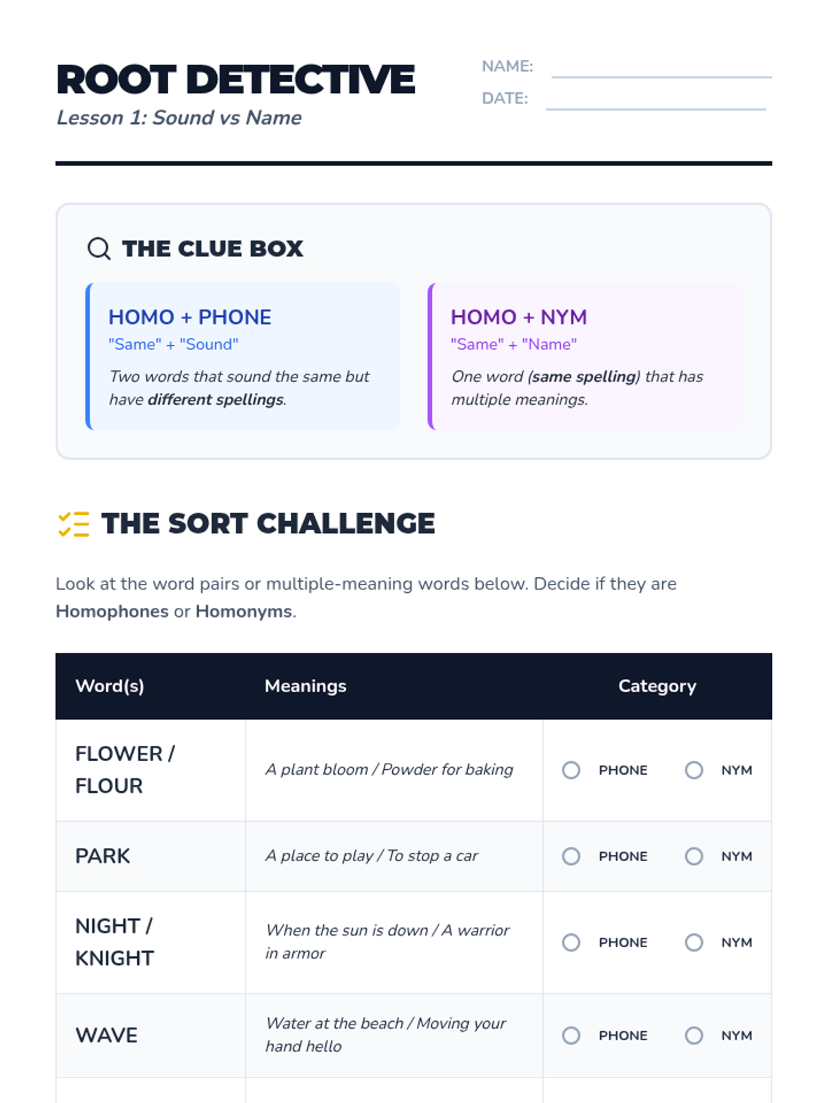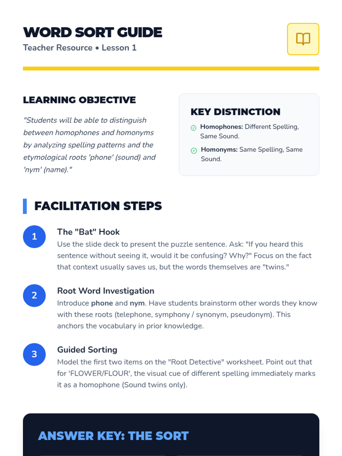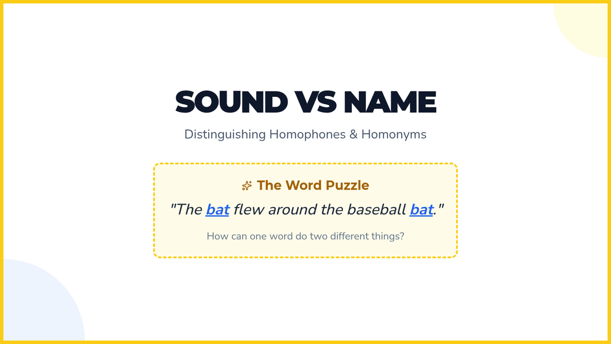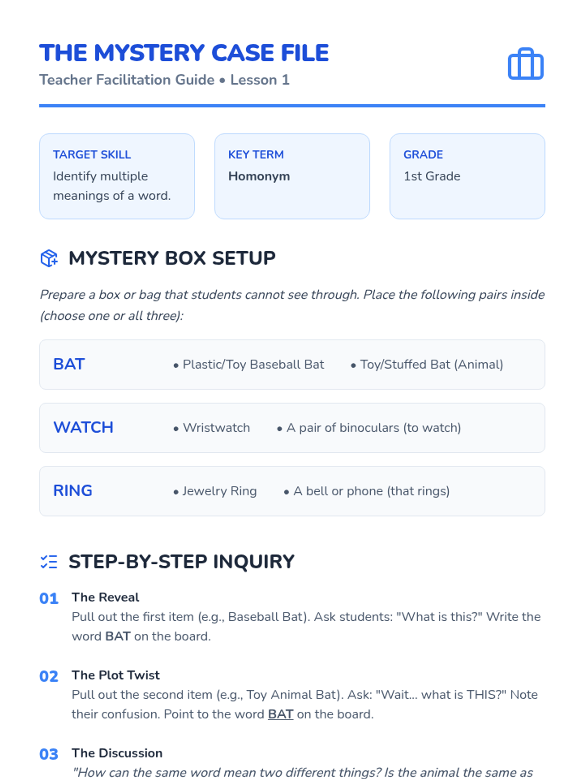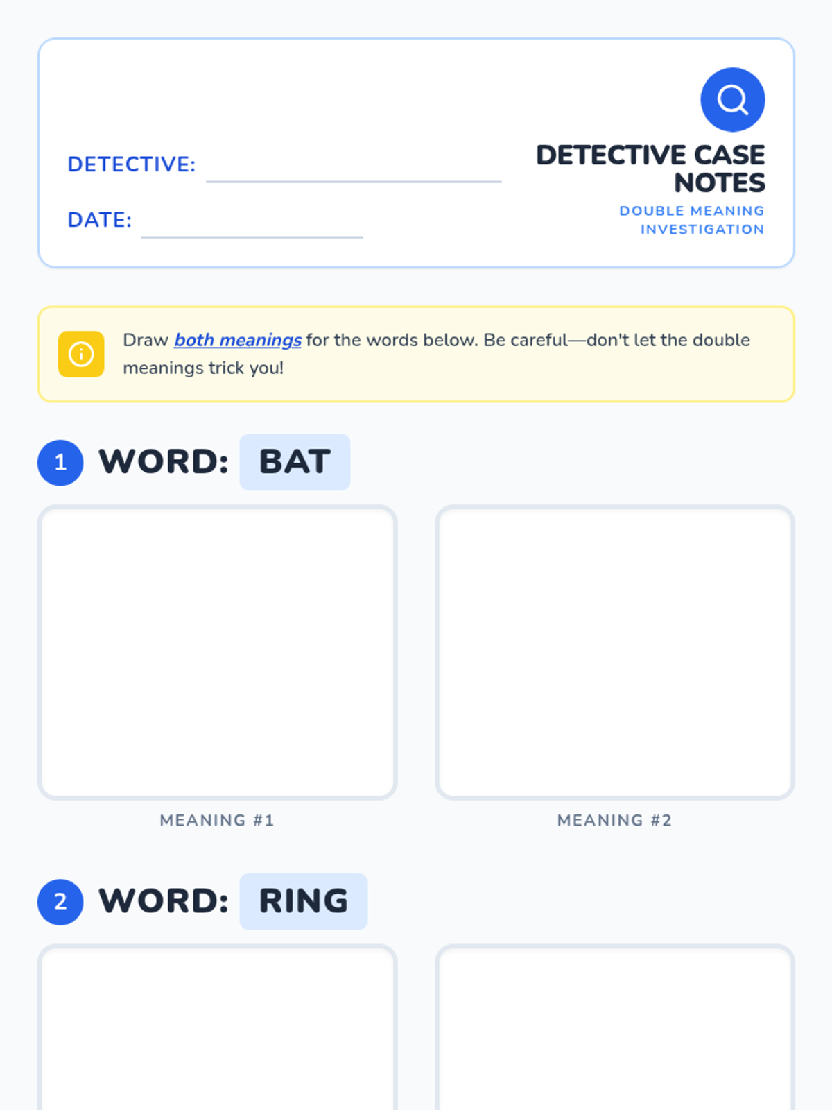 This sequence explores multiple-meaning words (homonyms) to strengthen reading comprehension and vocabulary flexibility. Students adopt the role of 'word detectives' to investigate how a single word like 'bat' or 'bark' can represent entirely different things depending on the sentence.