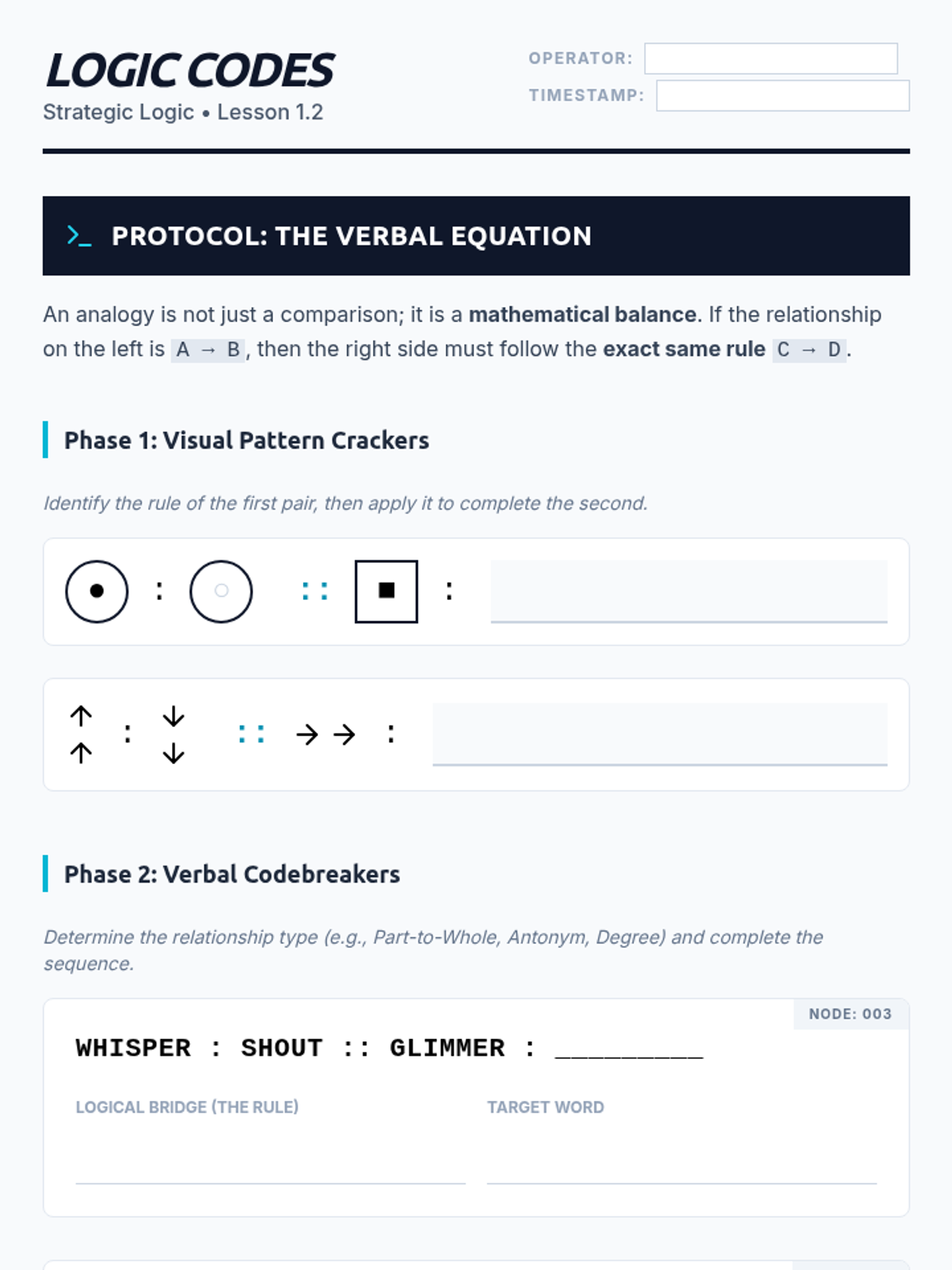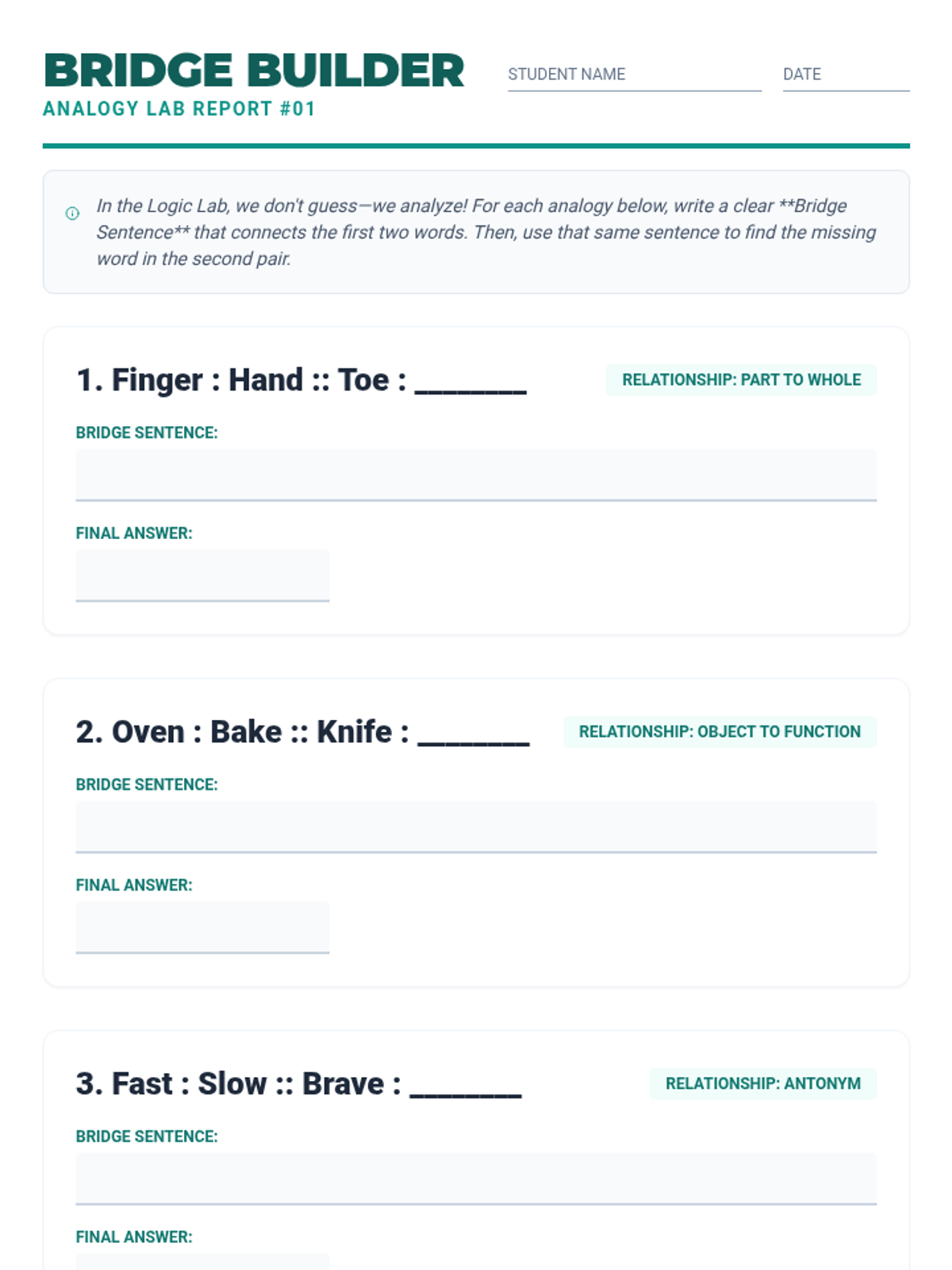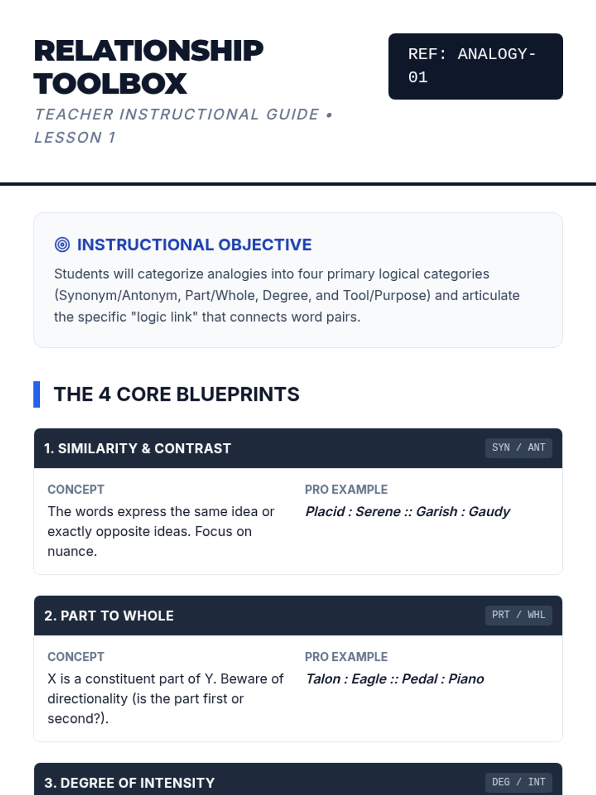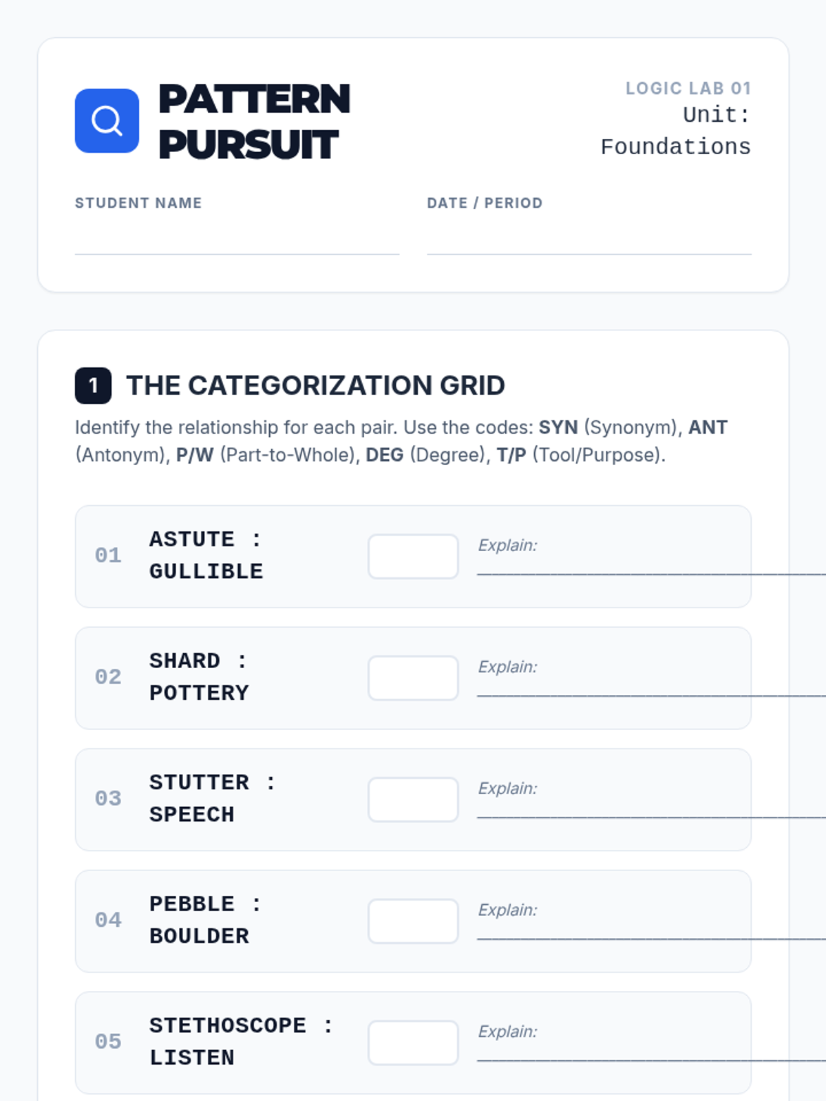 A high-intensity vocabulary sequence for 10th graders focusing on the logic of analogies. Students progress from basic pattern recognition to designing their own complex logic puzzles, treating language as a series of solvable equations.