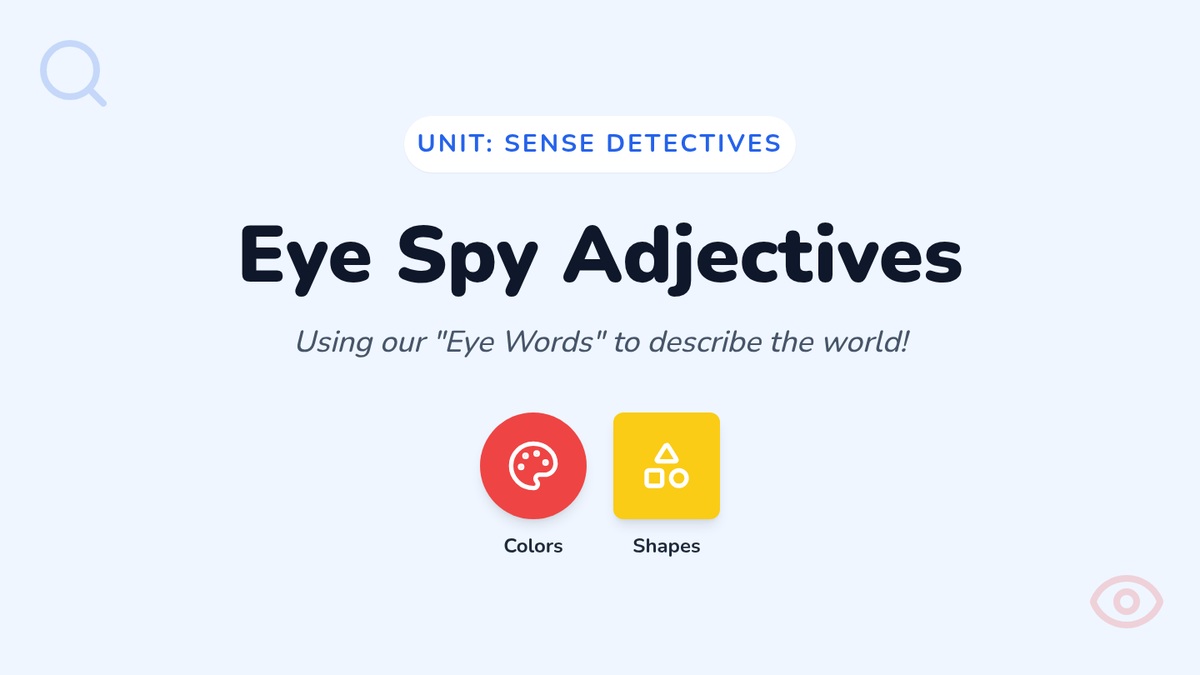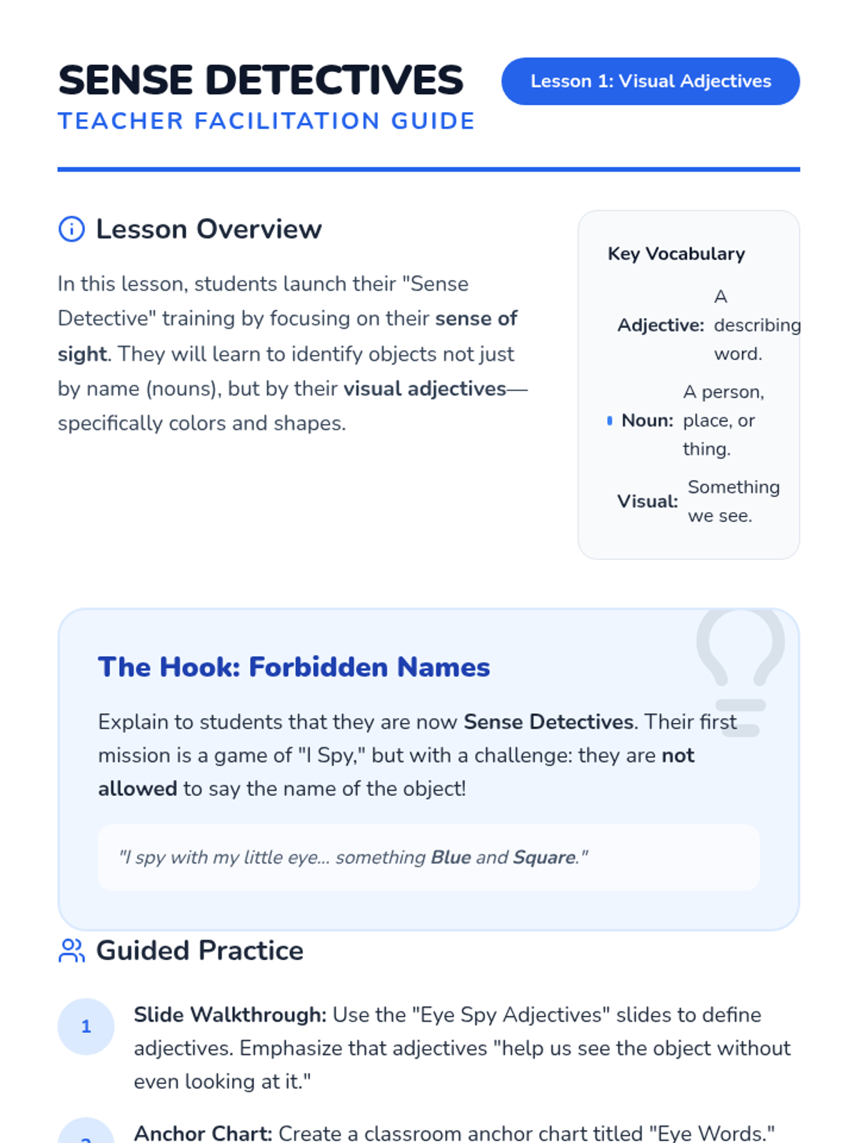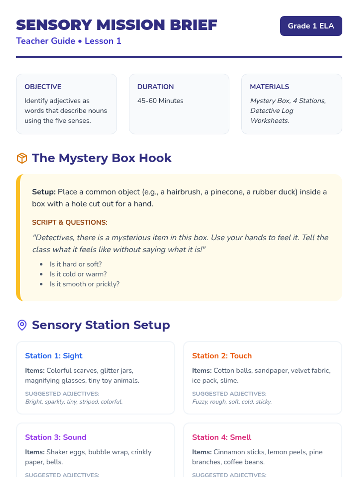 A foundational grammar sequence for first graders that uses a 'Word Detective' theme to explore adjectives through sensory exploration, sorting, and descriptive writing. Students learn to use their five senses to identify and apply adjectives to describe the world around them.