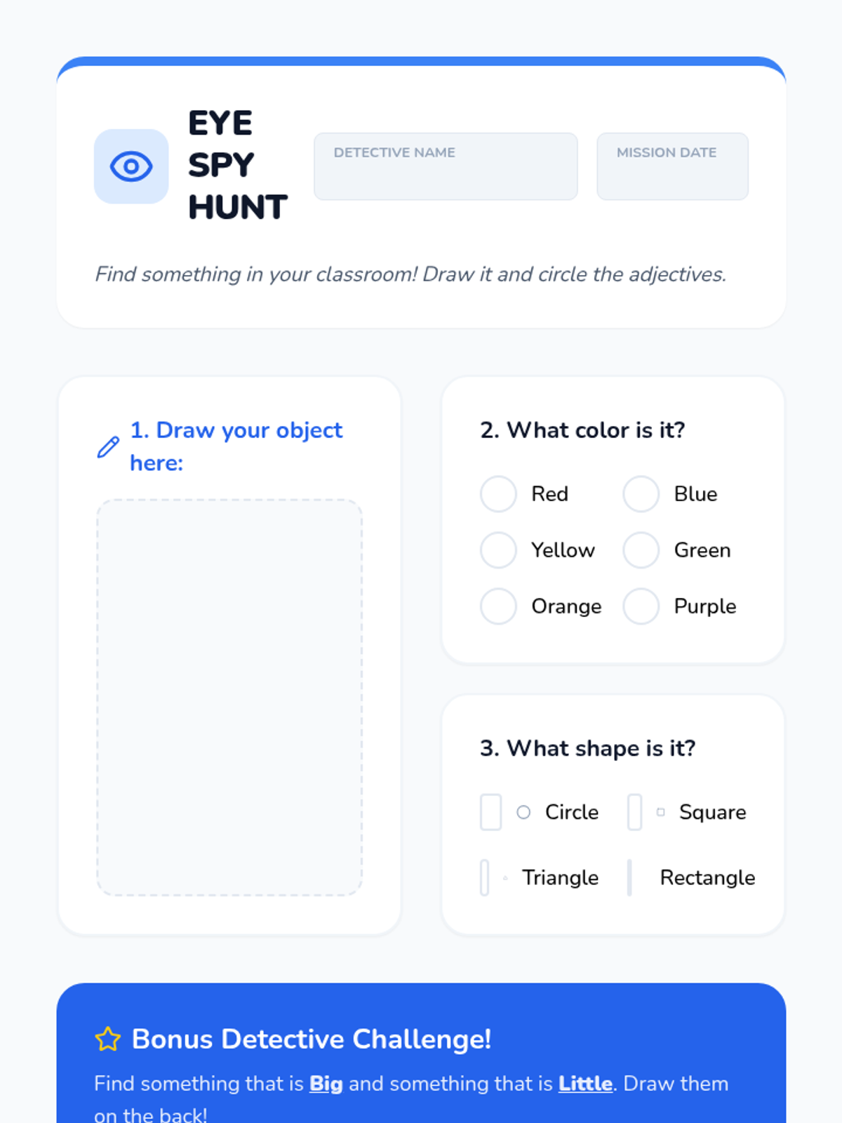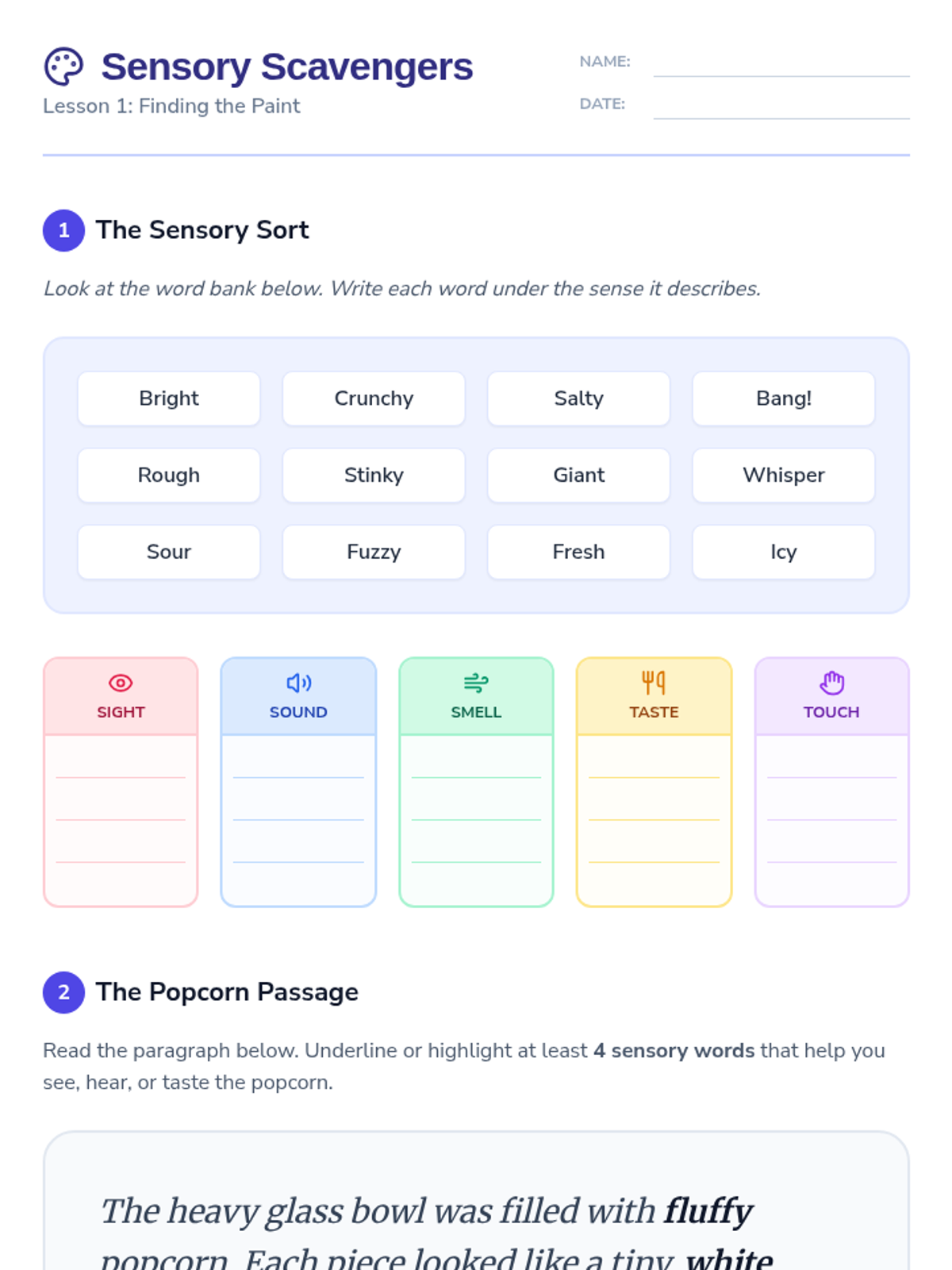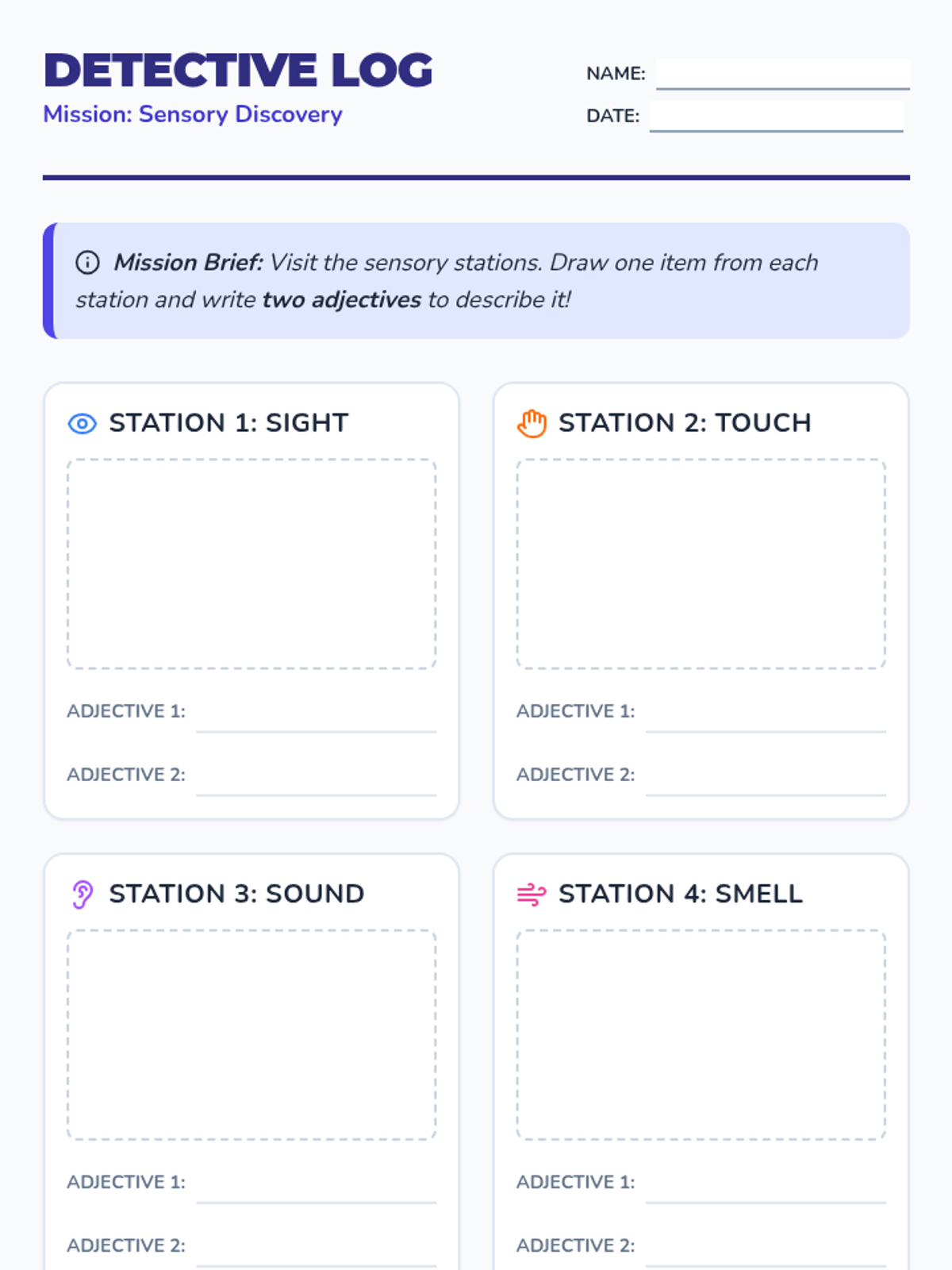A foundational grammar sequence for first graders that uses a 'Word Detective' theme to explore adjectives through sensory exploration, sorting, and descriptive writing. Students learn to use their five senses to identify and apply adjectives to describe the world around them.