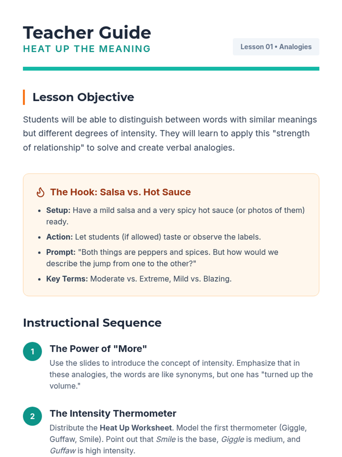 A 5-lesson sequence for 7th grade students focusing on advanced analogy relationships, specifically degrees of intensity and cause-effect logic. Students will learn to analyze nuances, distinguish between causal and sequential relationships, and debate the precision of word choices.