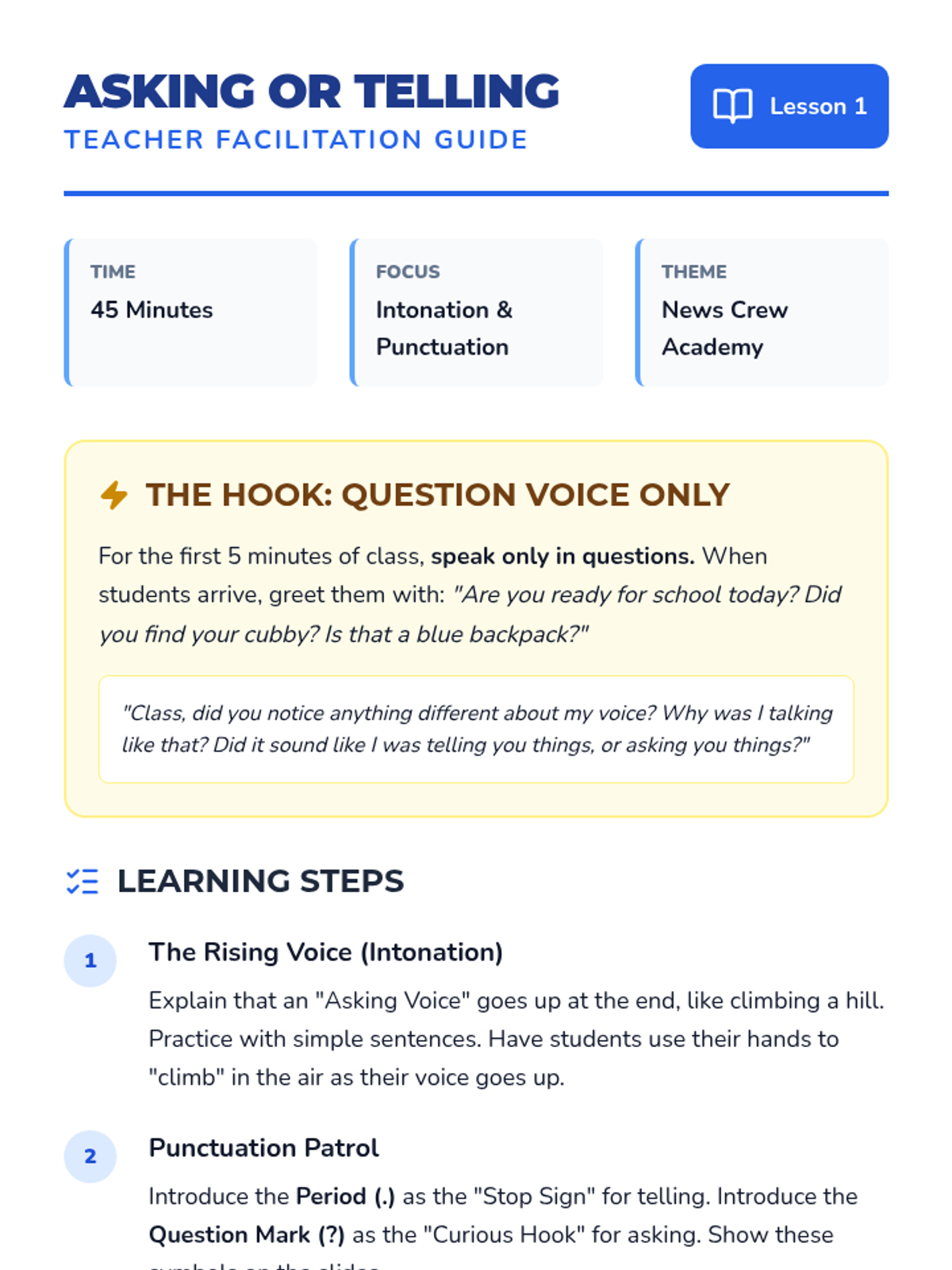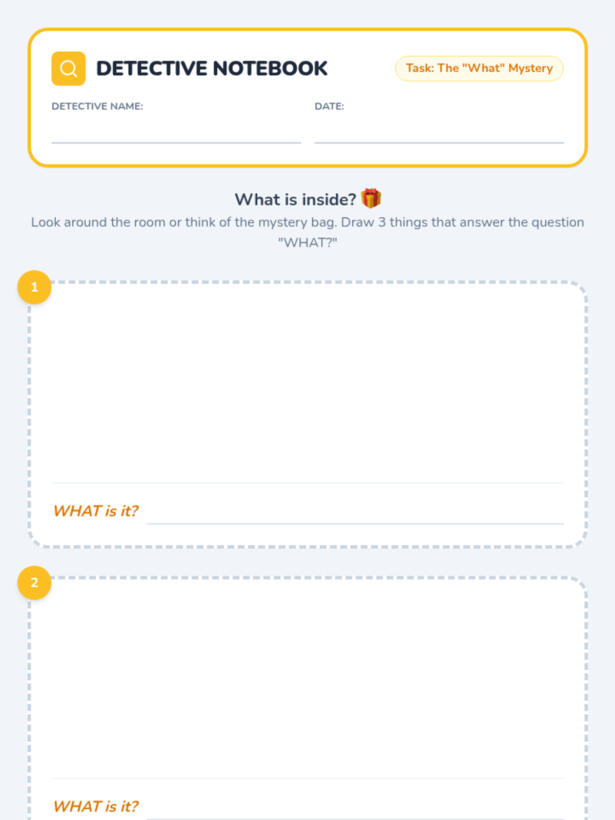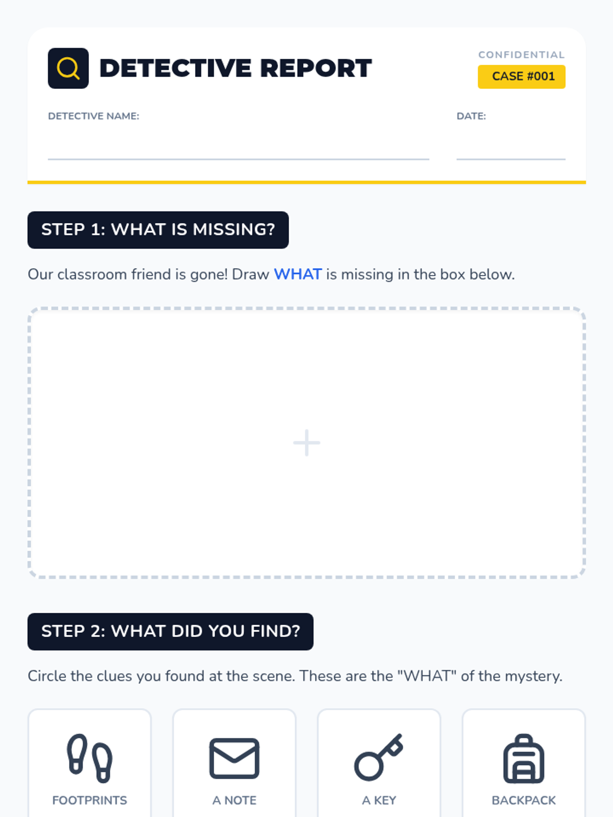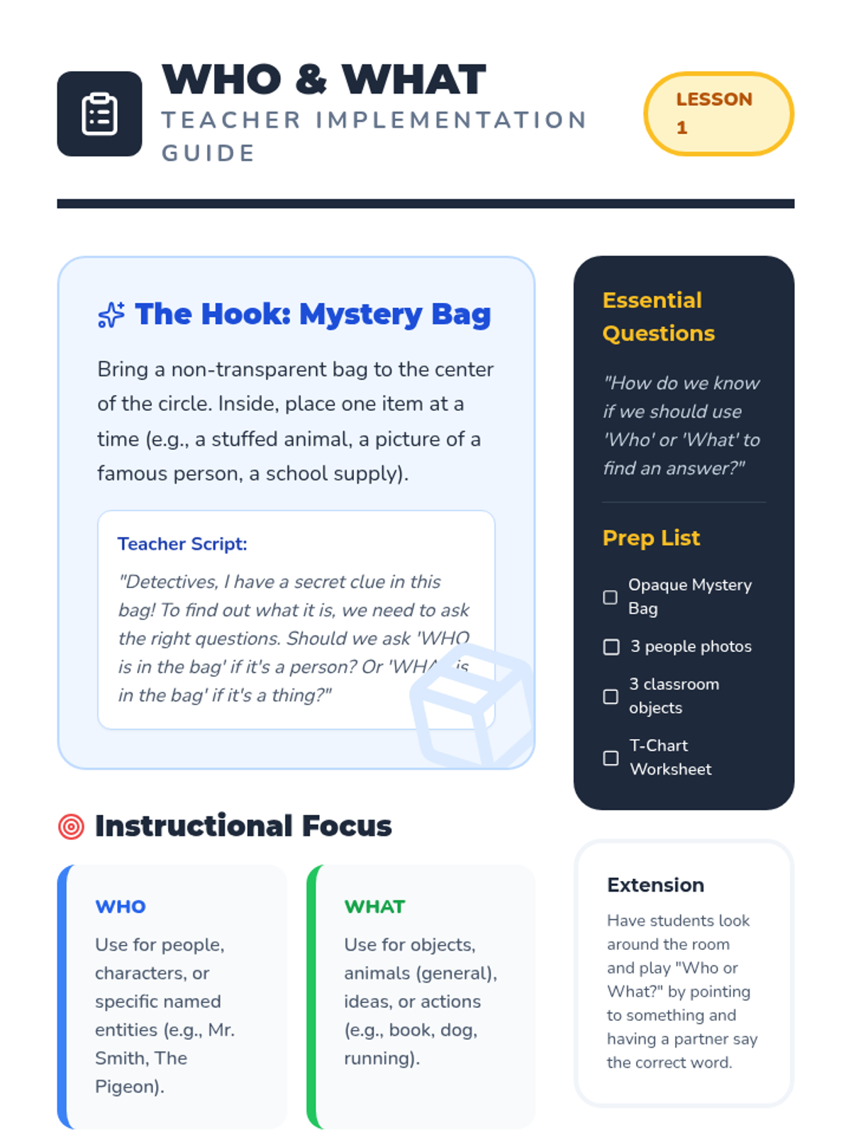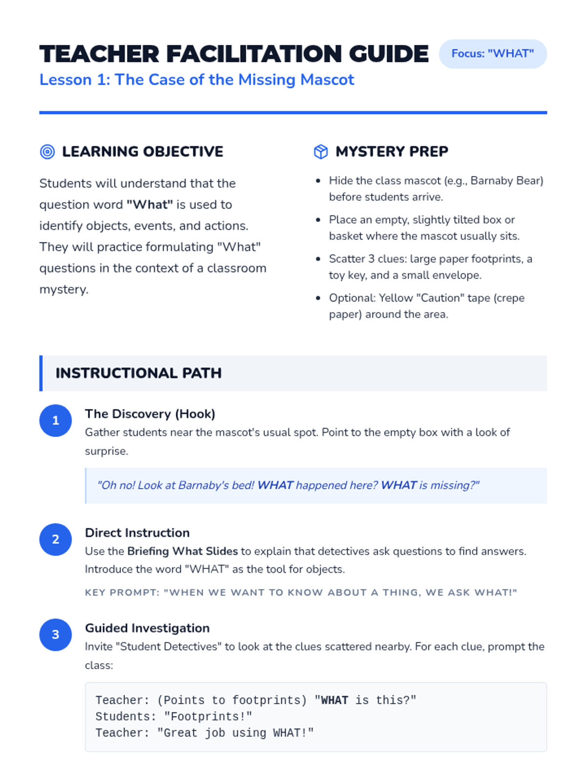 A fun, inquiry-based ELA sequence for Pre-K students that uses a classroom mystery to teach the four primary question words: Who, What, Where, and When. Students act as detectives to find a missing class mascot while mastering interrogative vocabulary.