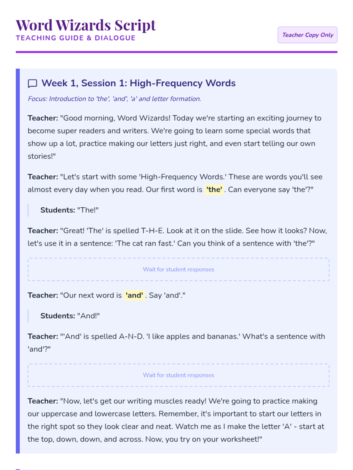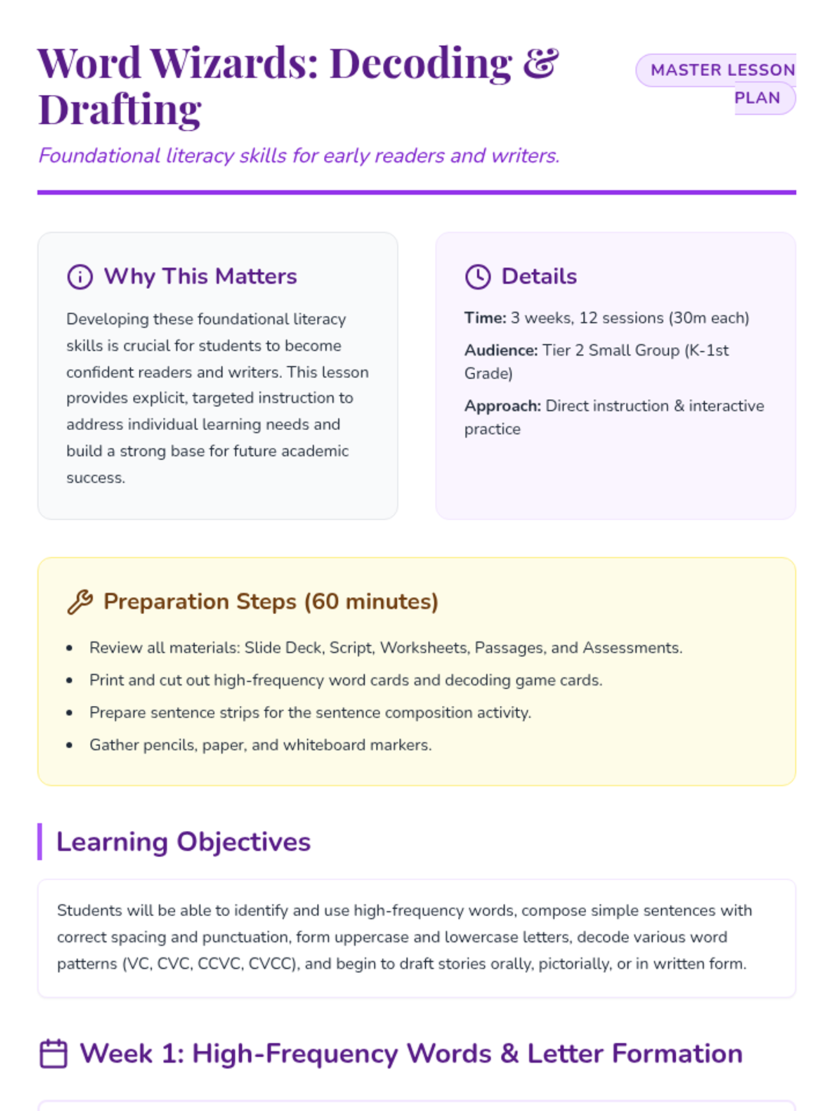 A 3-week foundational literacy sequence for Tier 2 Kindergarten and 1st-grade students, focusing on high-frequency words, decoding, and early drafting skills.