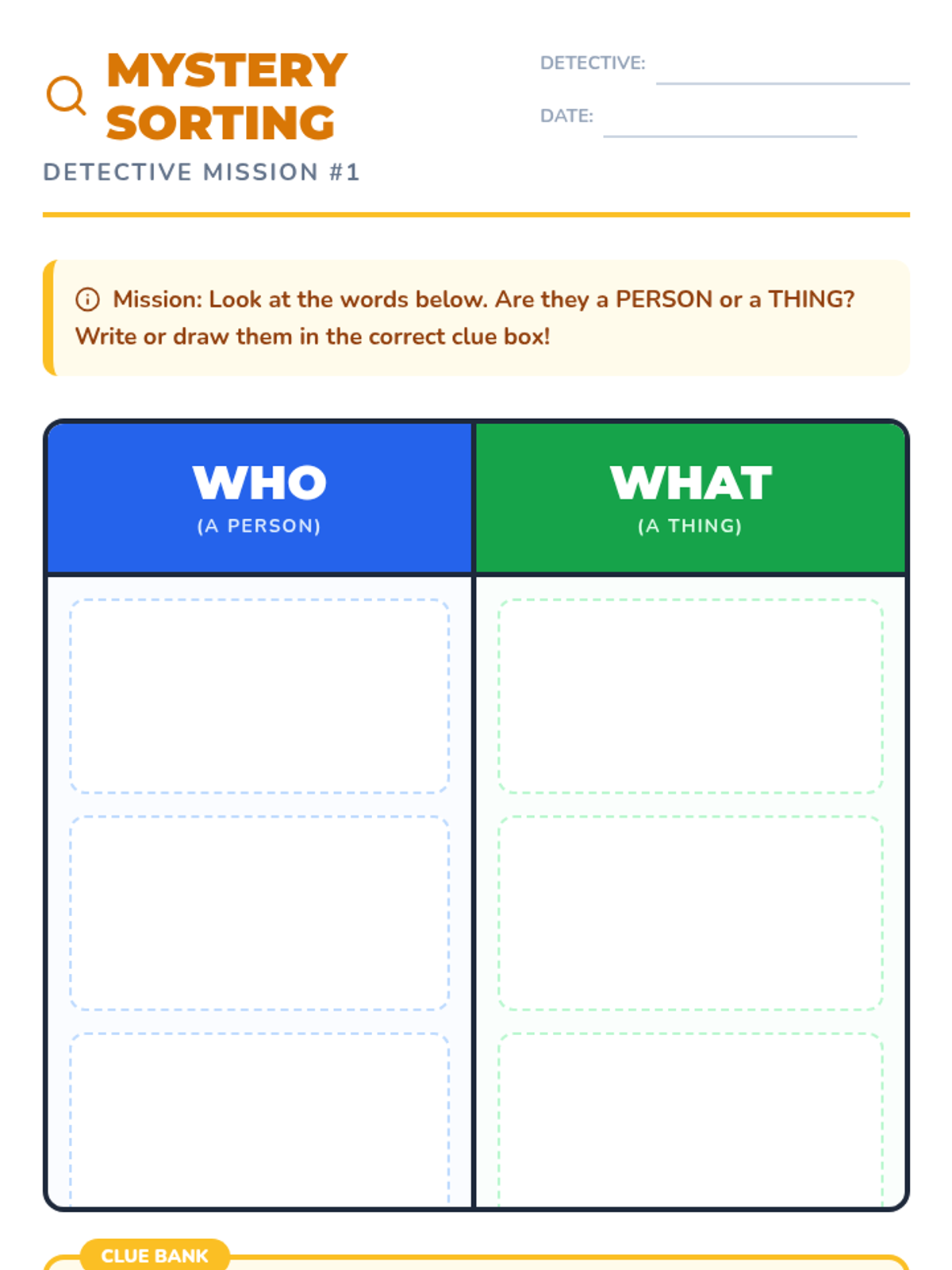 This Kindergarten ELA sequence introduces the question words 'who,' 'what,' and 'where' through a detective-themed investigative approach. Students will learn to distinguish between people, objects, and places, ultimately applying these skills to gather information as 'Classroom Reporters.'