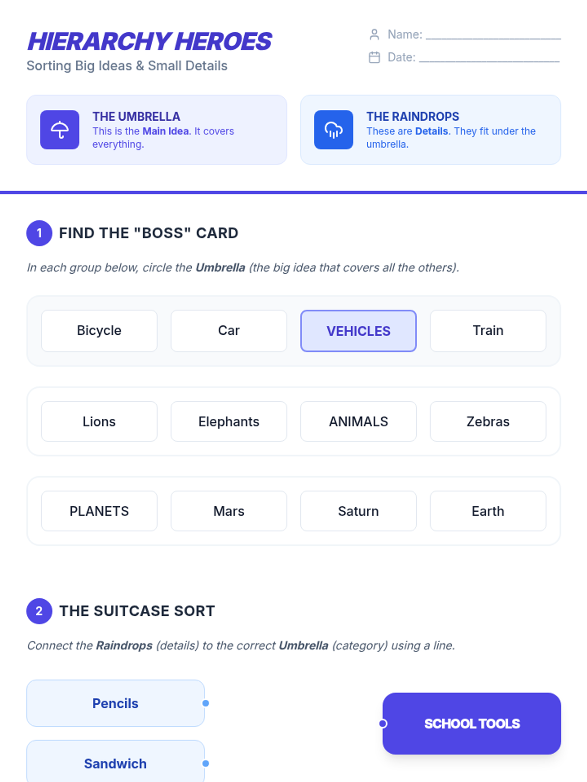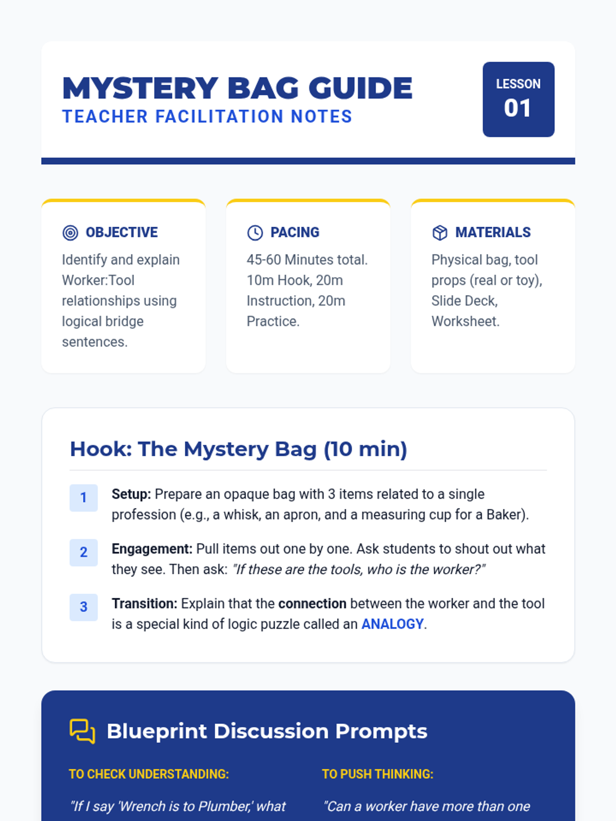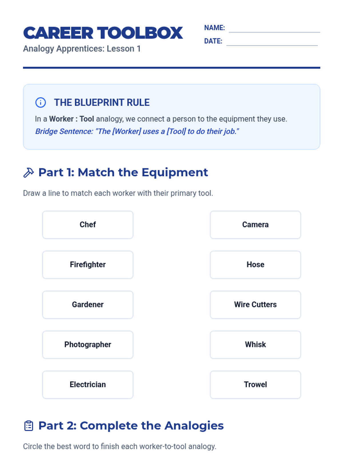 This sequence explores functional relationships in analogies, focusing on how workers, tools, objects, and actions connect logically. Students will develop career vocabulary and functional analysis skills through a 'Logic Workshop' theme.