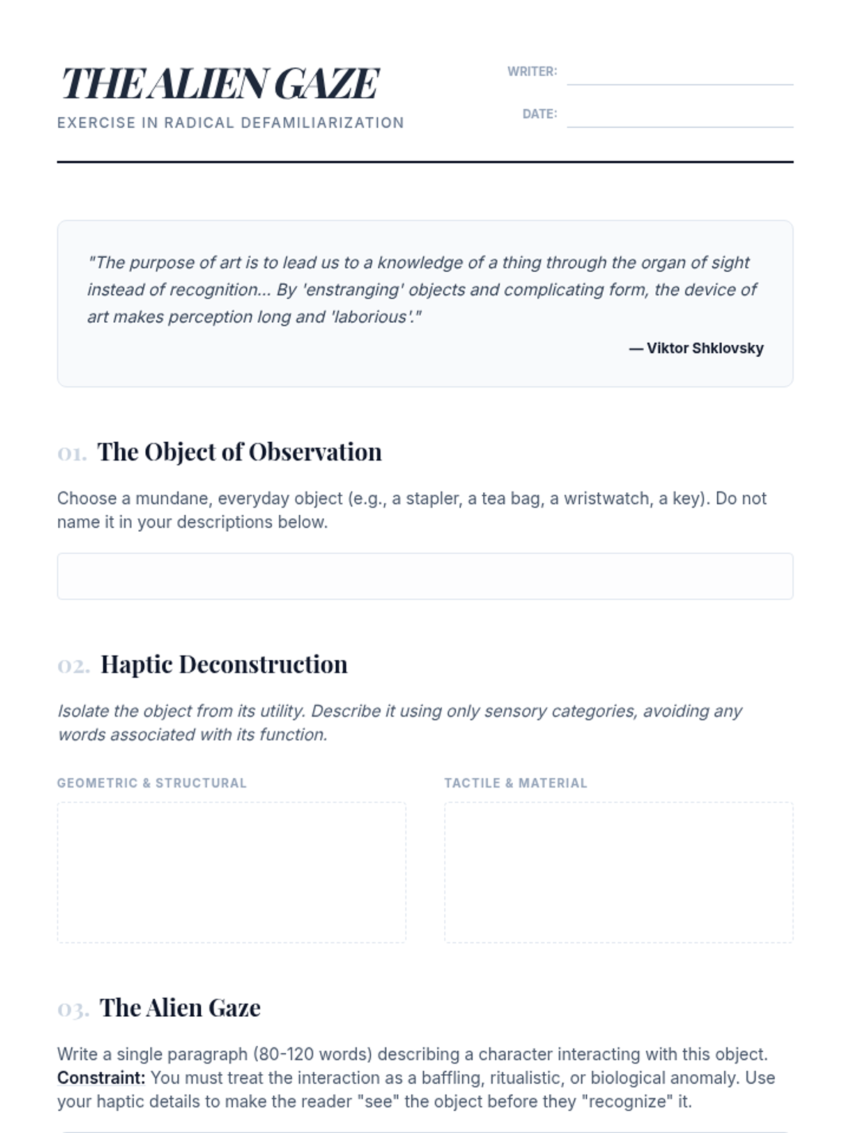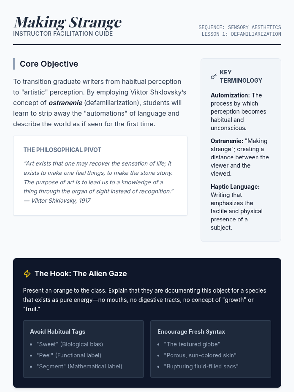 An advanced creative writing sequence for graduate students exploring the intersection of sensory perception, linguistic texture, and emotional resonance through the lens of literary theory and craft.