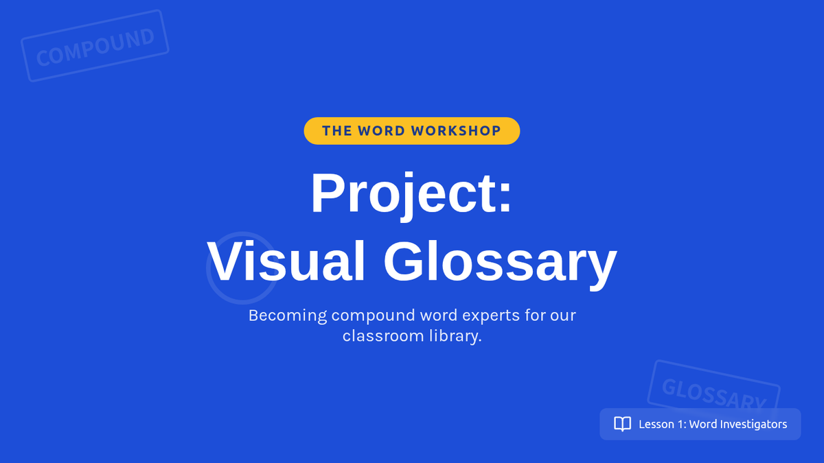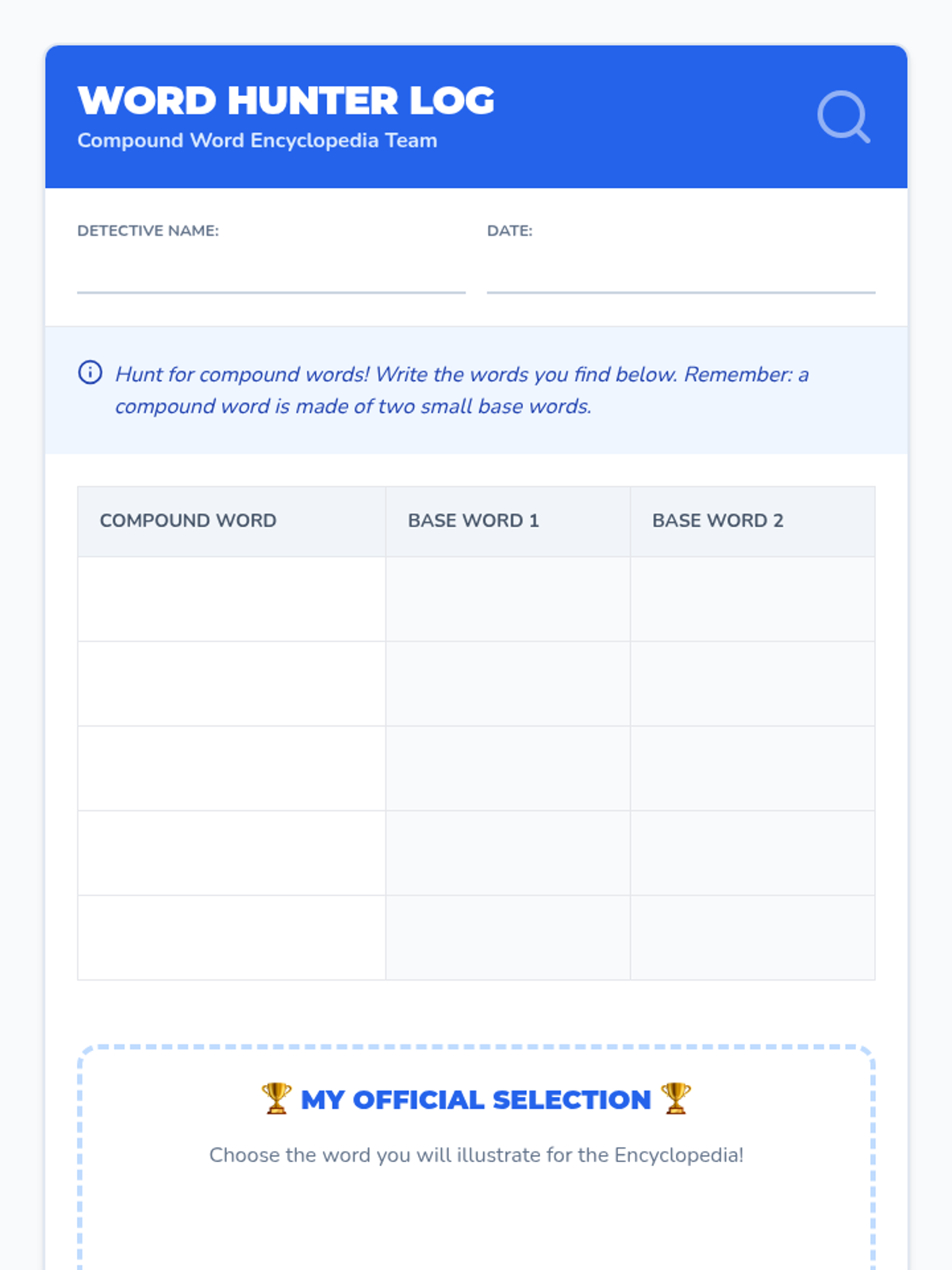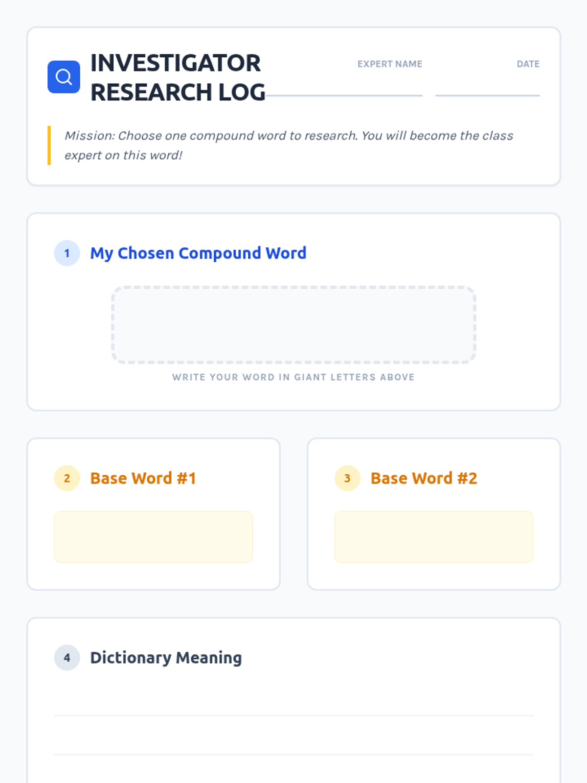 A project-based unit where 2nd-grade students create a 'Visual Glossary of Compound Words'. Students research, illustrate, and define compound terms to publish a collaborative book for their classroom library, focusing on word structure and visual communication.
