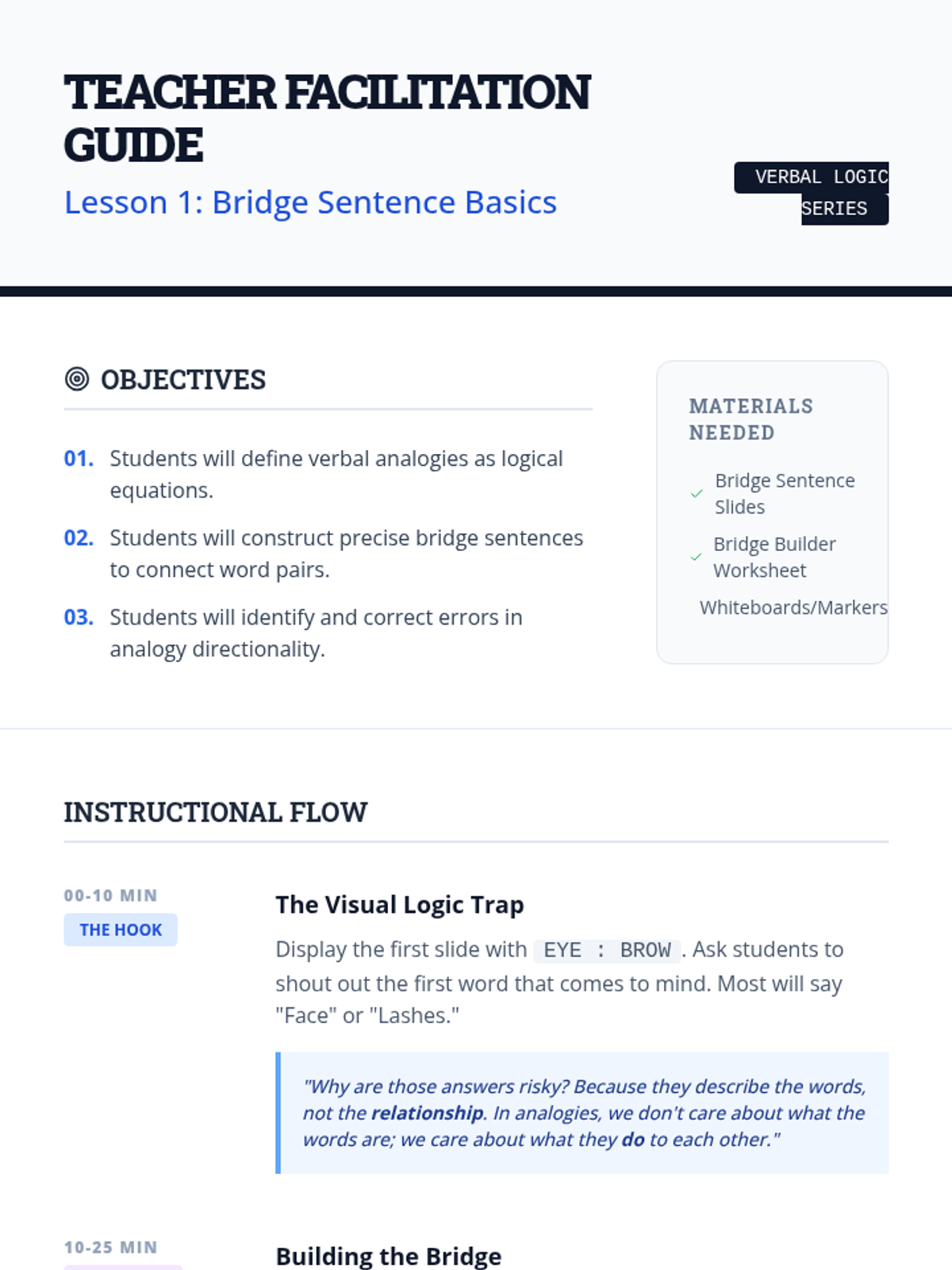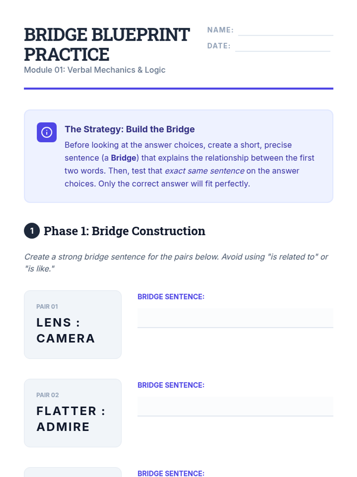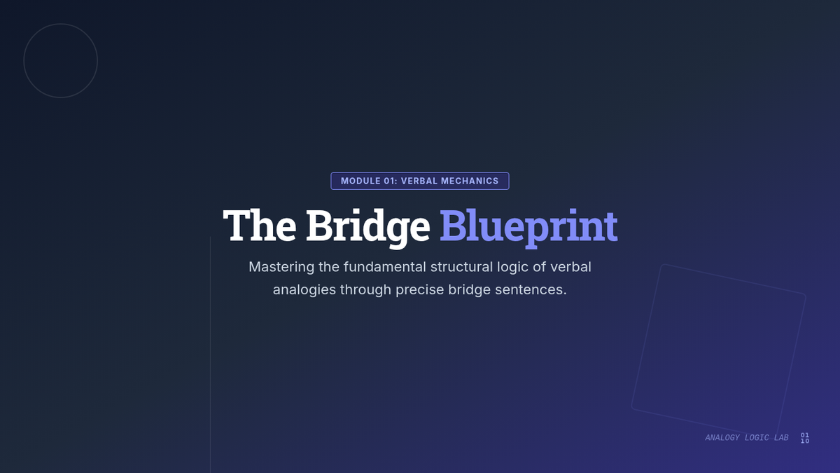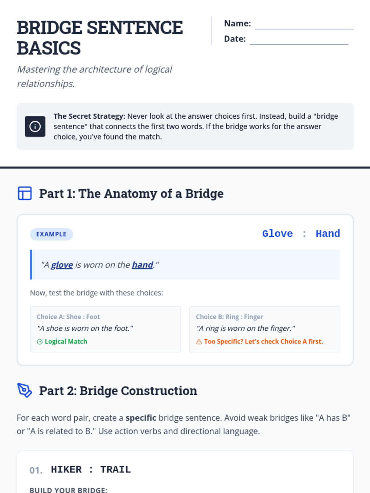 A high-level sequence for 11th-grade students focusing on the mechanics of solving verbal analogies through bridge sentences, degree analysis, abstract associations, and test-taking strategies. Students will develop the ability to decode complex vocabulary relationships using systematic logical frameworks.