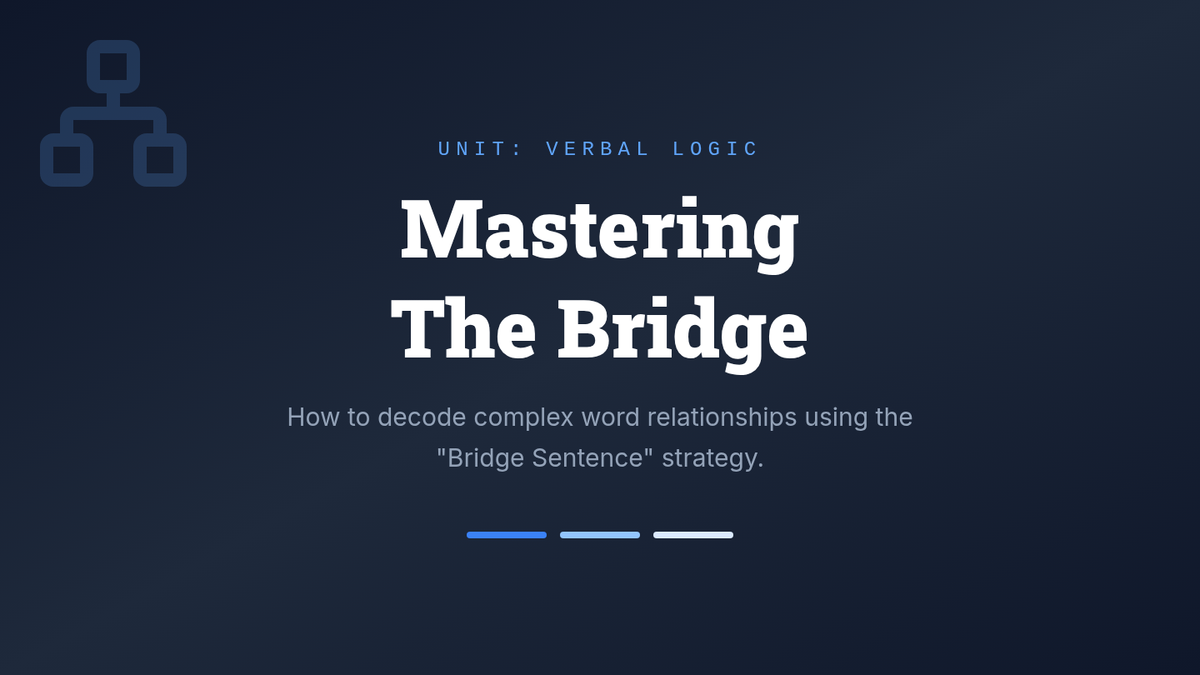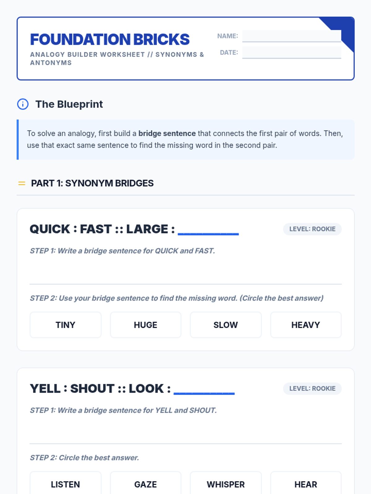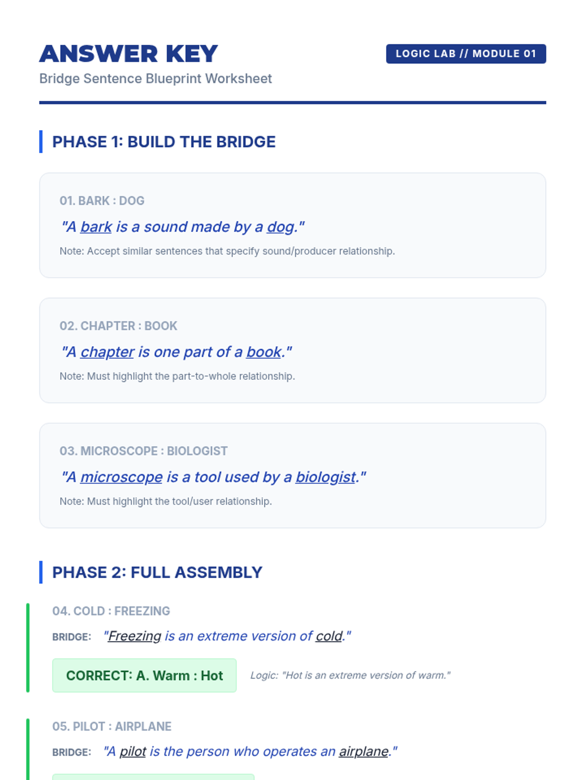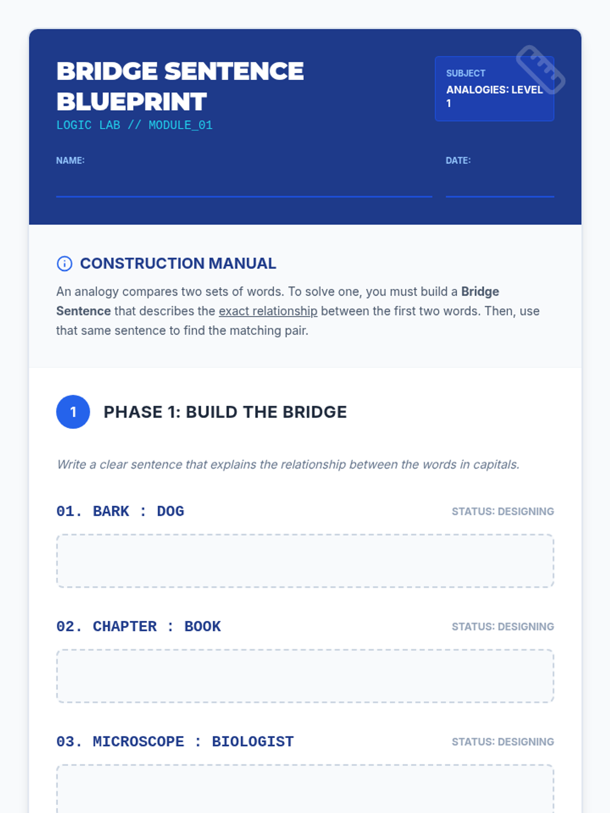 A high-level sequence for 11th-grade students focusing on the mechanics of solving verbal analogies through bridge sentences, degree analysis, abstract associations, and test-taking strategies. Students will develop the ability to decode complex vocabulary relationships using systematic logical frameworks.