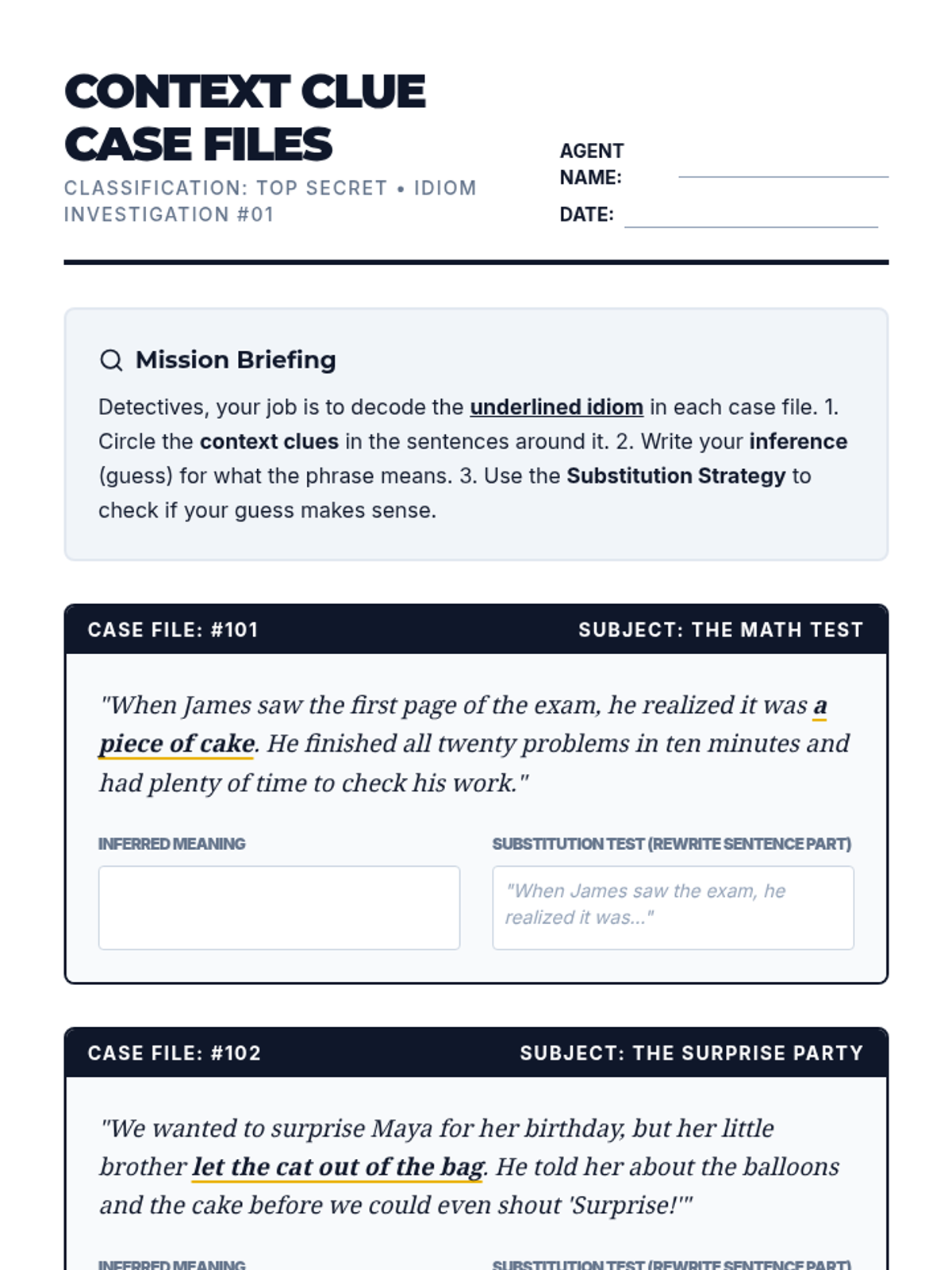 A 5-lesson 4th Grade ELA unit where students become 'Idiom Investigators,' using context clues to decipher figurative language in narrative texts through inquiry and writing workshops.