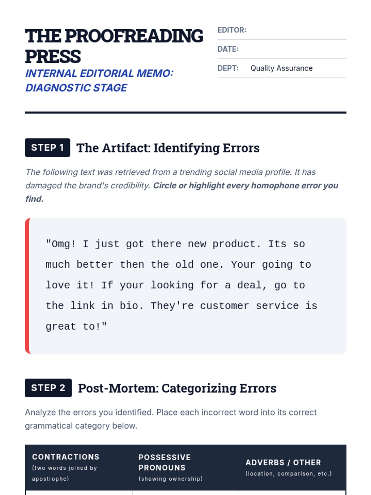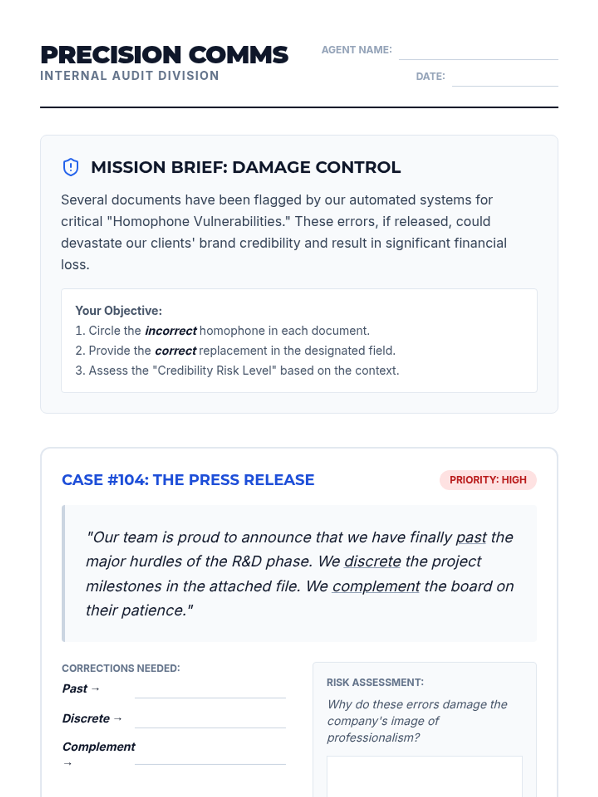 A simulation-based sequence where students act as communications professionals, exploring the real-world impact of homophone accuracy in business and digital environments. Students master common homophones while developing professional writing skills and audience awareness.