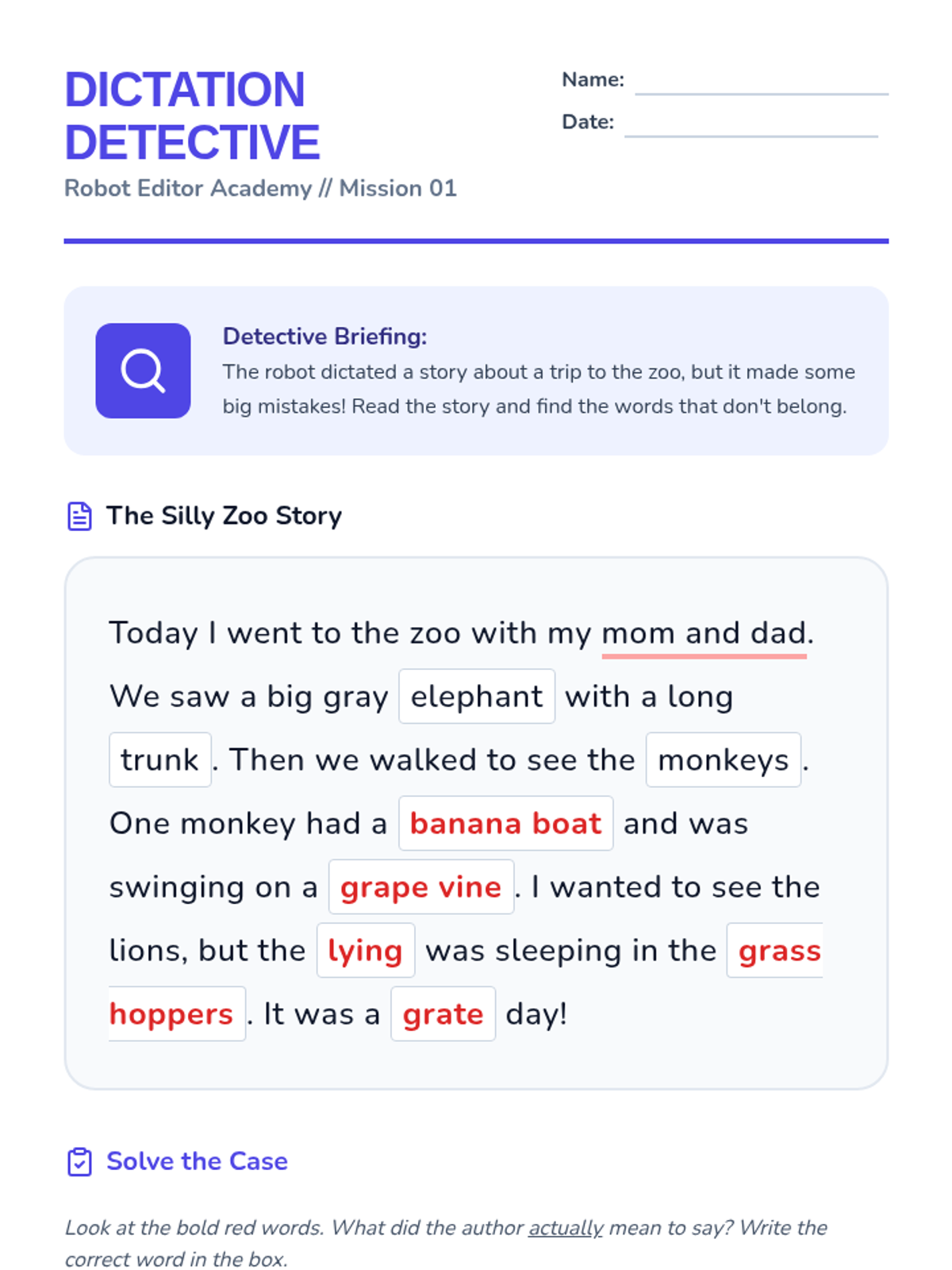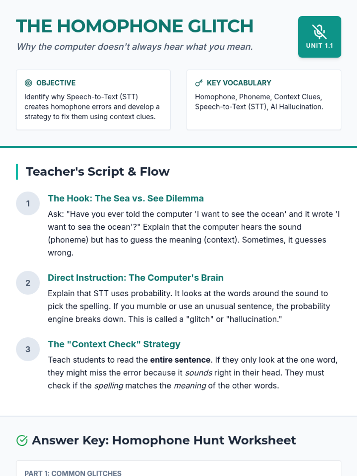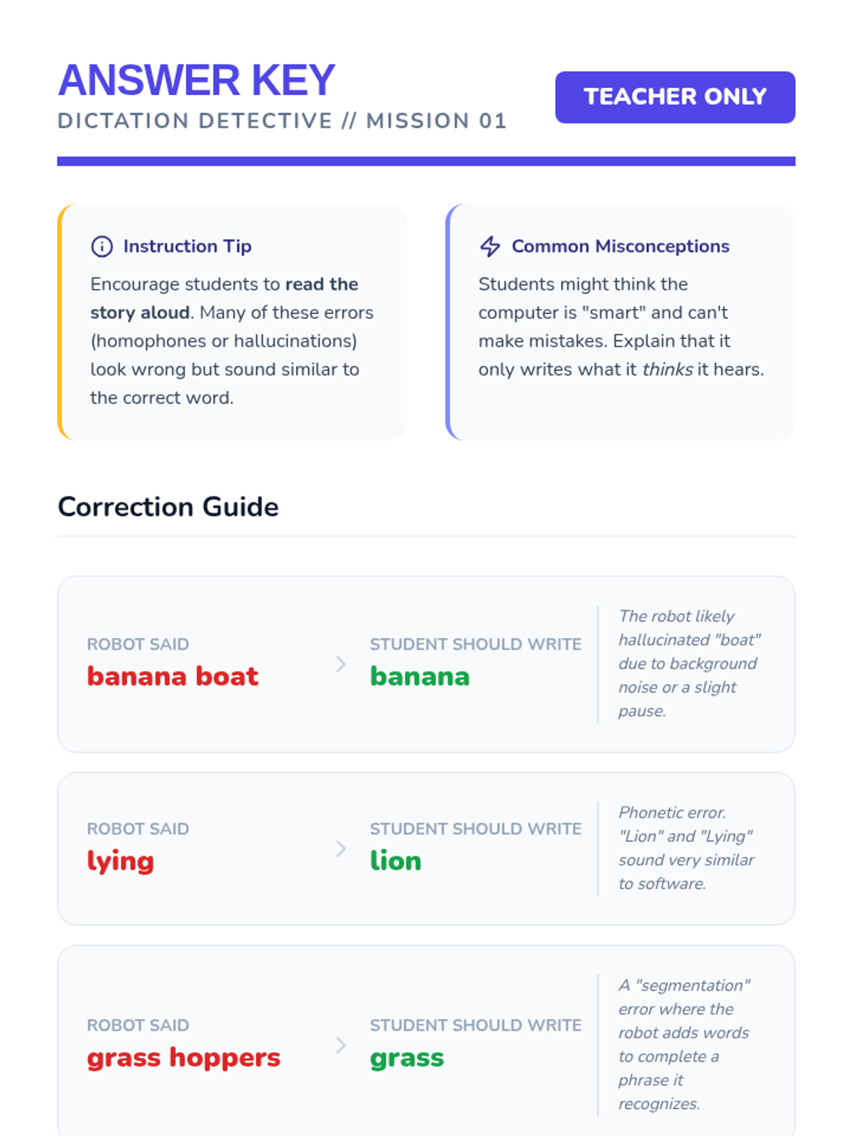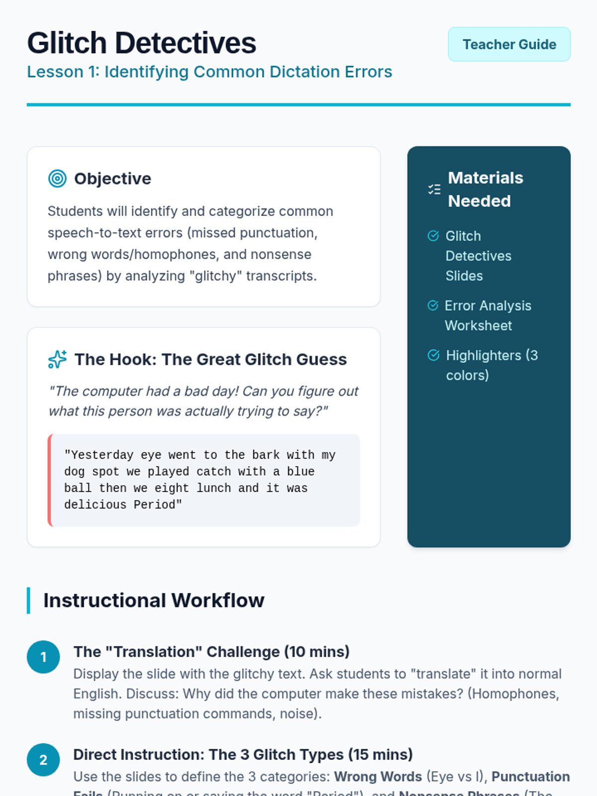 A 5-lesson unit for 3rd graders on identifying and correcting speech-to-text recognition errors. Students learn to spot homophones, enunciation errors, missing words, and context-based mistakes to become expert editors of their own dictated work.