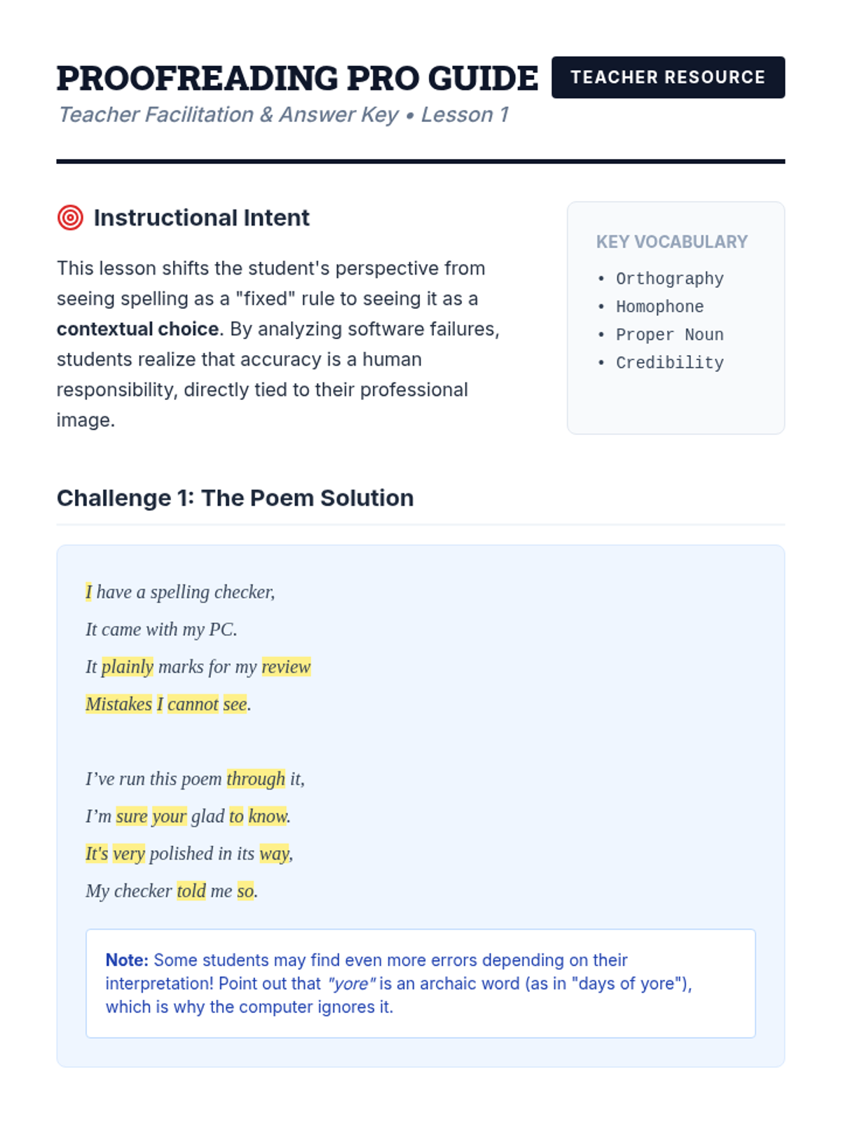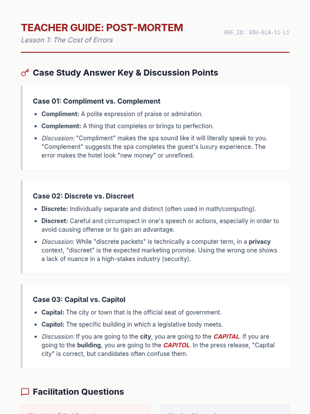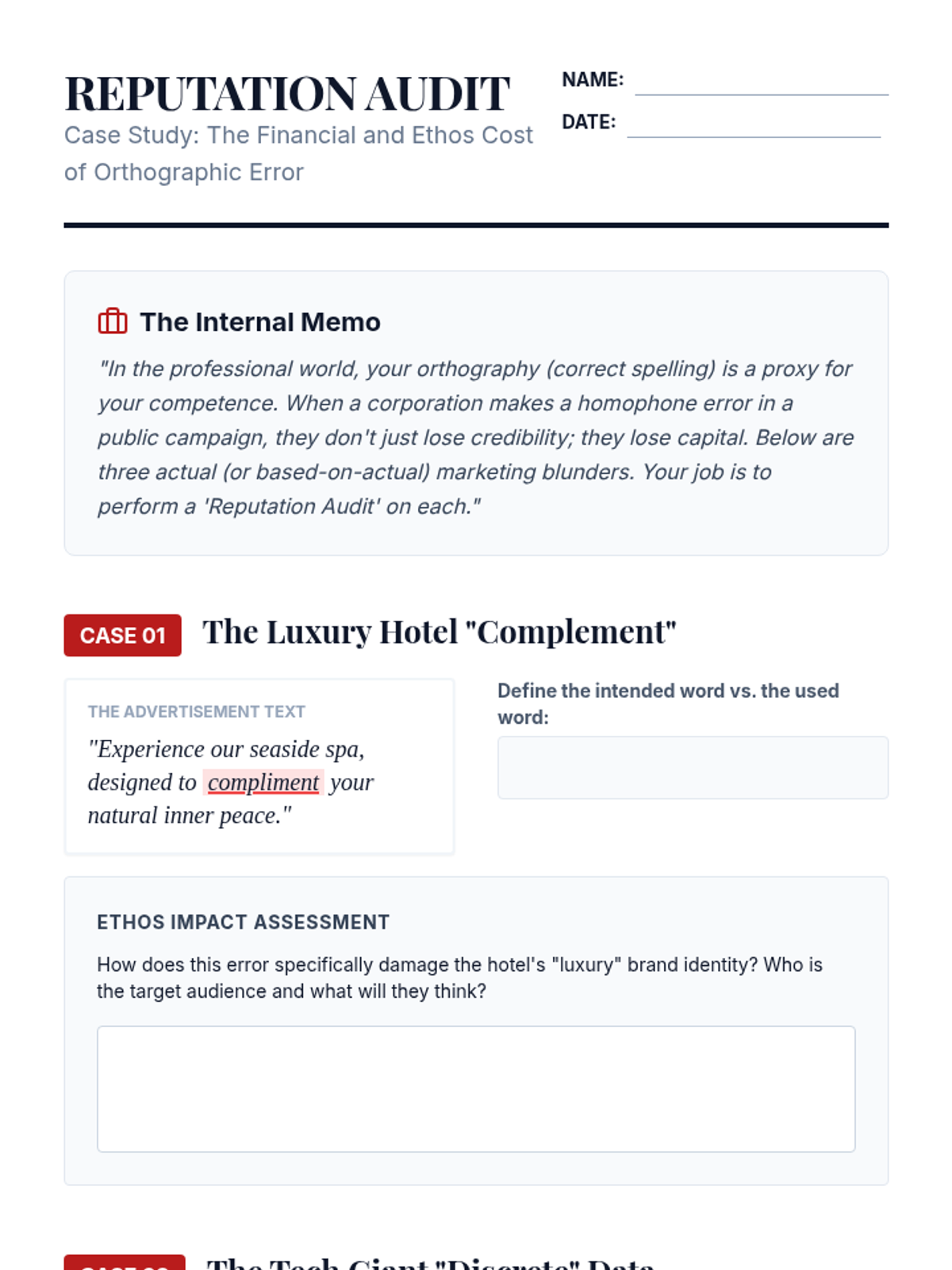 This sequence explores the professional impact of homophone errors, teaching 11th-grade students that orthographic precision is a key component of rhetorical ethos and professional credibility. Students analyze corporate case studies, master advanced confusables, and simulate the work of senior copy editors using professional style guides.