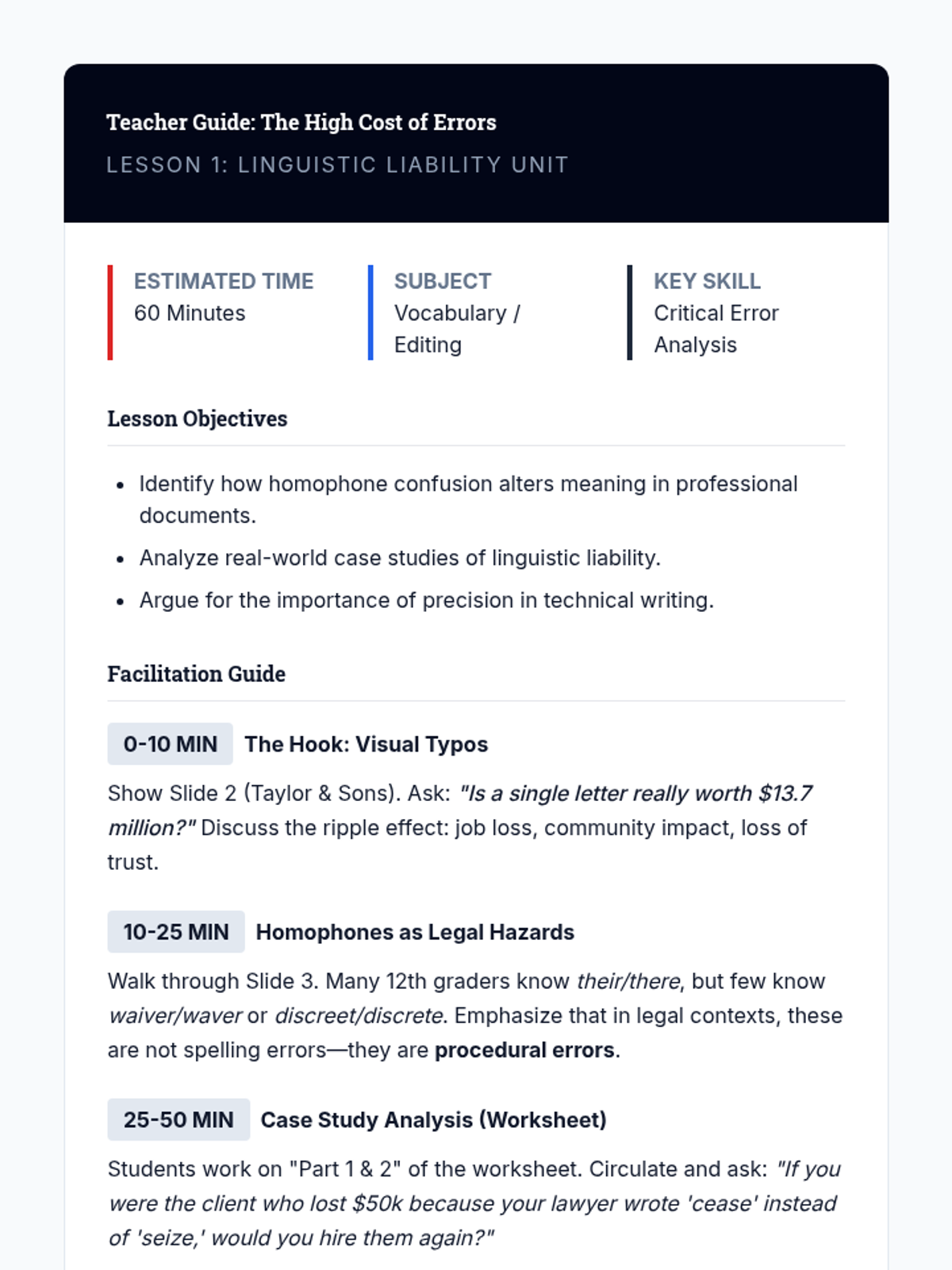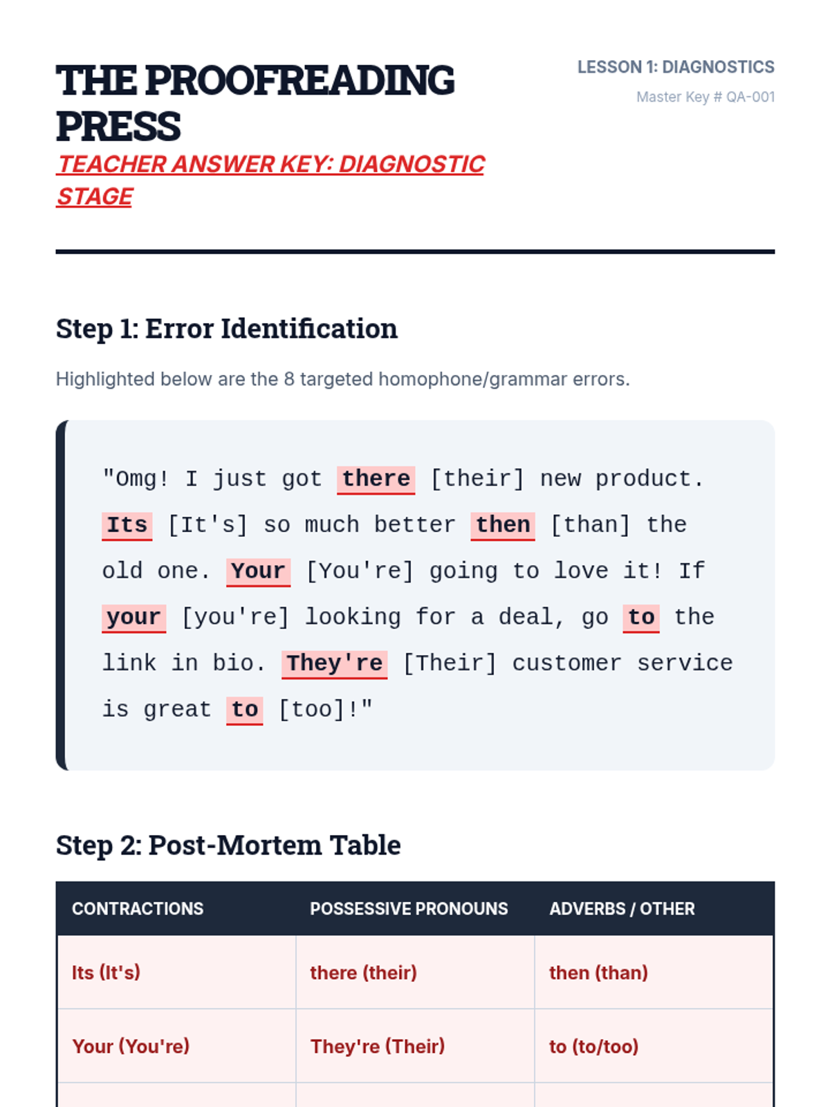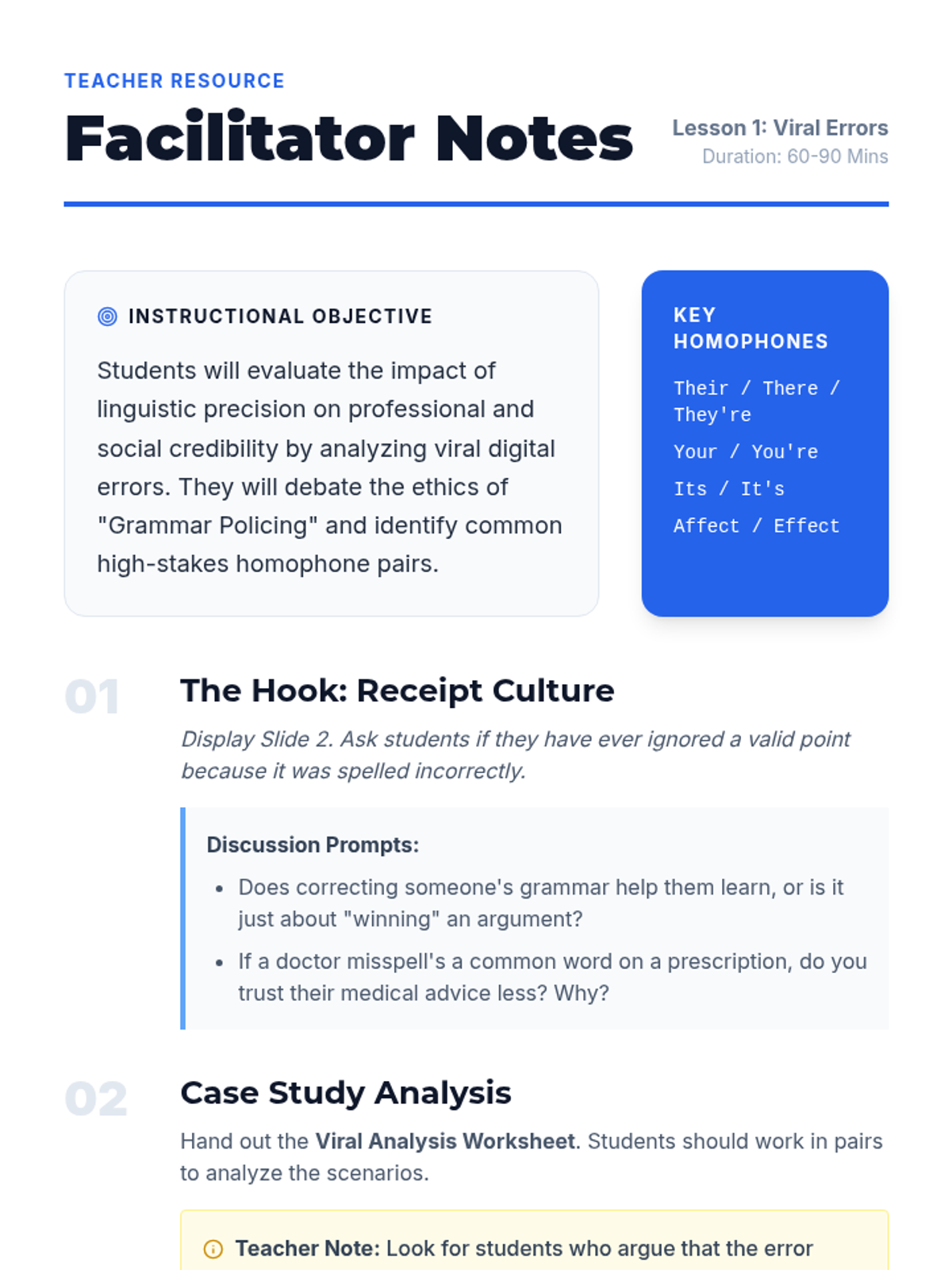 This sequence explores the professional impact of homophone errors, teaching 11th-grade students that orthographic precision is a key component of rhetorical ethos and professional credibility. Students analyze corporate case studies, master advanced confusables, and simulate the work of senior copy editors using professional style guides.