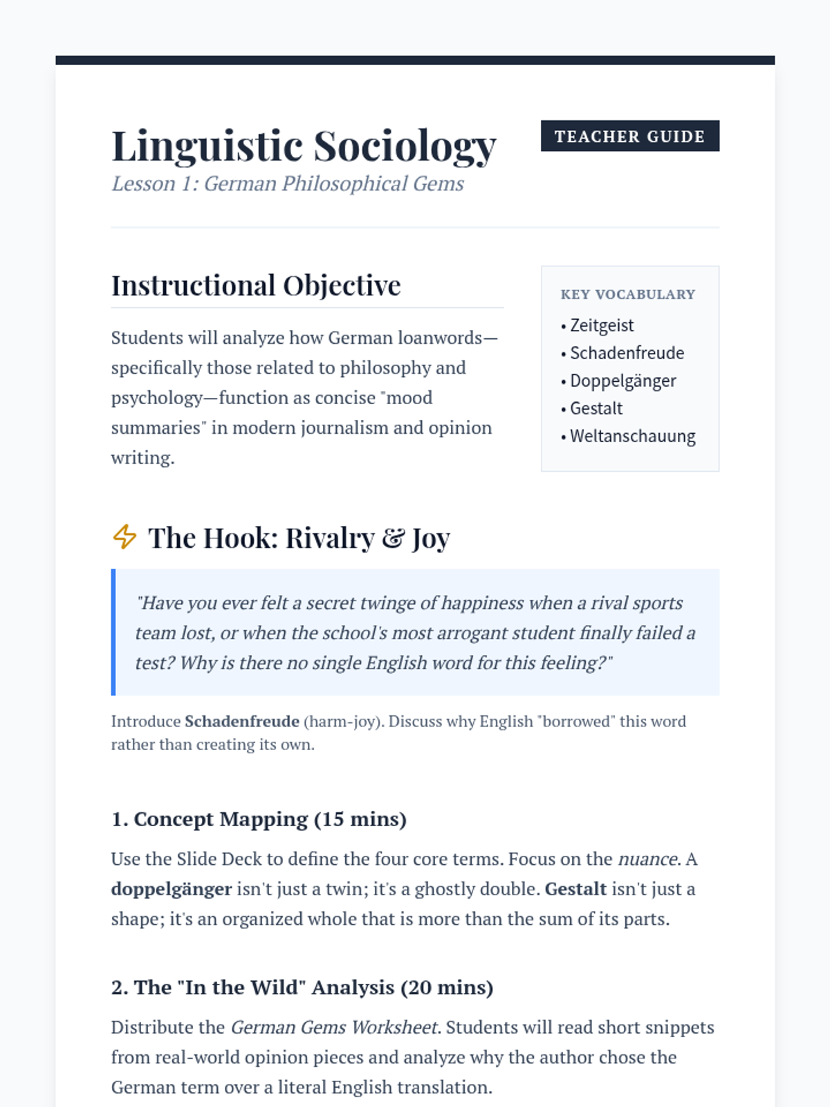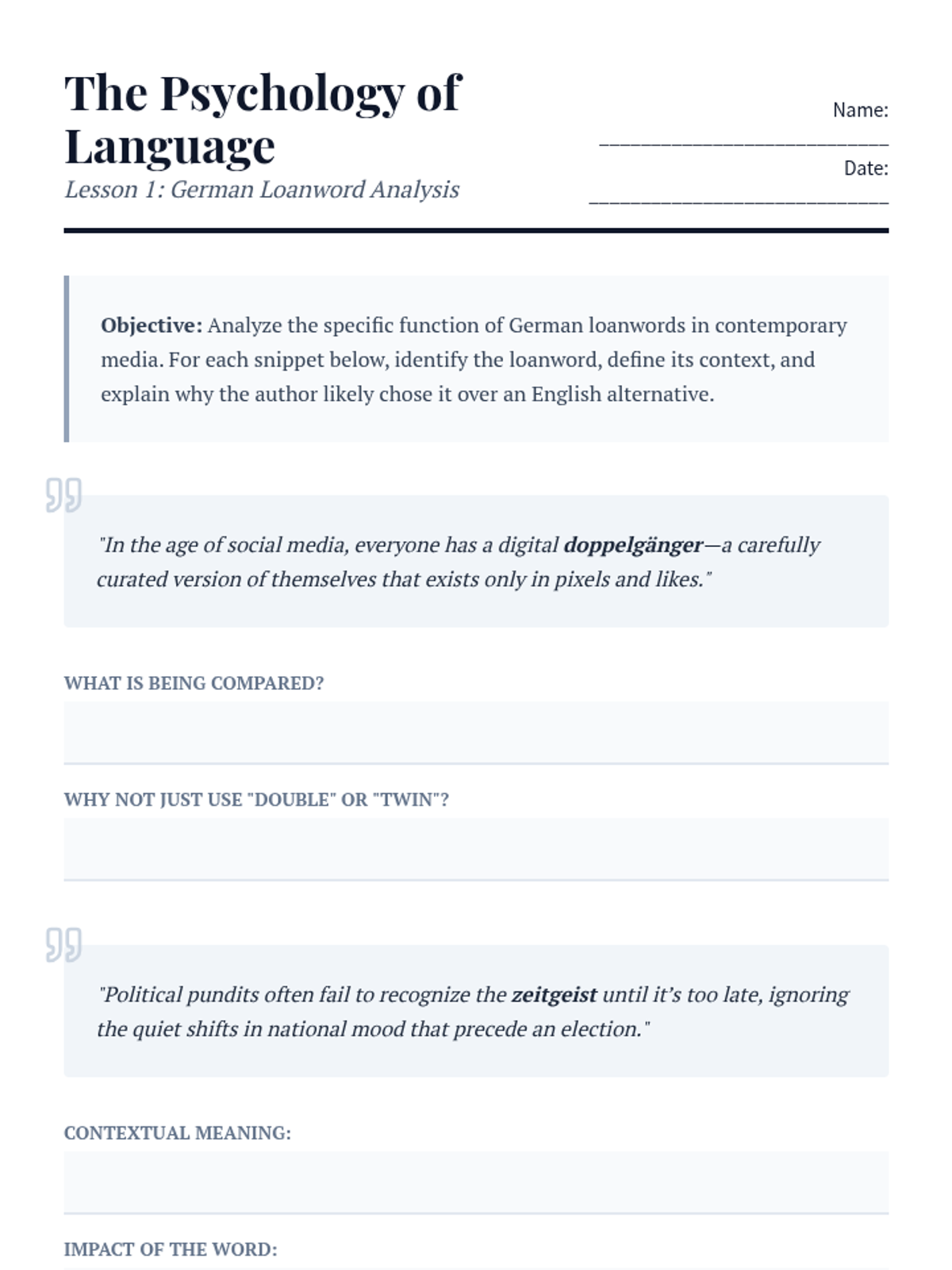 An 11th-grade ELA sequence exploring the sociological impact of foreign loanwords in modern media. Students analyze etymology, cultural context, and media usage of expressions from German, Spanish, Yiddish, and more to understand how language reflects societal moods.