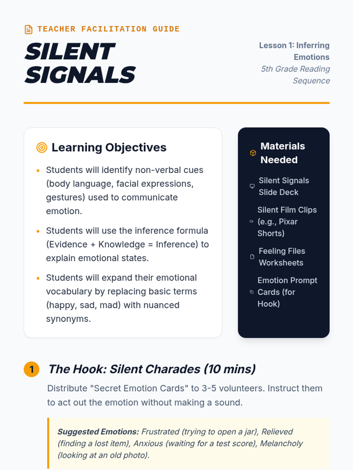 A 5th-grade sequence focused on building empathy and perspective-taking through reading inferences. Students progress from decoding non-verbal cues to predicting character actions and writing creatively from a character's perspective.