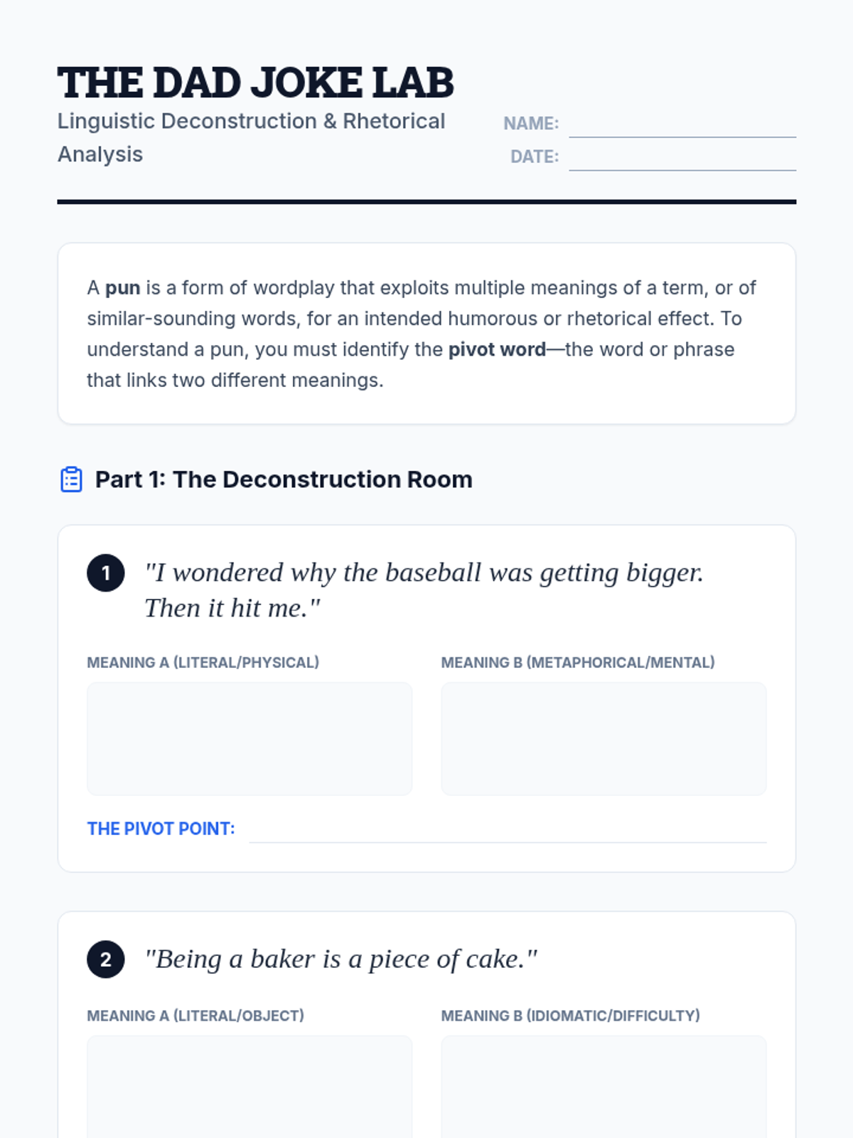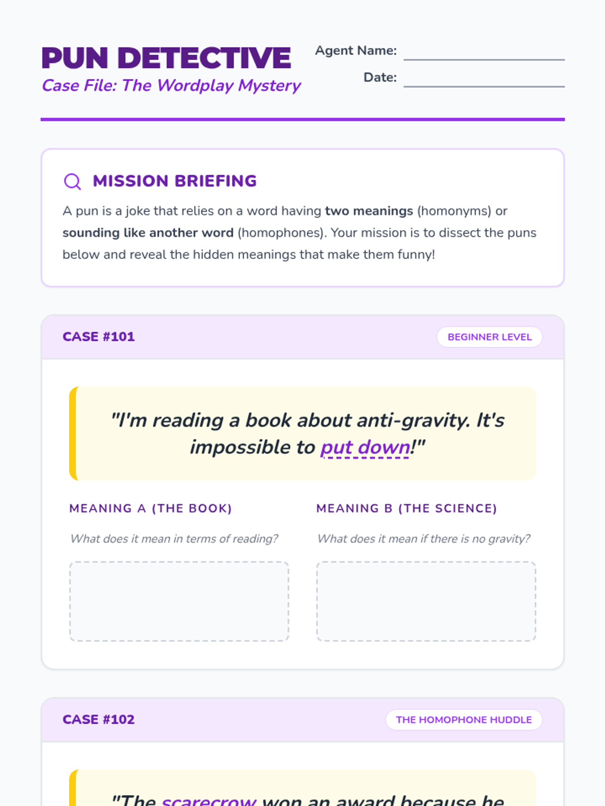 This sequence explores the creative and literary side of homophones and homonyms through puns, riddles, and advertising. Students move from deconstructing humor to creating their own intentional wordplay, culminating in a showcase of their comedic and creative linguistic skills.