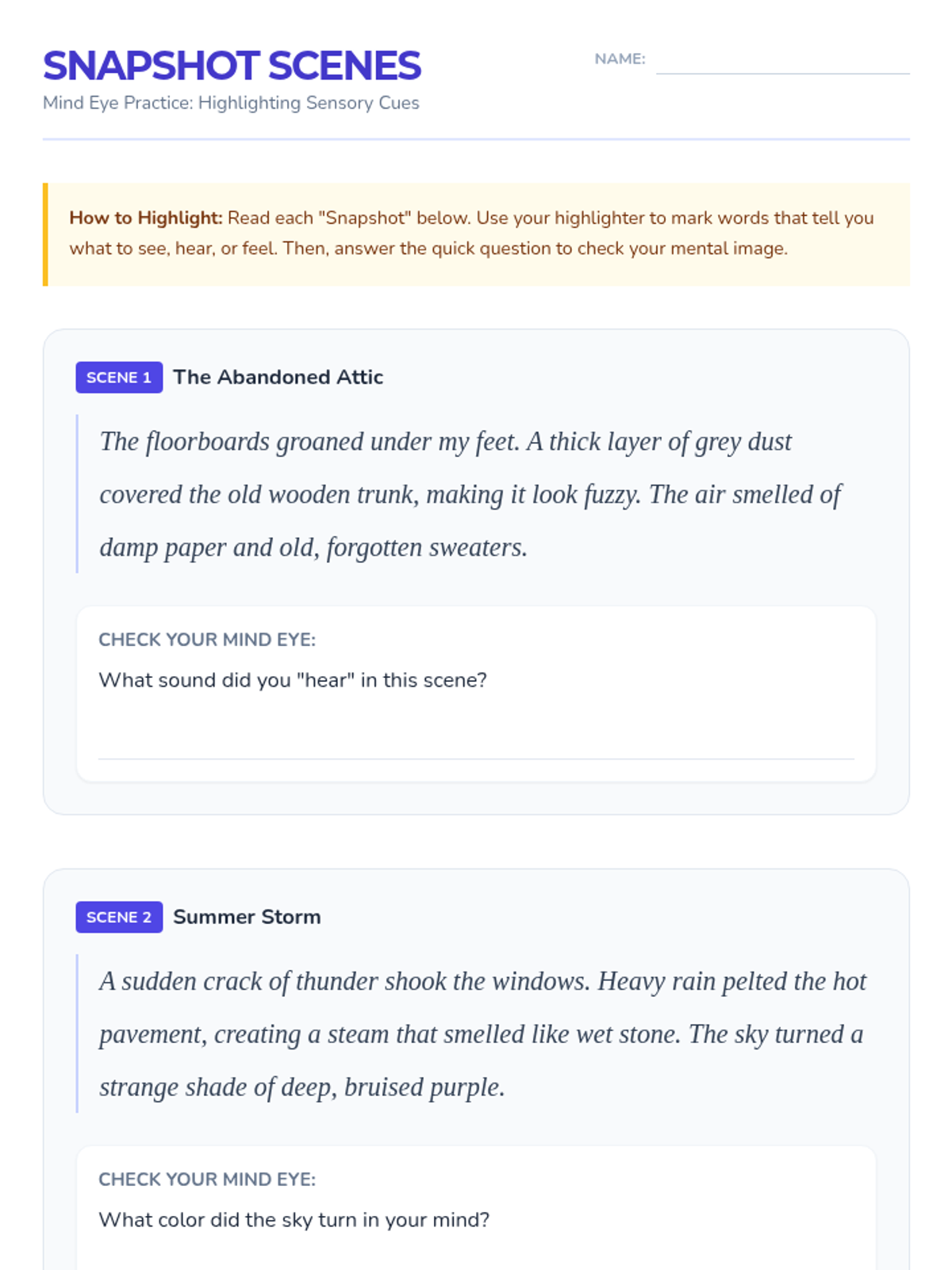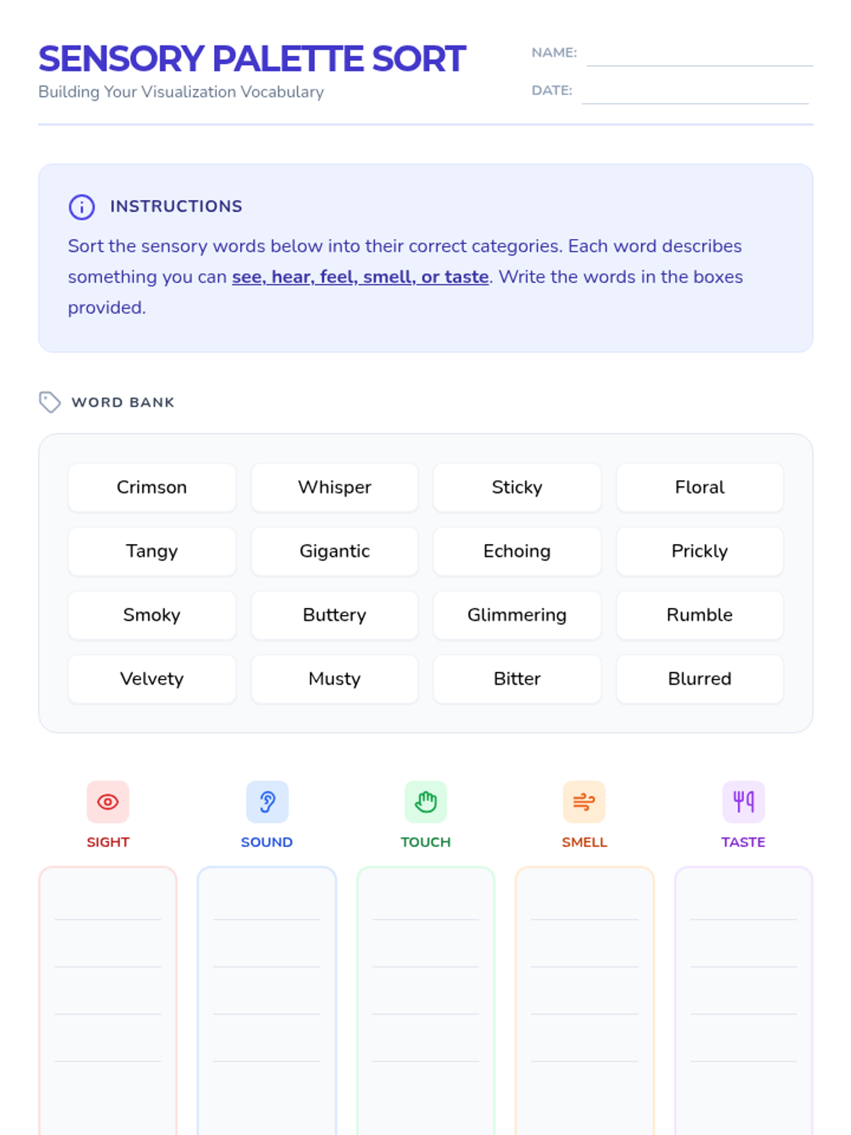A 5-lesson sequence for 6th-grade students to master visualization skills. Students progress from identifying sensory language to synthesizing multiple sensory inputs to enhance reading comprehension.