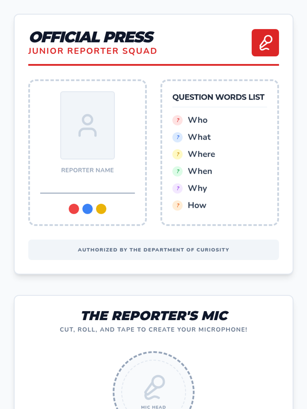 A culminating Pre-K sequence where students become 'Community Reporters,' mastering the six question words (Who, What, Where, When, Why, How) through role-play, peer interviews, and a guest inquiry project to learn about their world.