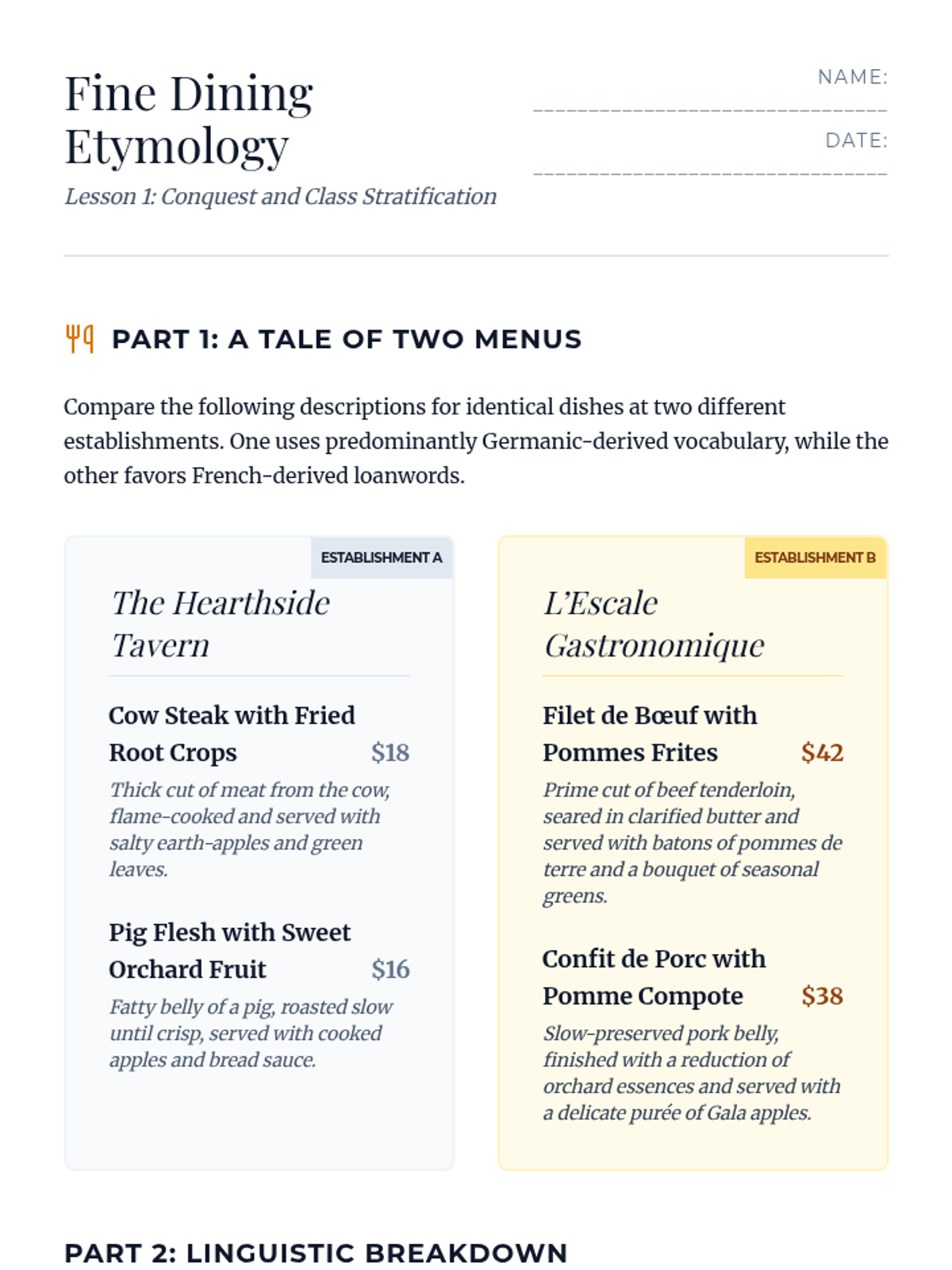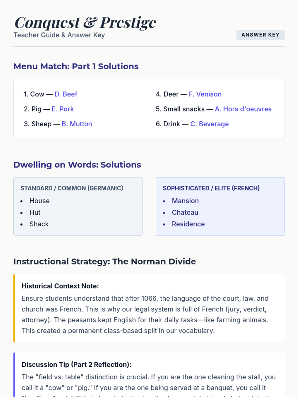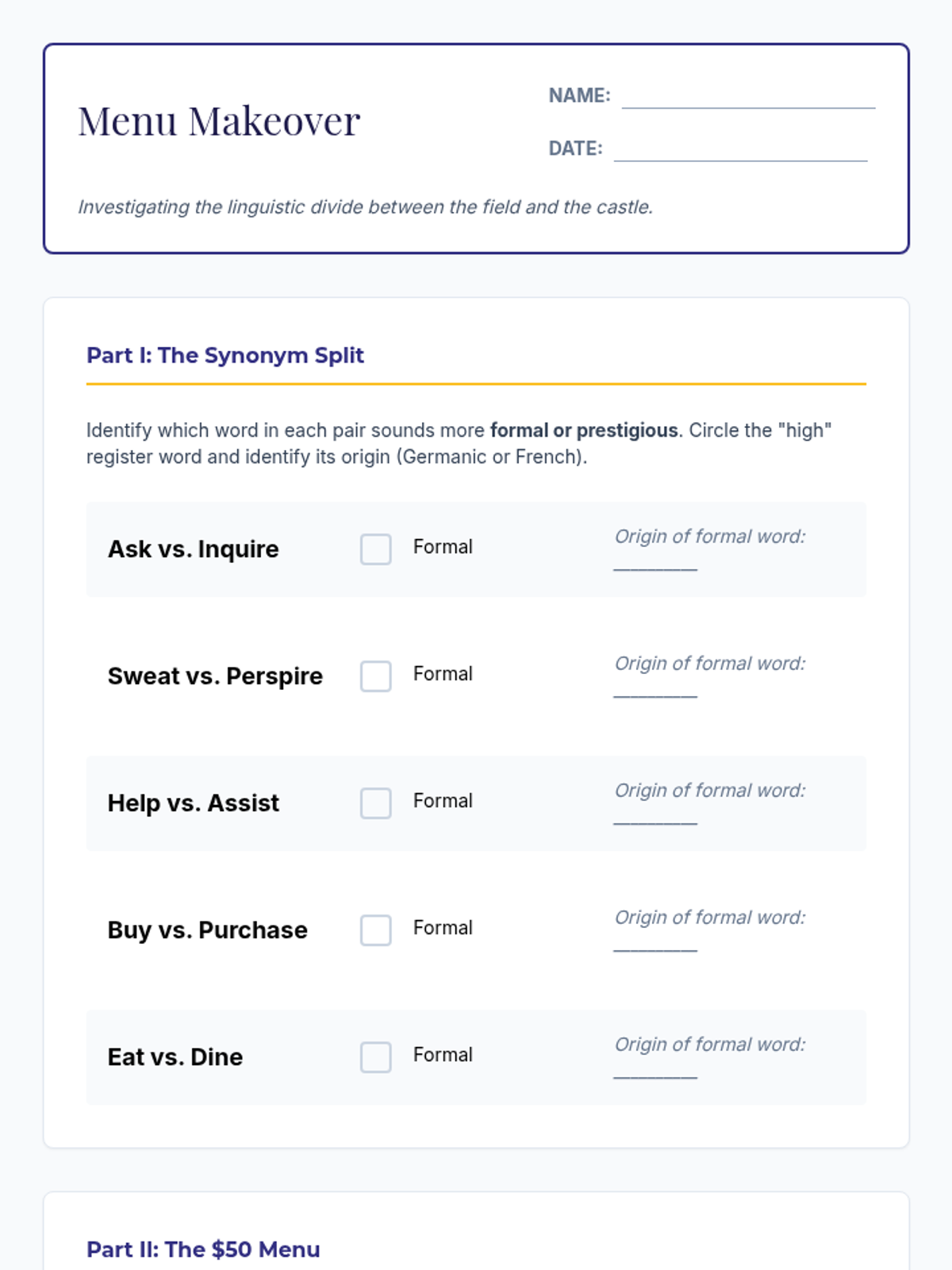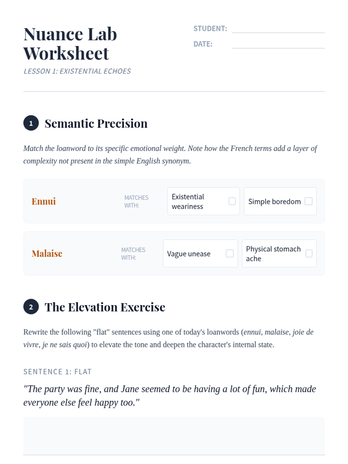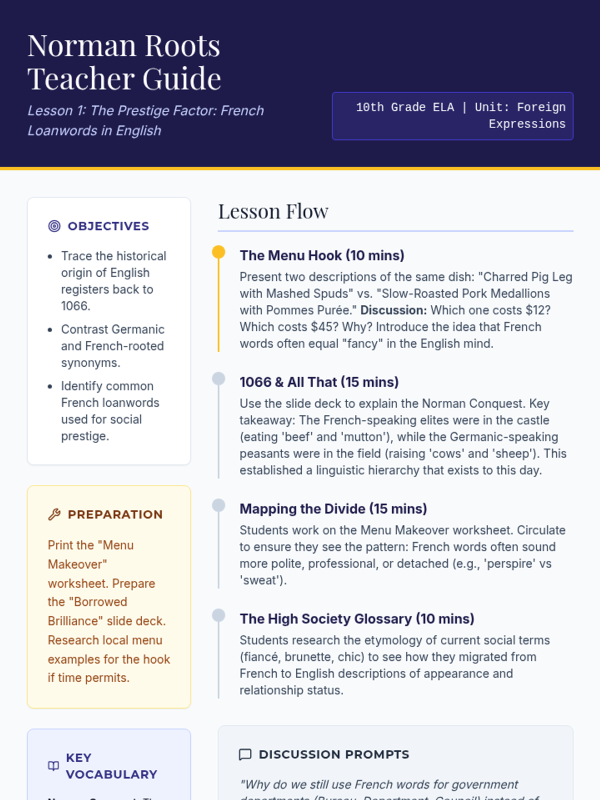 This 10th-grade ELA sequence explores the profound influence of French loanwords on the English language, focusing on how these terms convey specific nuances of tone, social status, and artistic criticism. Students progress from historical etymological roots to sophisticated literary analysis and creative application.