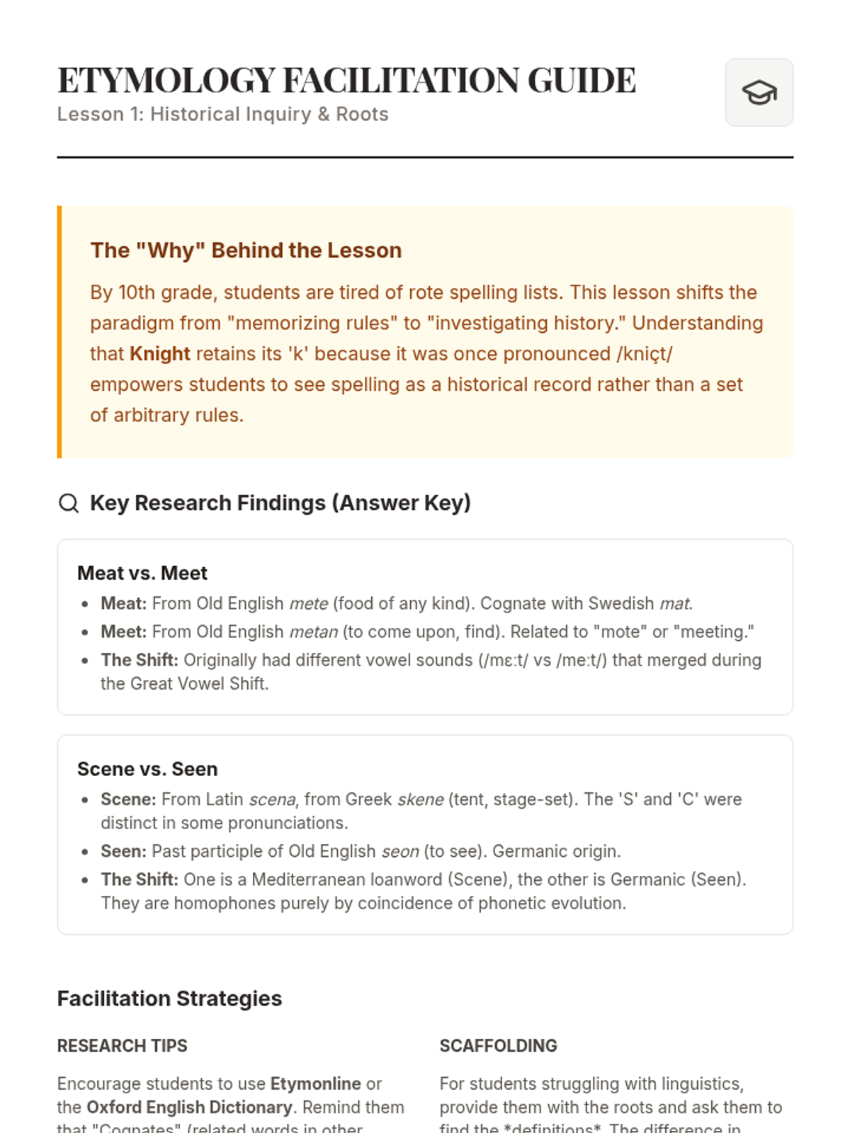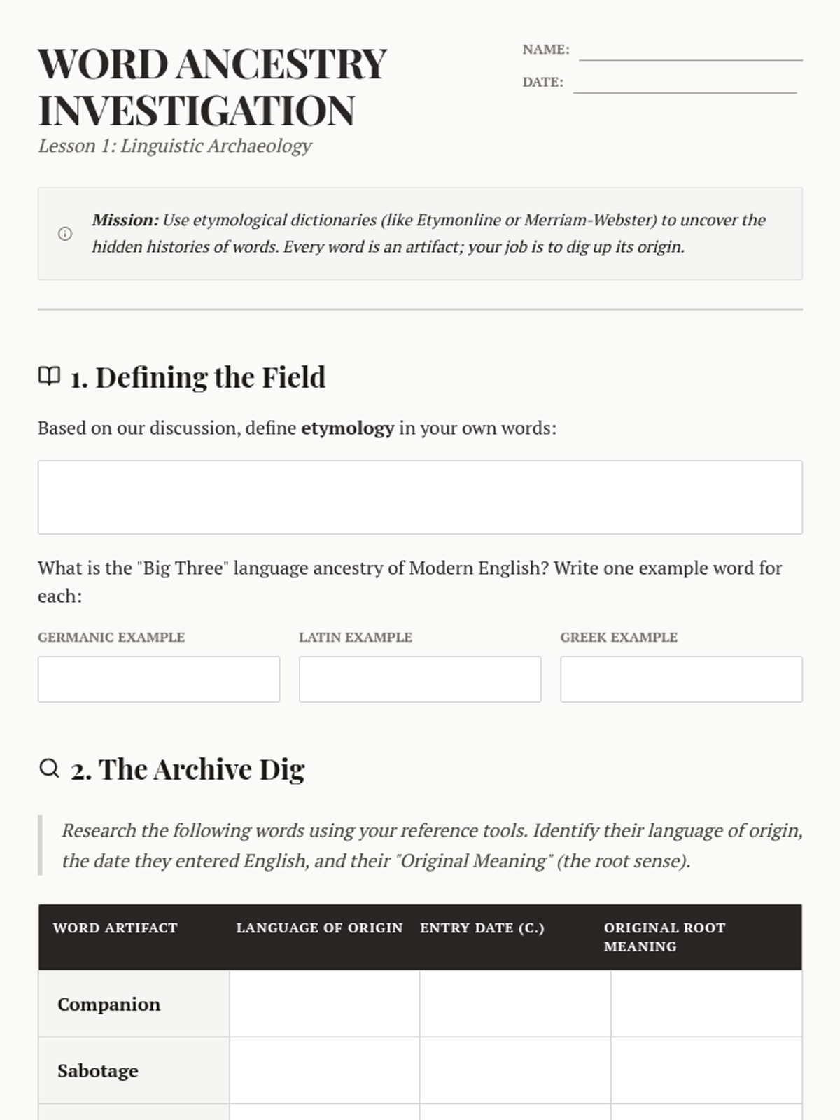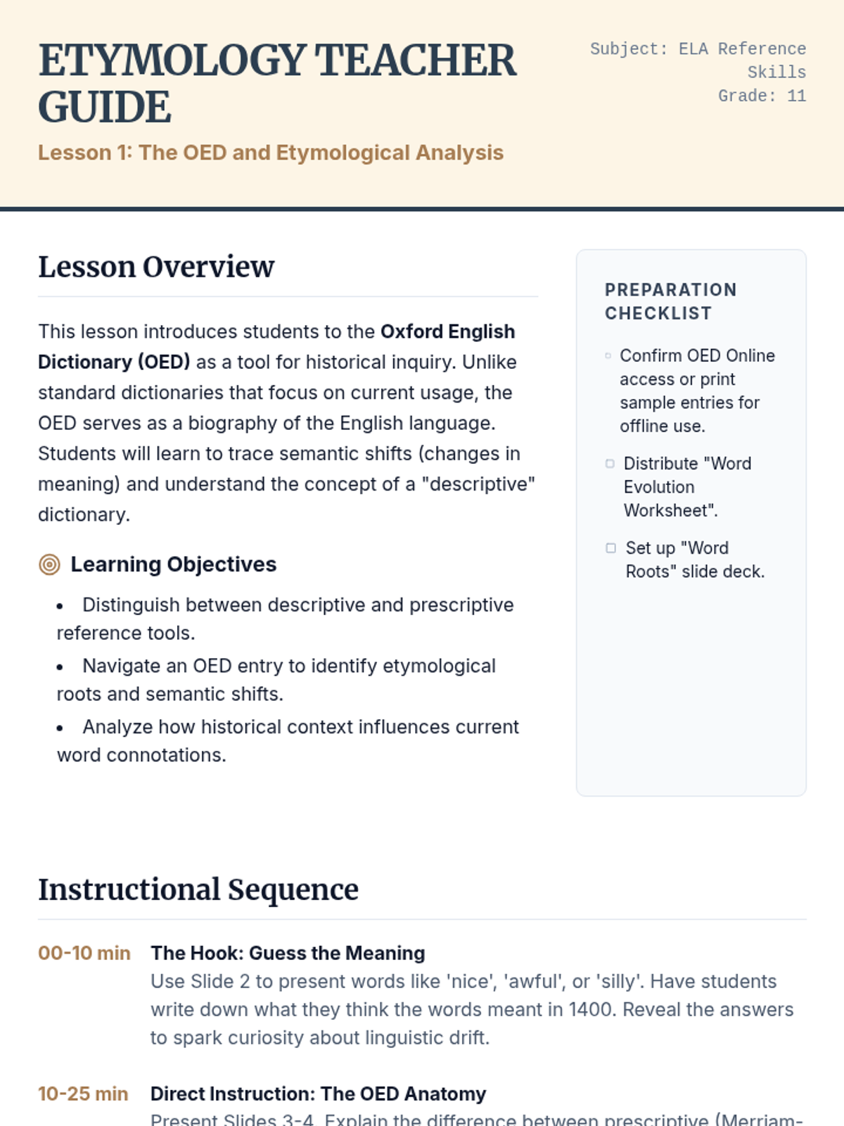 This inquiry-driven sequence focuses on etymology as a reference skill, teaching students to trace word origins to understand language evolution and historical context. Students move from decoding individual roots to analyzing how historical events shape the English lexicon, culminating in a 'word biography' project.