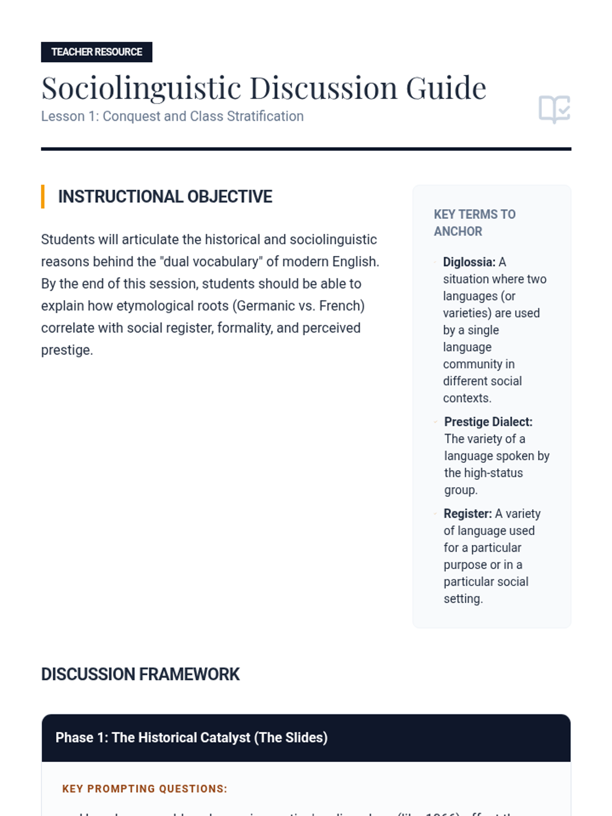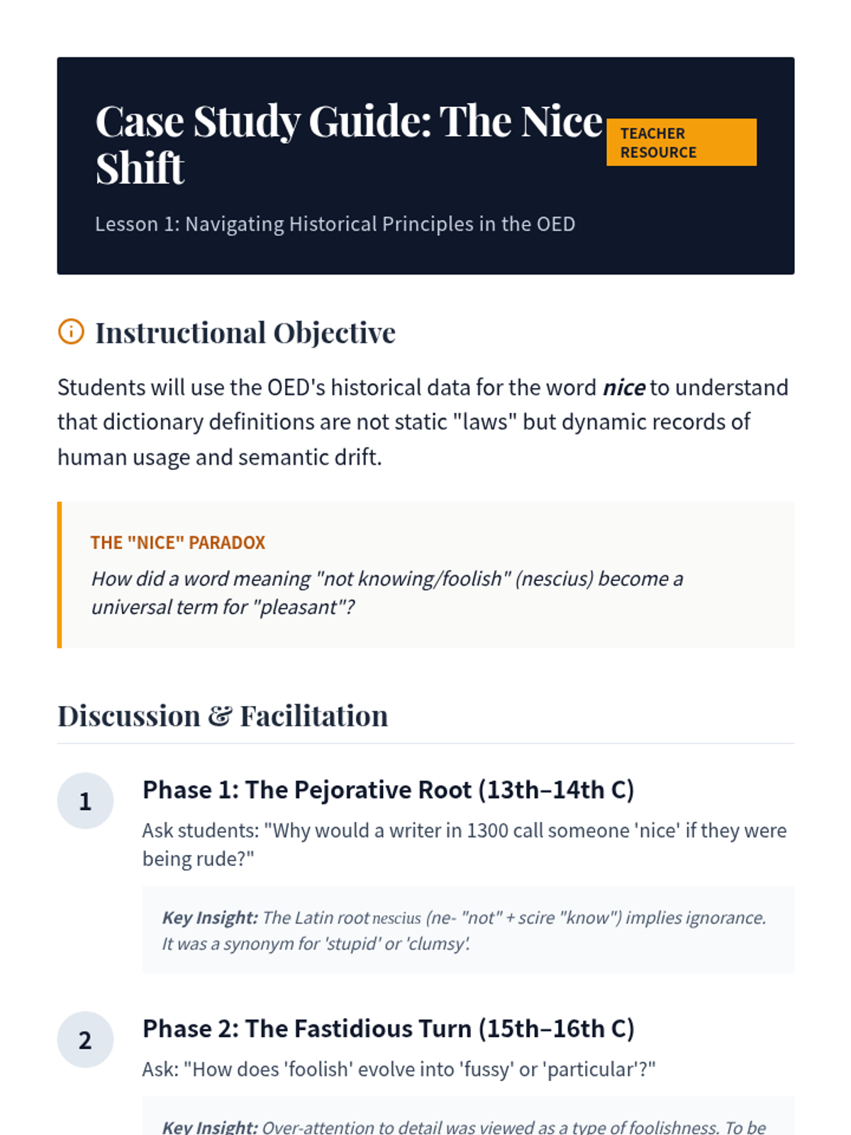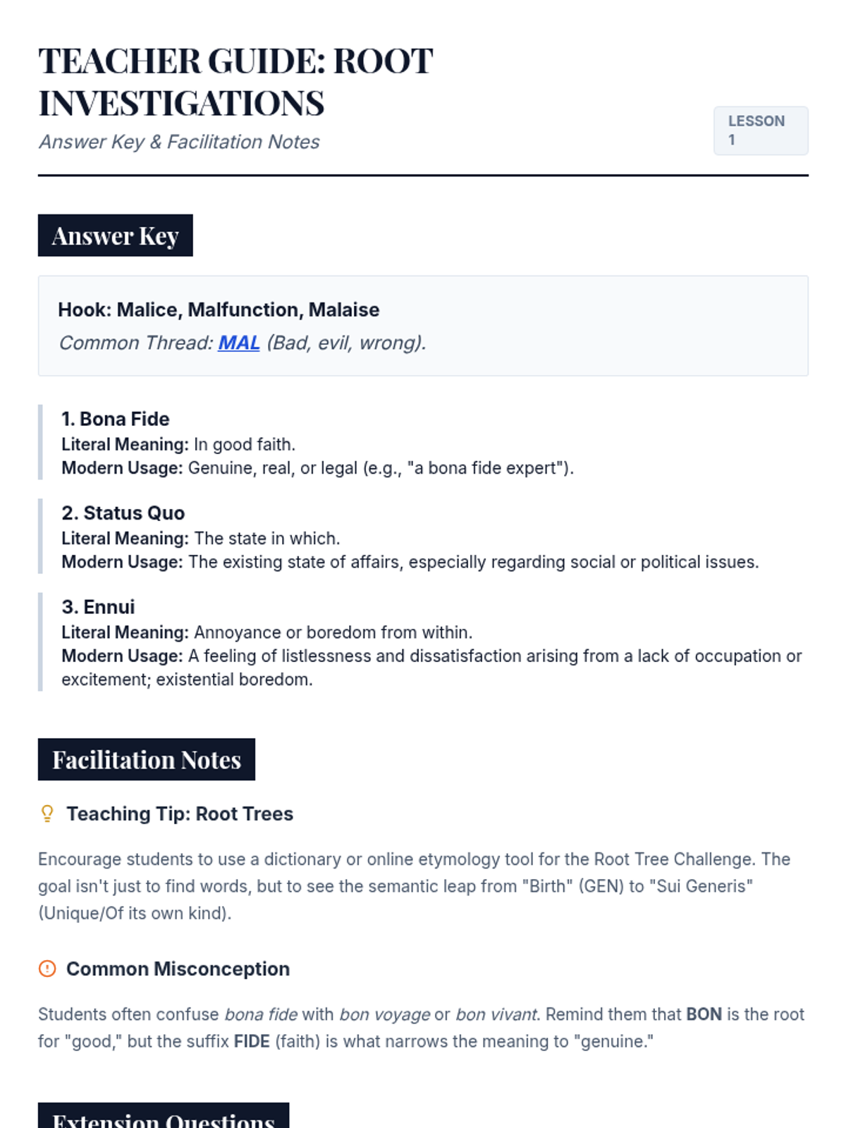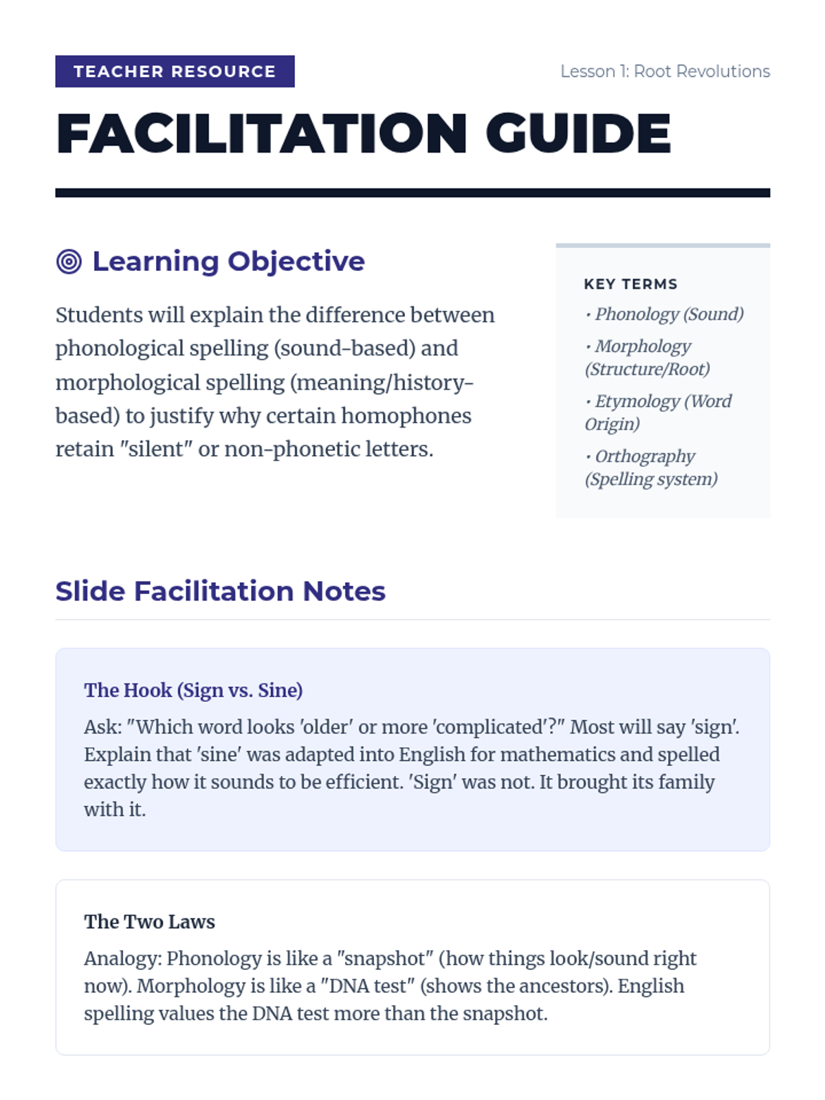 This inquiry-driven sequence focuses on etymology as a reference skill, teaching students to trace word origins to understand language evolution and historical context. Students move from decoding individual roots to analyzing how historical events shape the English lexicon, culminating in a 'word biography' project.