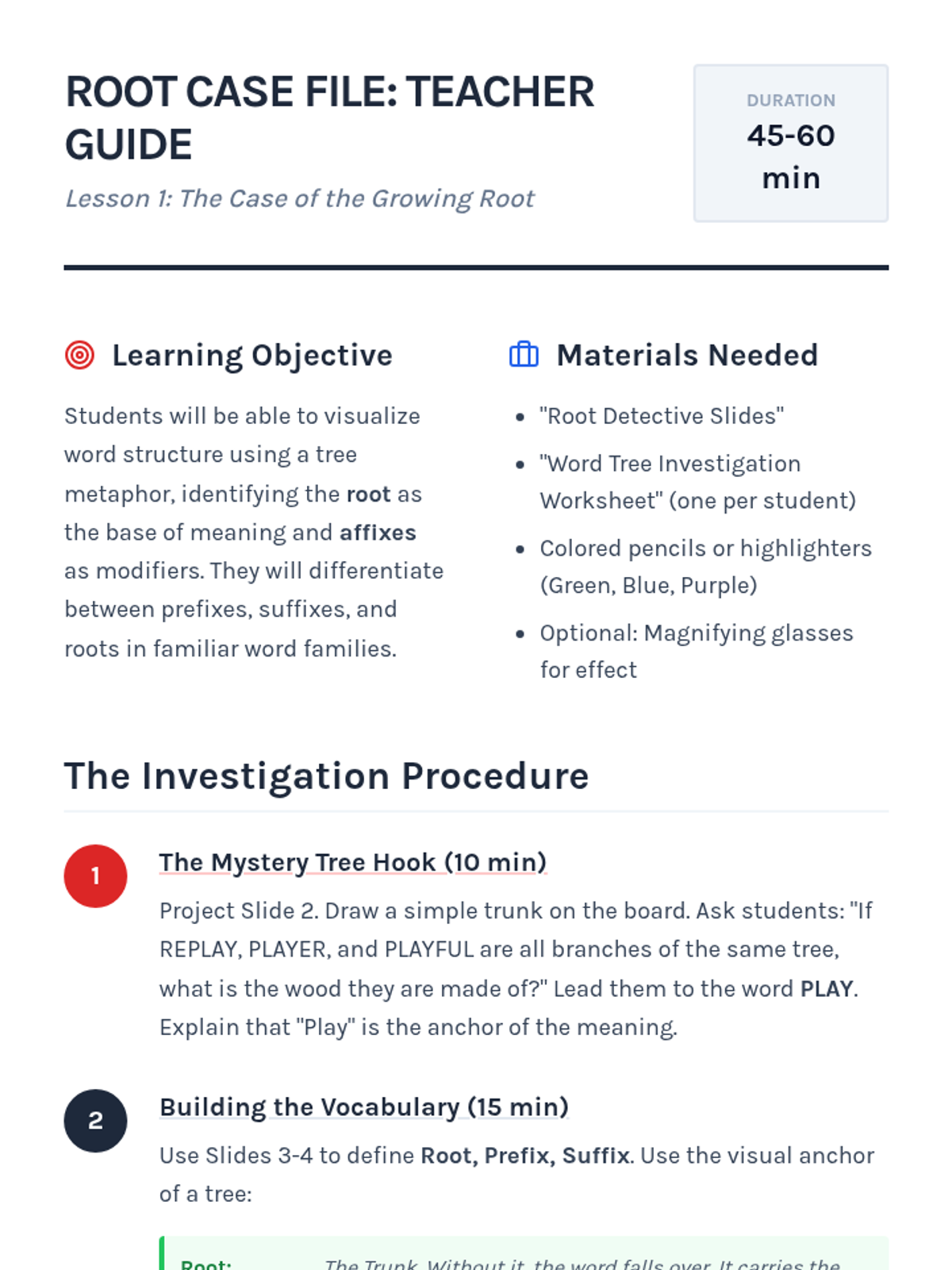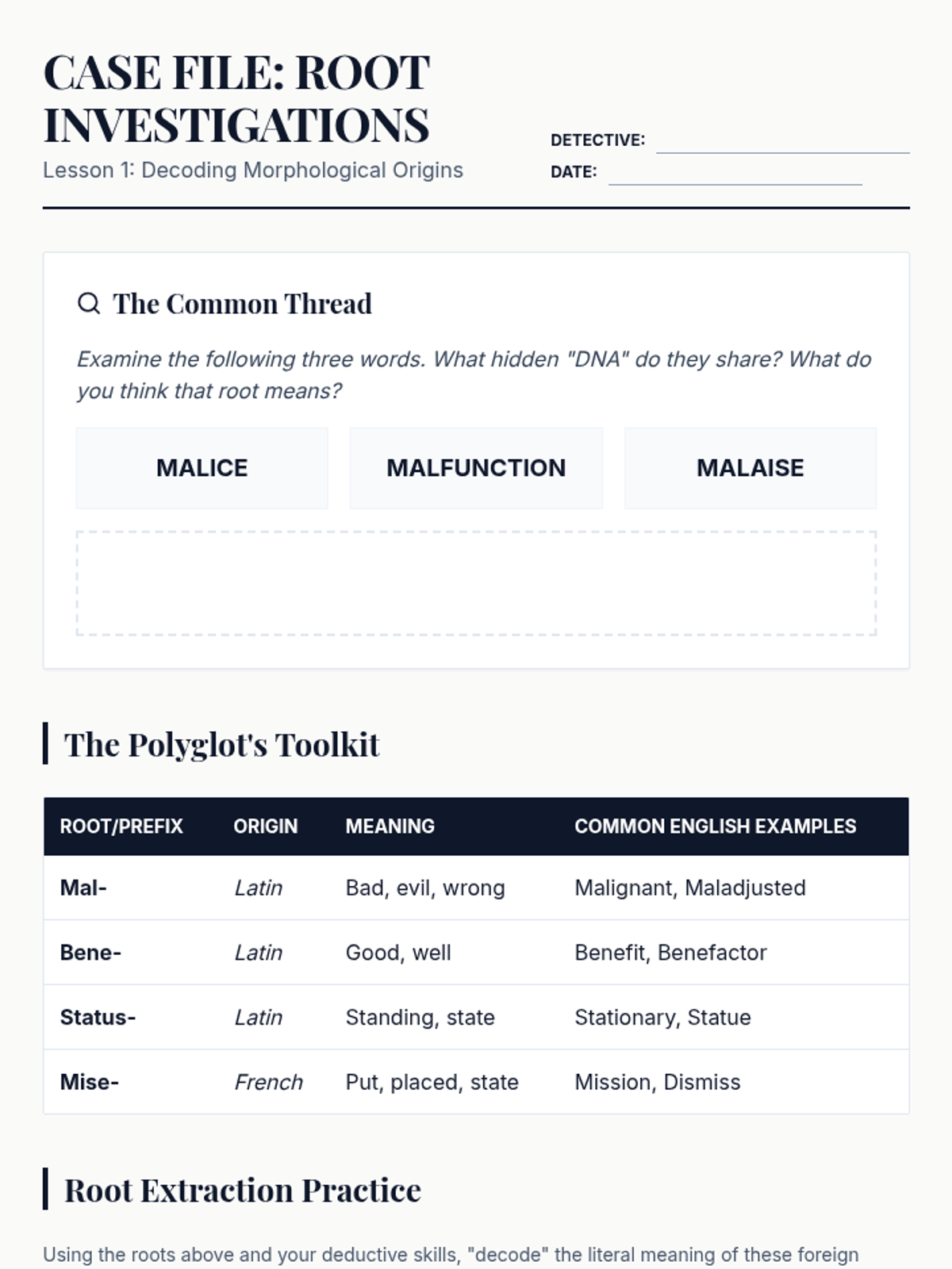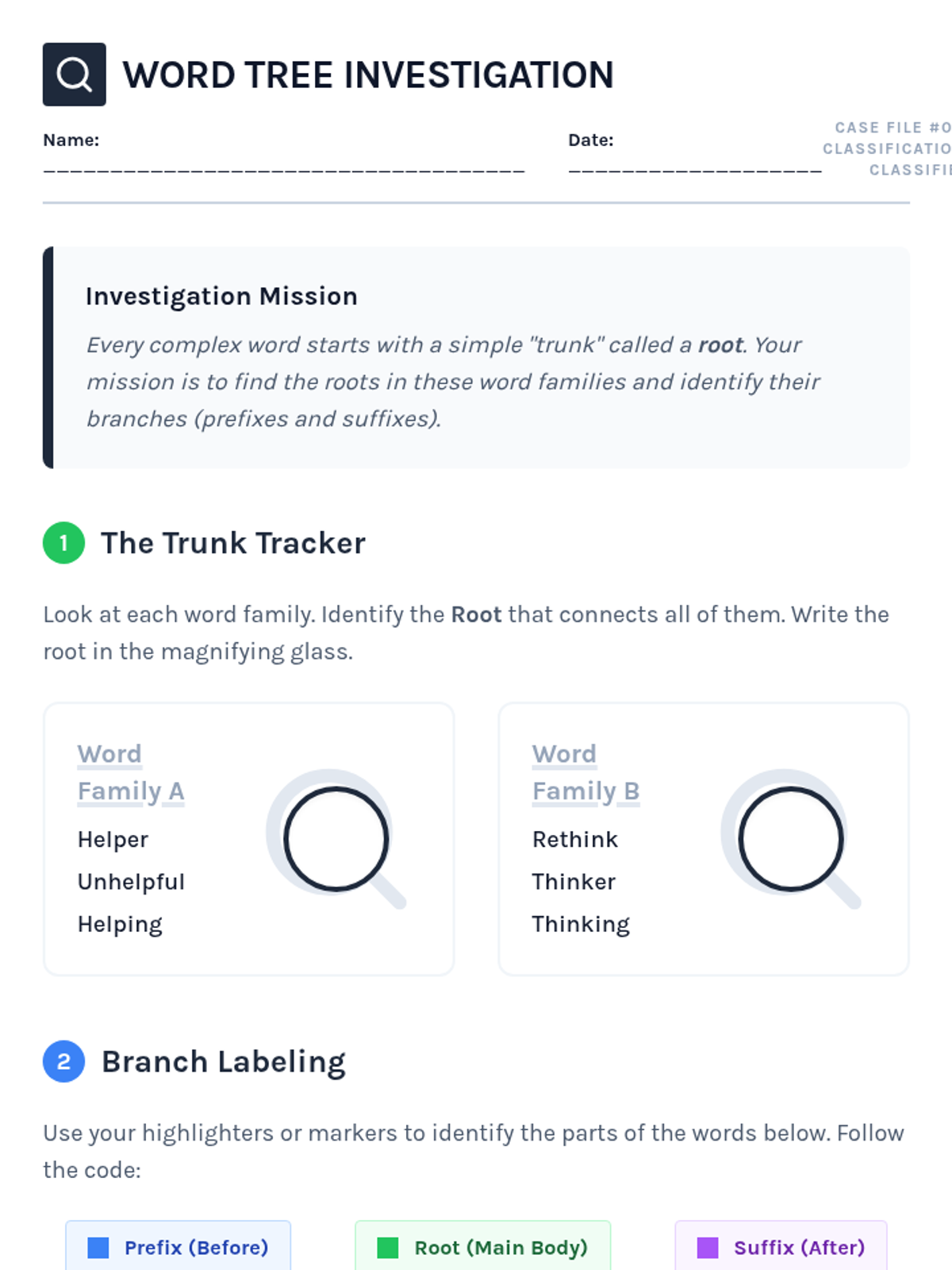 A 4th-grade ELA sequence where students become 'word detectives' to decode unfamiliar vocabulary using Greek and Latin roots, prefixes, and suffixes. Through a workshop-style approach, students learn to analyze morphological structures to unlock the meaning of academic text.