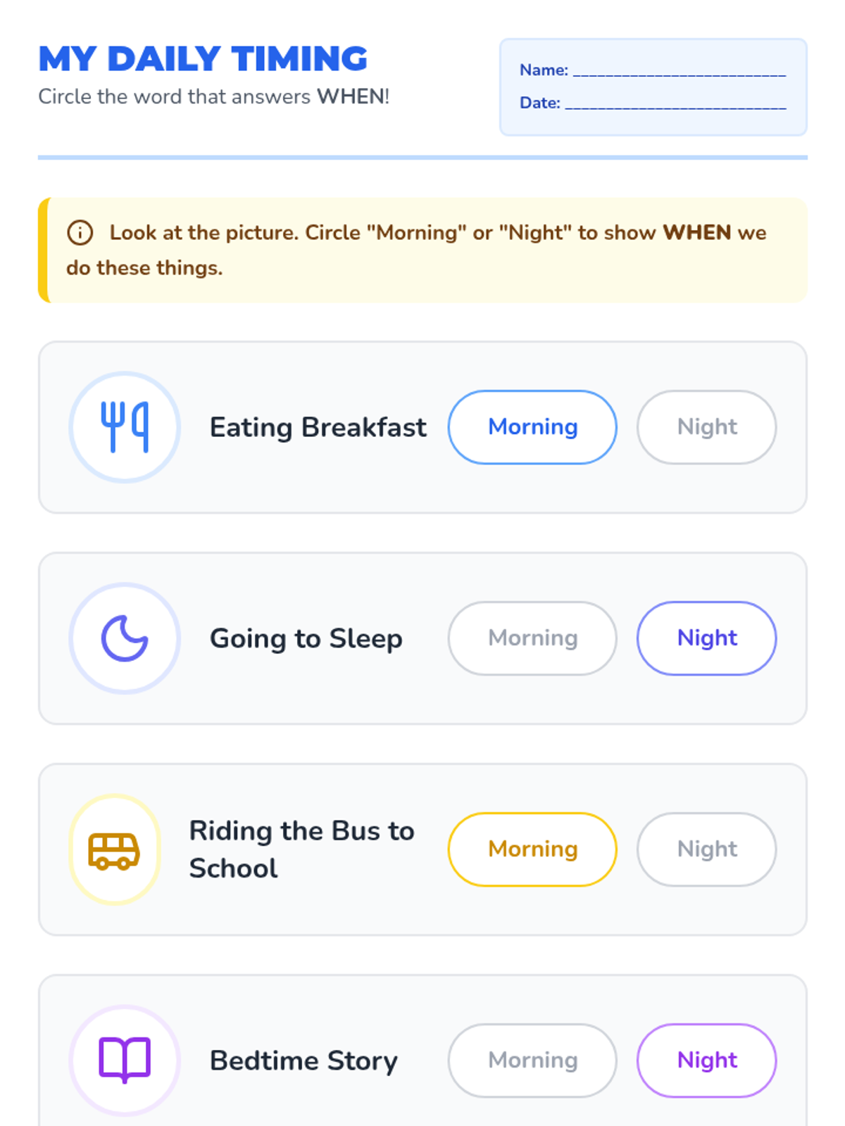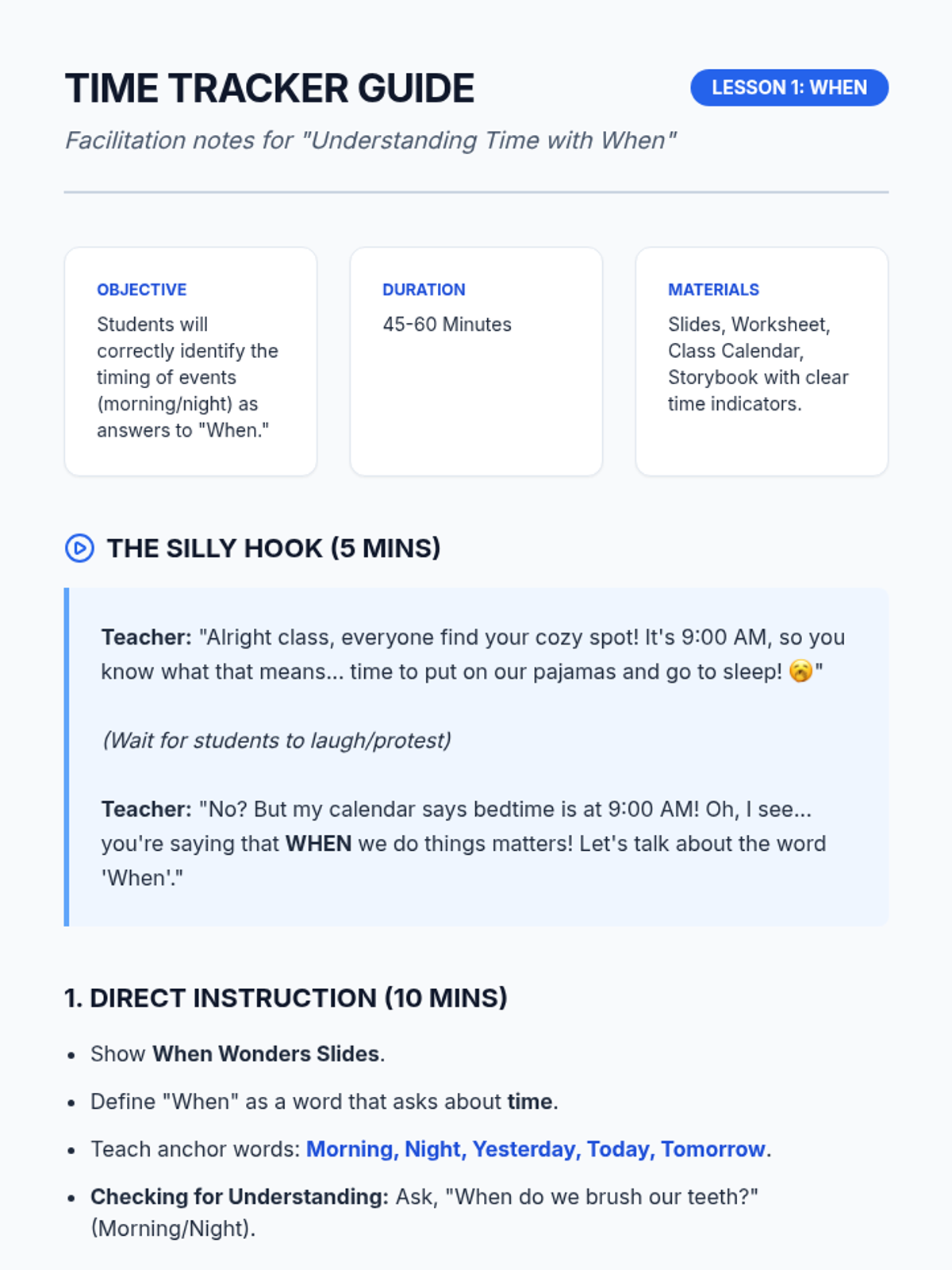A comprehensive Kindergarten ELA sequence focused on the abstract question words 'when', 'why', and 'how' to enhance narrative comprehension and causal reasoning through play, story analysis, and procedural tasks.