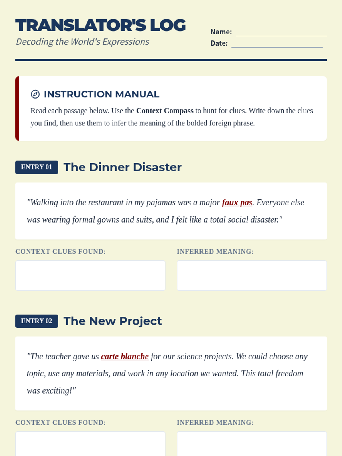 This sequence teaches 6th-grade students how to identify, understand, and use common foreign words and expressions in English. Through a mix of context clue analysis, tone comparison, pronunciation practice, and creative writing, students learn to enhance the sophistication and precision of their communication.