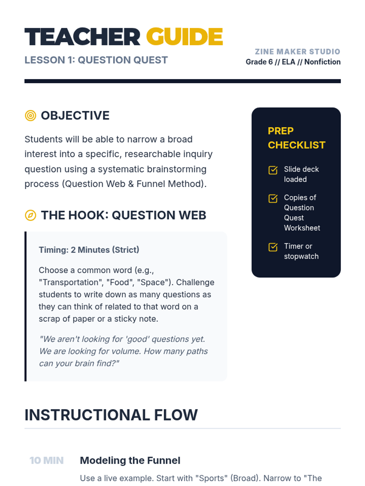 Students transform from readers to authors as they research a topic of interest and synthesize their findings into a professional-grade informational Zine. This project-based unit focuses on inquiry, organizational structures, domain-specific vocabulary, and the intentional use of text features to educate an audience.