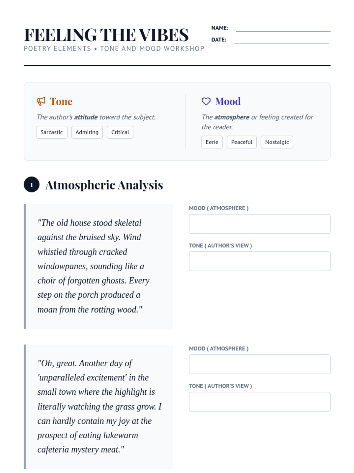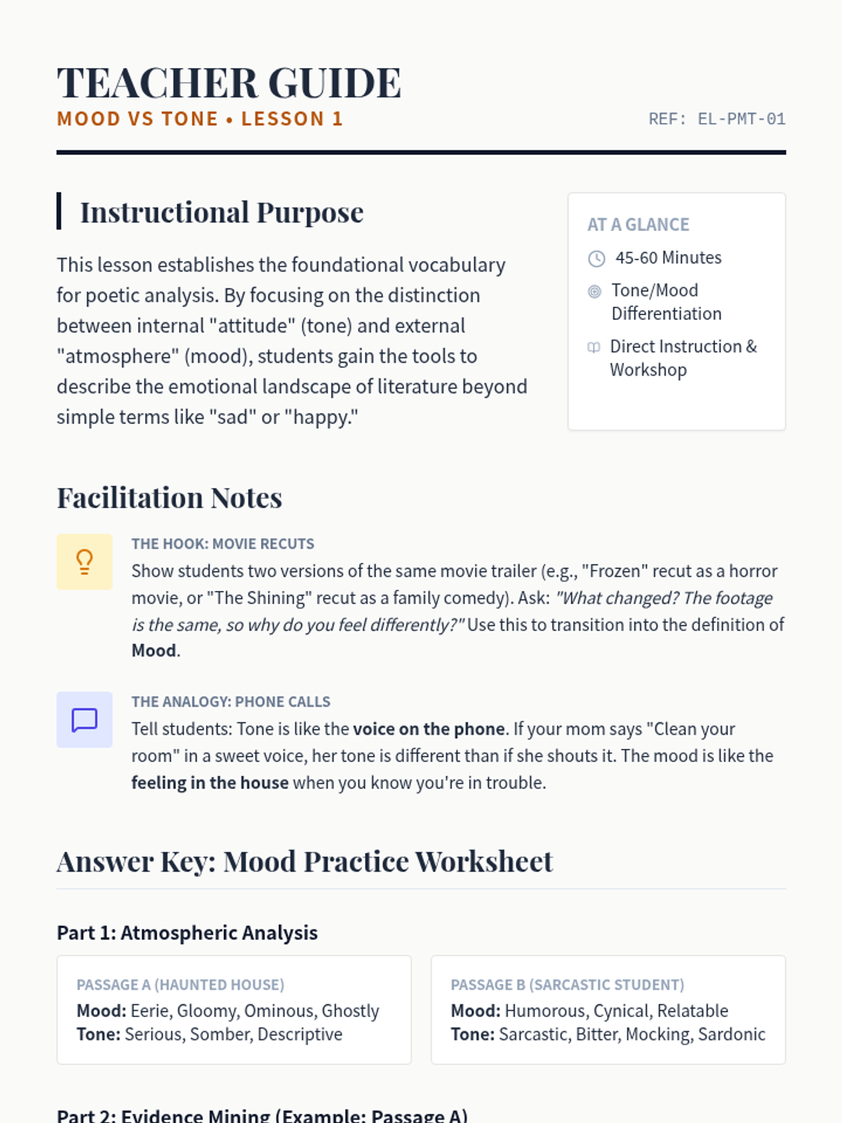 This sequence explores how poetic elements like diction, imagery, and sound devices work together to create tone and mood. Students move from technical identification to emotional interpretation through a case study of Edgar Allan Poe and comparative analysis.