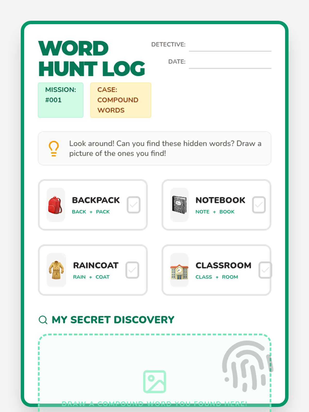A Kindergarten ELA project where students act as 'Word Detectives' and 'Encyclopedists' to create a class book about compound words. They hunt for words, visualize them through art, record definitions, and celebrate their work.