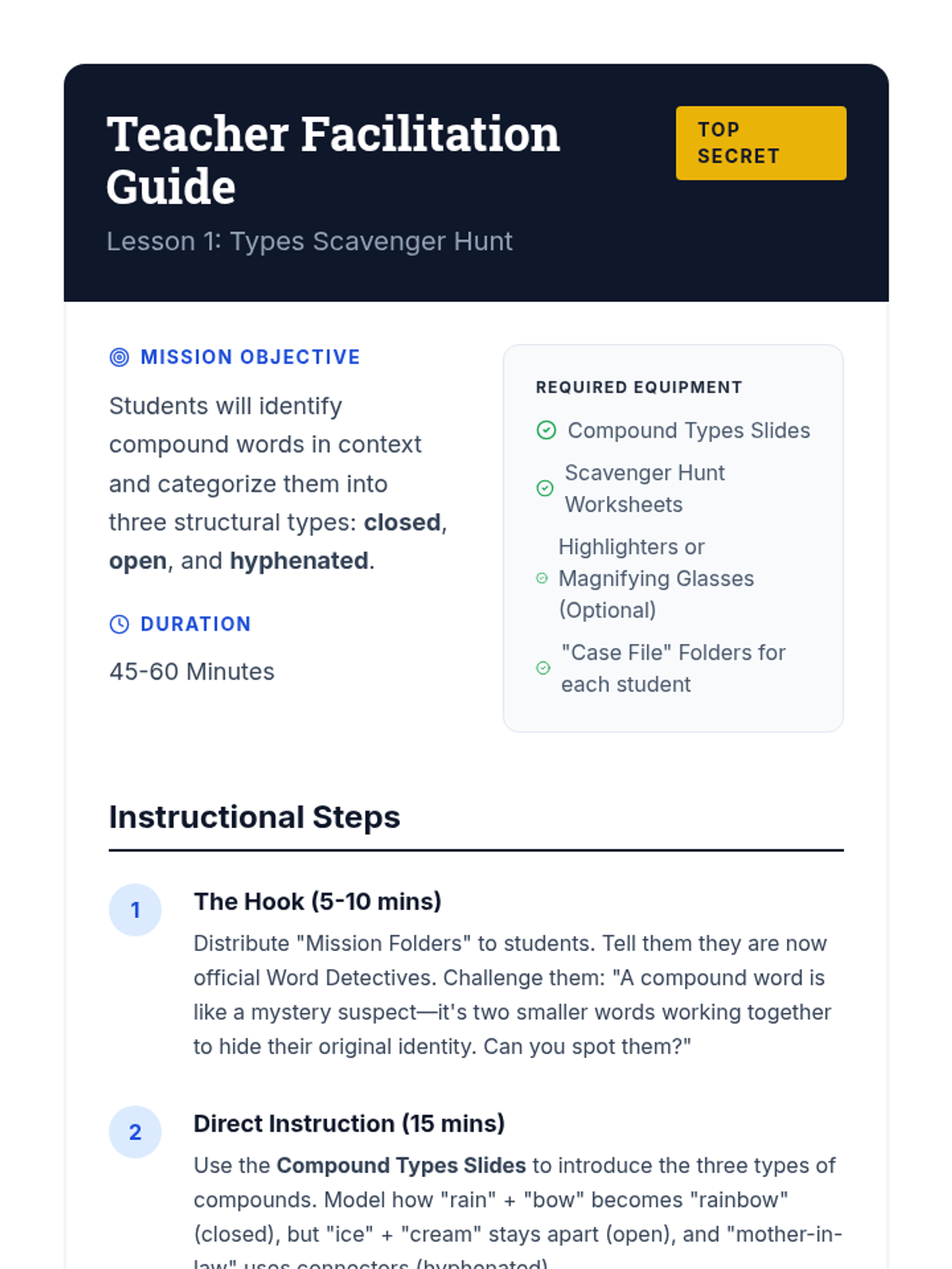 A 4th-grade ELA sequence where students become 'Word Detectives' to investigate the structure, types, and meanings of compound words using context clues and grammatical analysis.