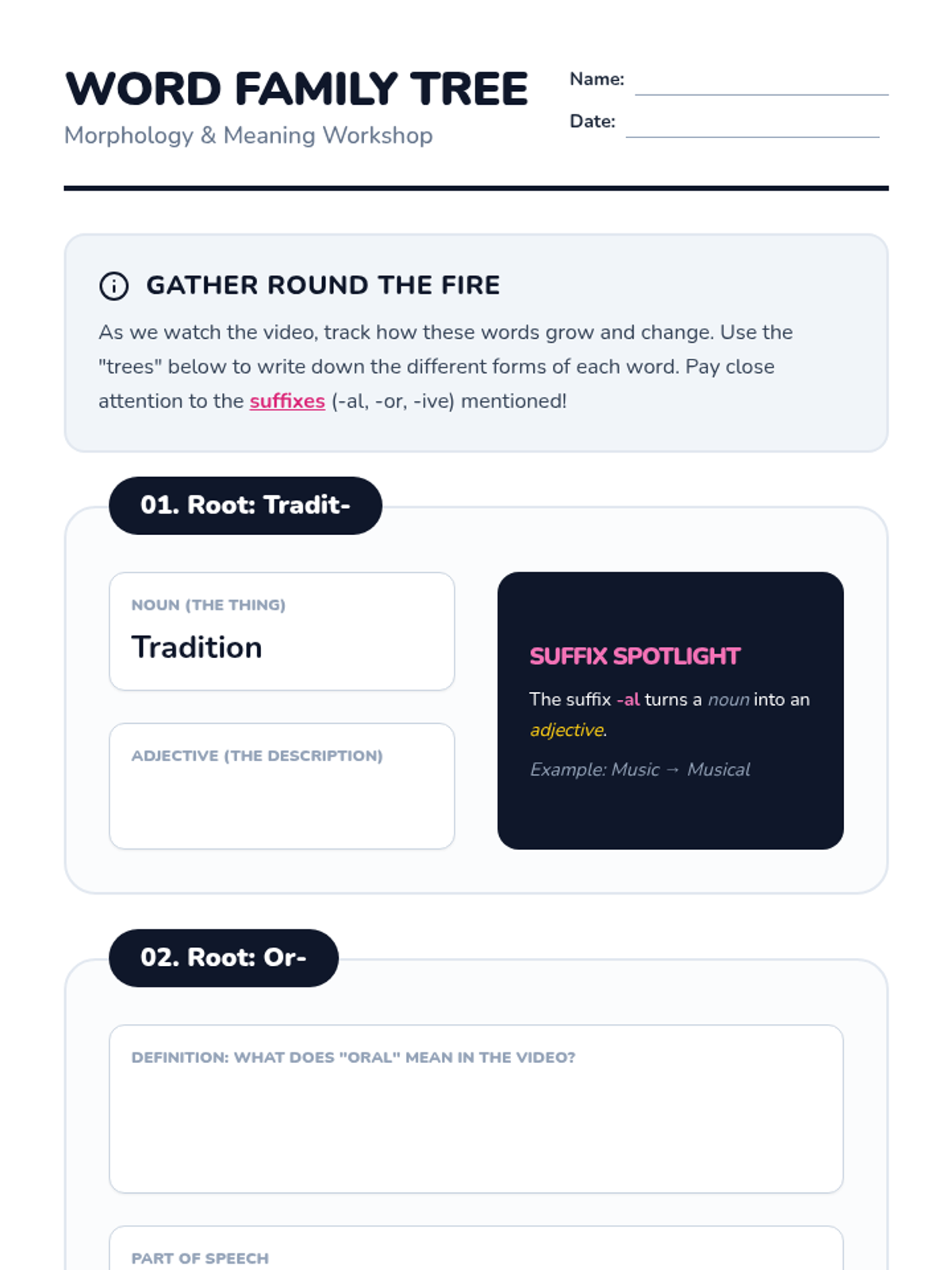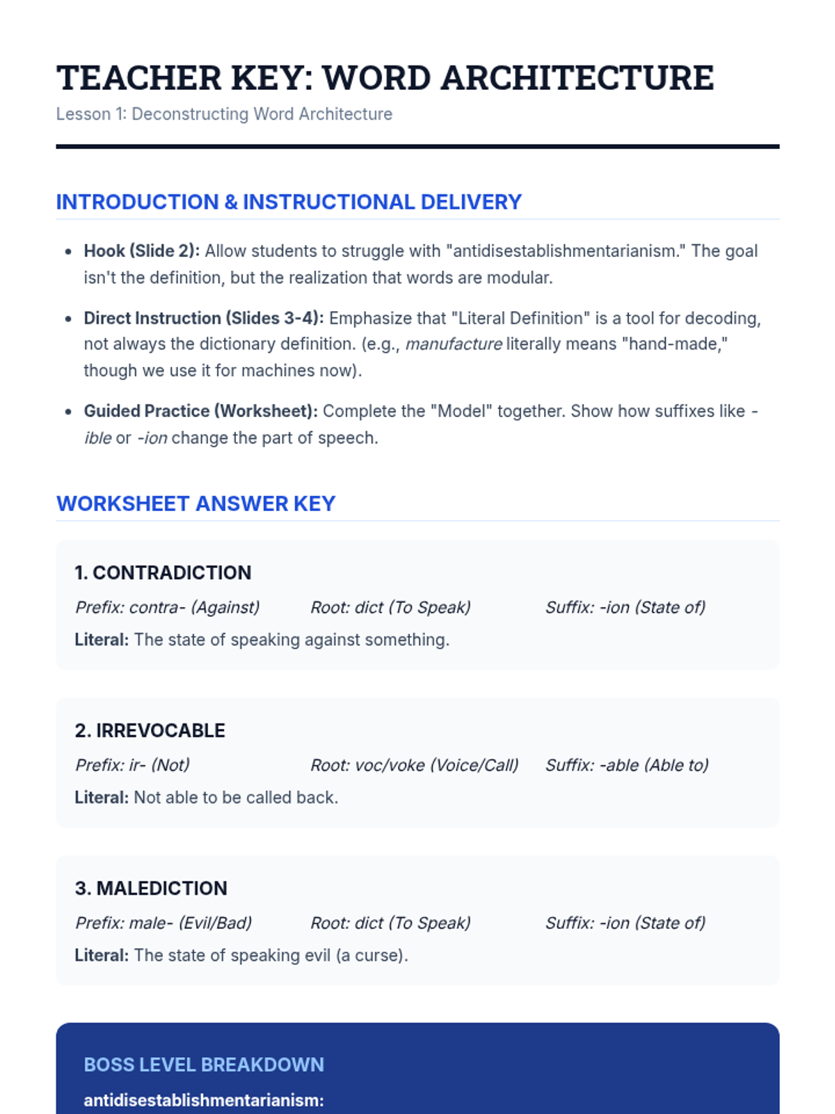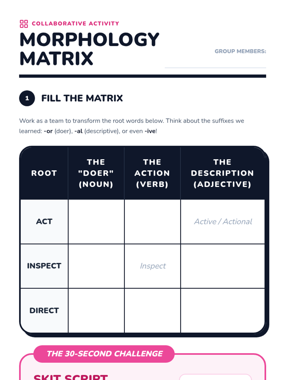 A sequence focused on the power of morphology, teaching students how to transform root words into various parts of speech using suffixes and prefixes.
