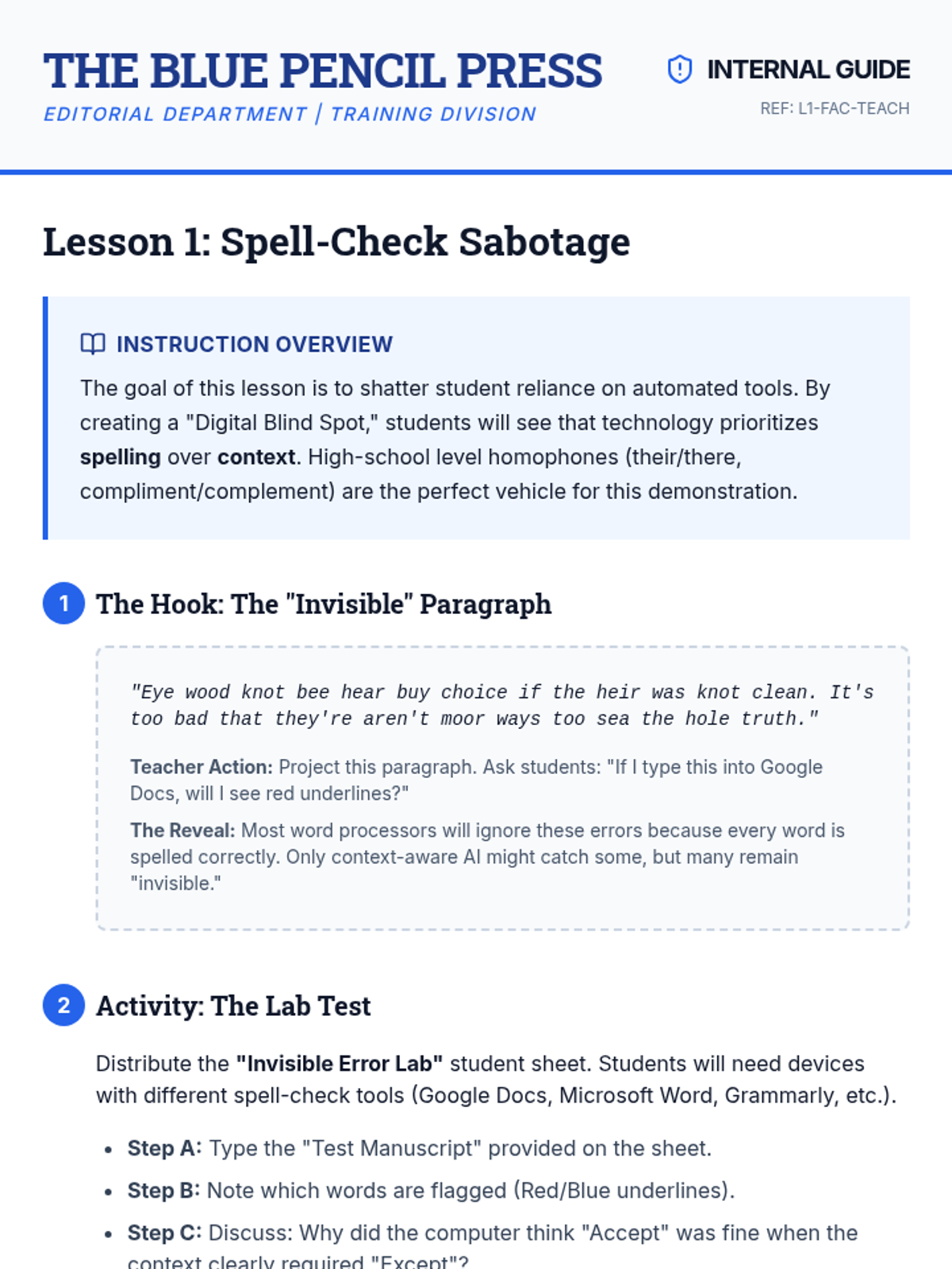 A gamified ELA sequence where 10th-grade students act as copy editors for 'The Blue Pencil Press,' mastering homophones and revision strategies through systematic inquiry and simulation.