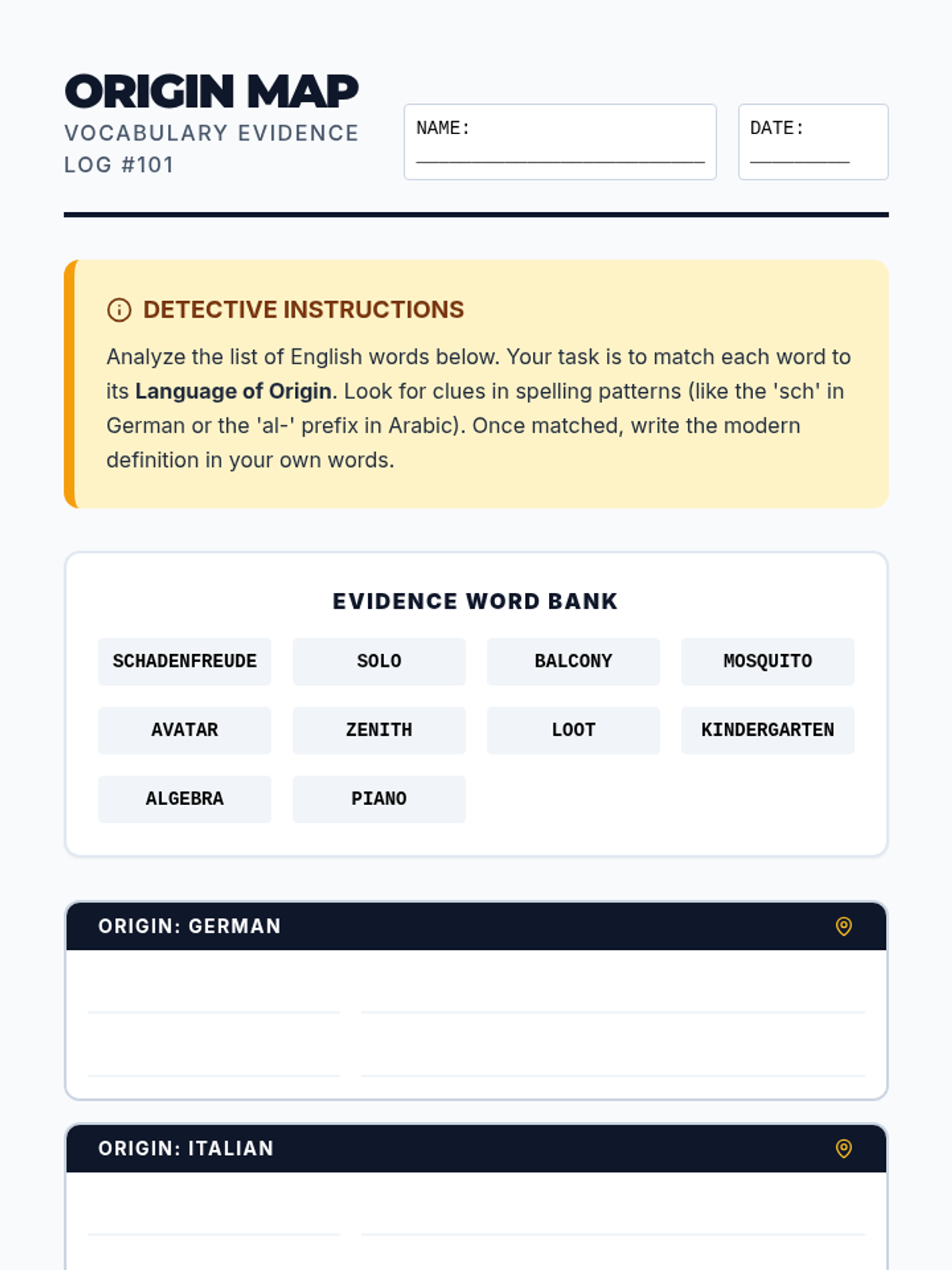 Students act as linguistic detectives to explore how English has evolved through borrowing words from other languages. They will trace the etymological roots of common loanwords and understand the historical and cultural contexts that brought them into everyday use.