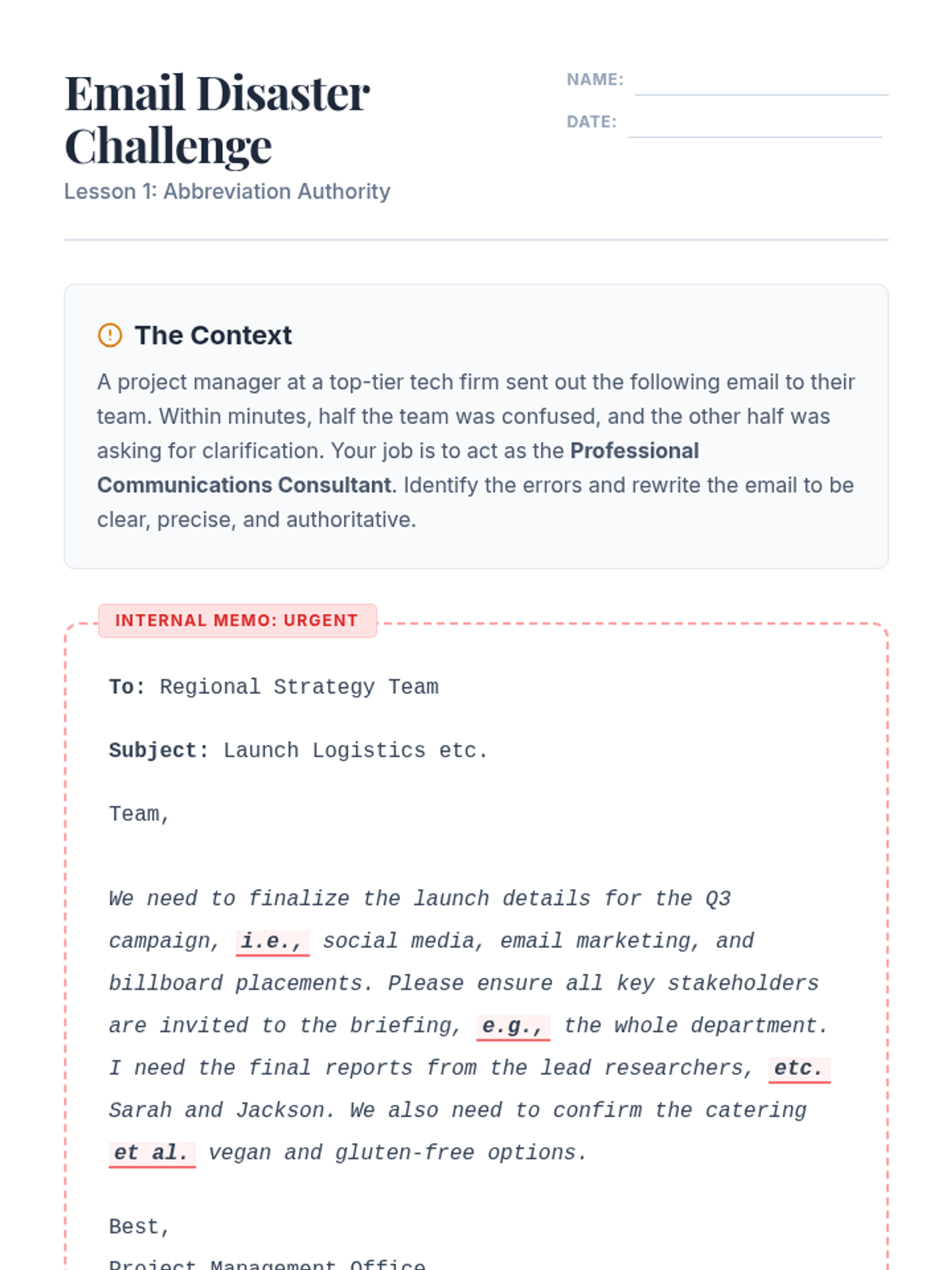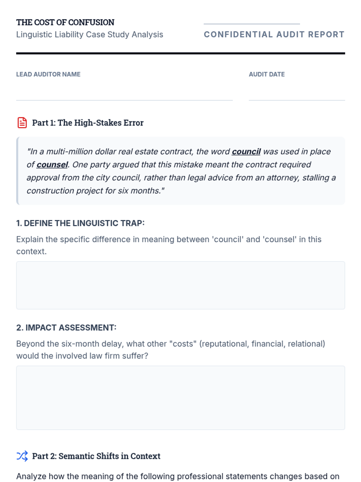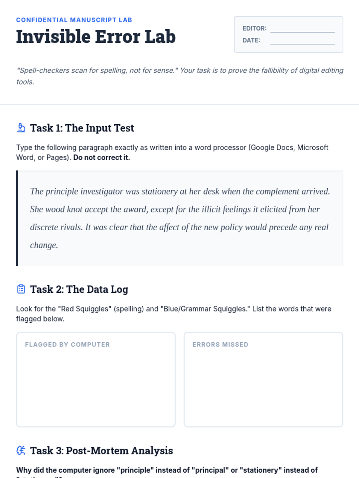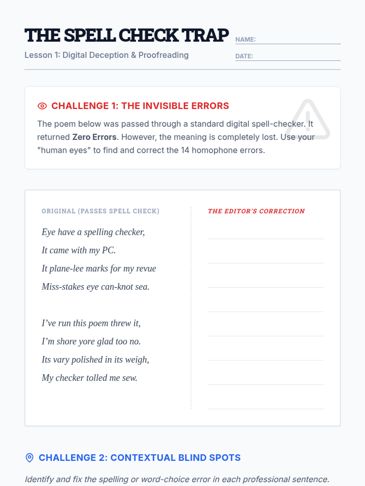 This sequence addresses the critical role of linguistic precision in professional and technical writing, focusing on how homophone errors can undermine credibility. Students transition from identifying common errors to mastering complex, workplace-specific homophone pairs, culminating in a simulated editorial workshop.