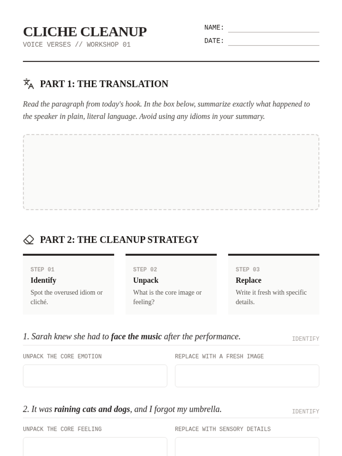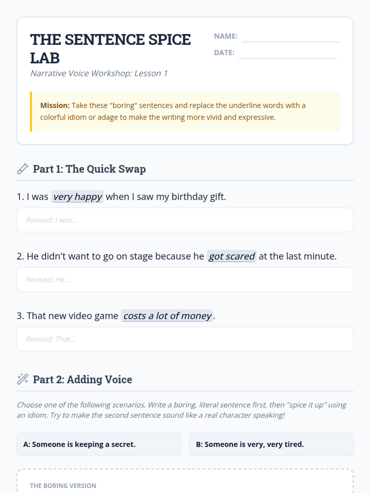 A writer's workshop sequence for 8th-grade students to master the intentional use of idioms and adages in narrative writing. Students move from identifying clichés to using idioms for characterization, mood, and subverting reader expectations.