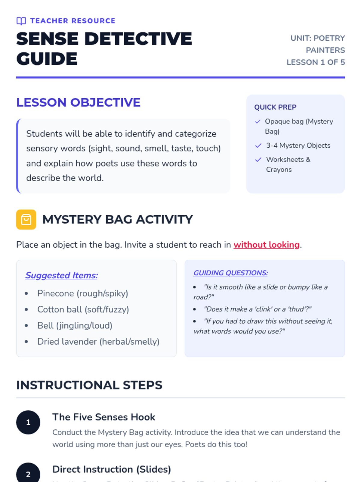 A 1st-grade sequence exploring how poets use sensory language to create mental images. Students progress from identifying sensory words to illustrating poems and writing their own descriptive riddles.