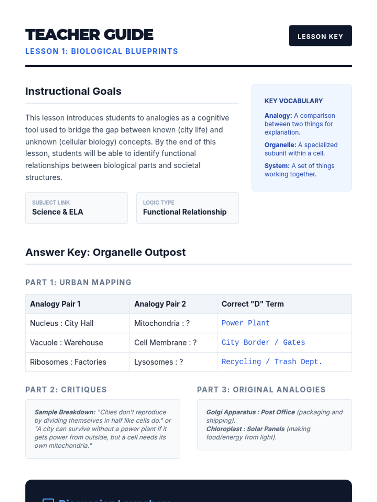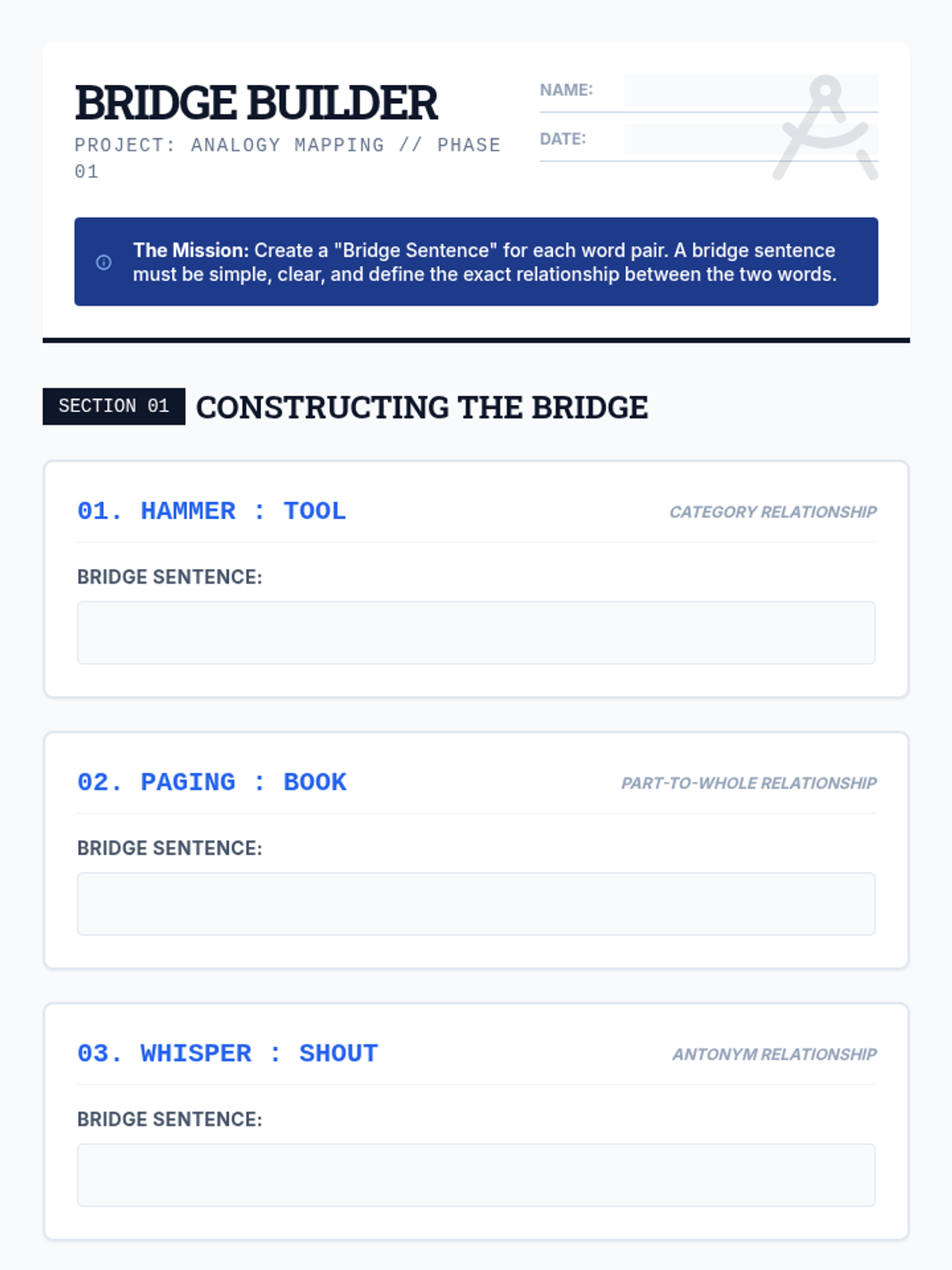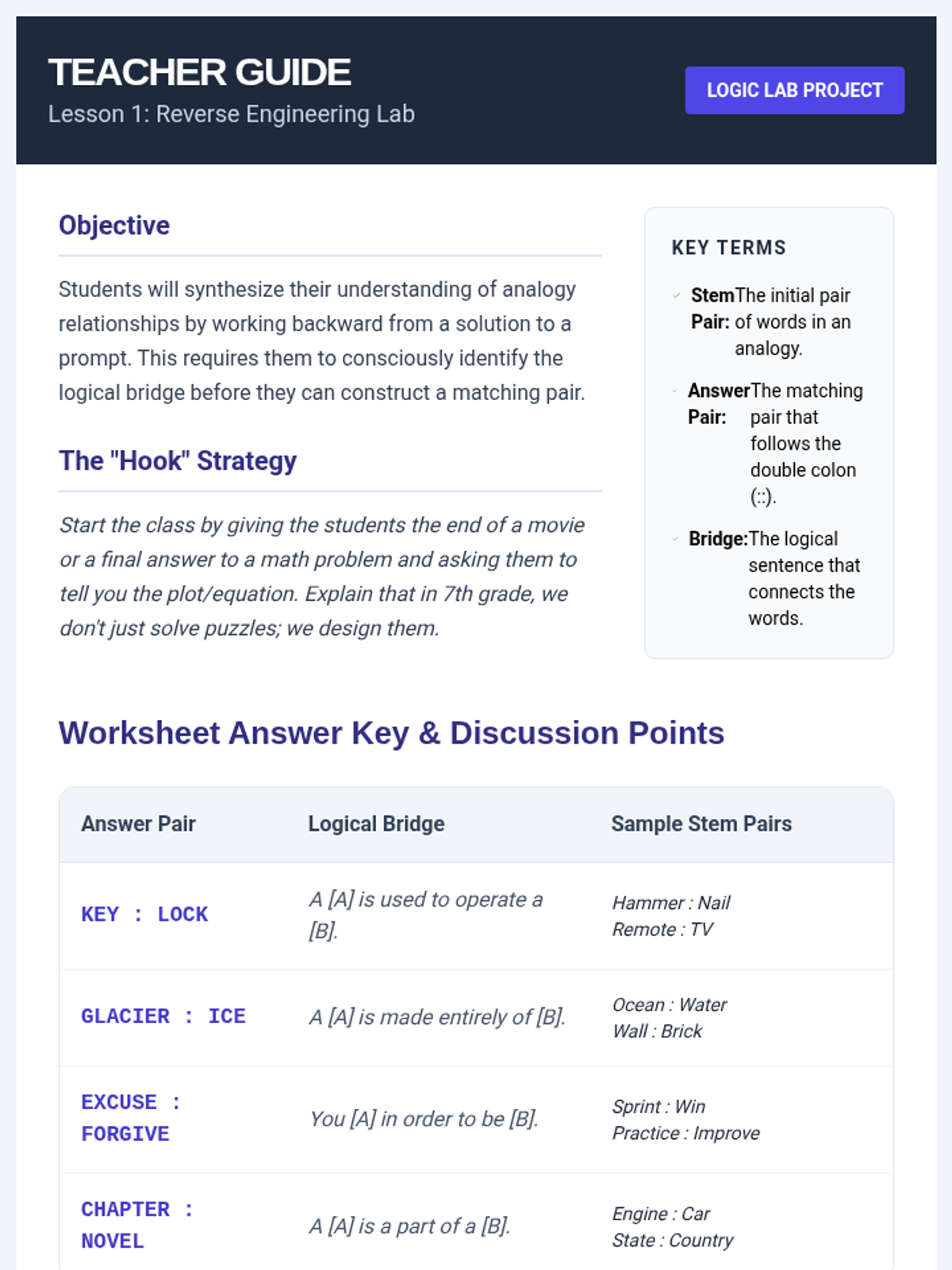A comprehensive sequence for 8th-grade students focused on the mechanical reasoning and vocabulary skills required to solve and create analogies. Students progress from basic 'bridge sentences' to nuanced synonym/antonym pairs, structural relationships, and functional connections, concluding with a mastery project where they construct and validate their own logic-based analogies.