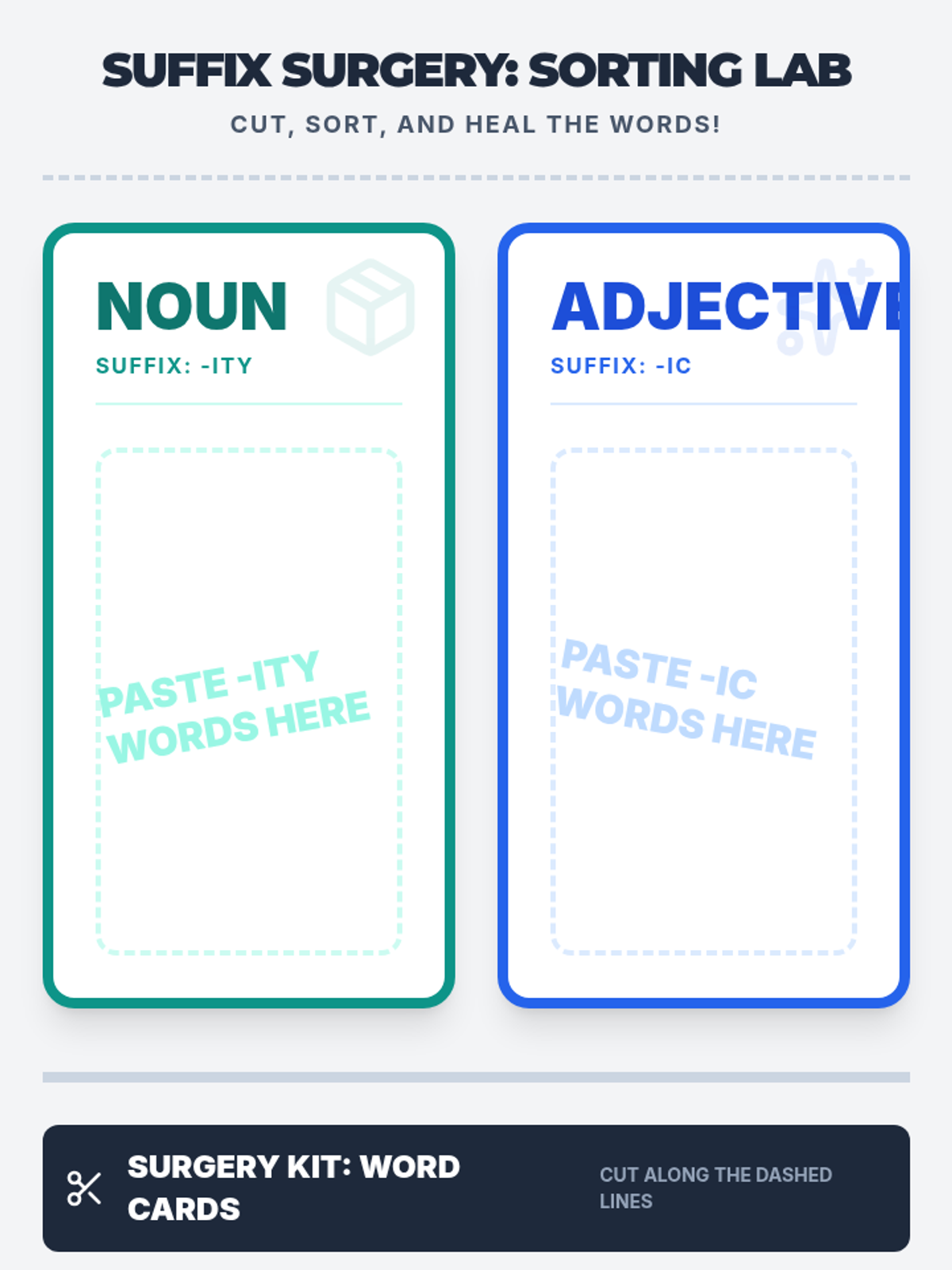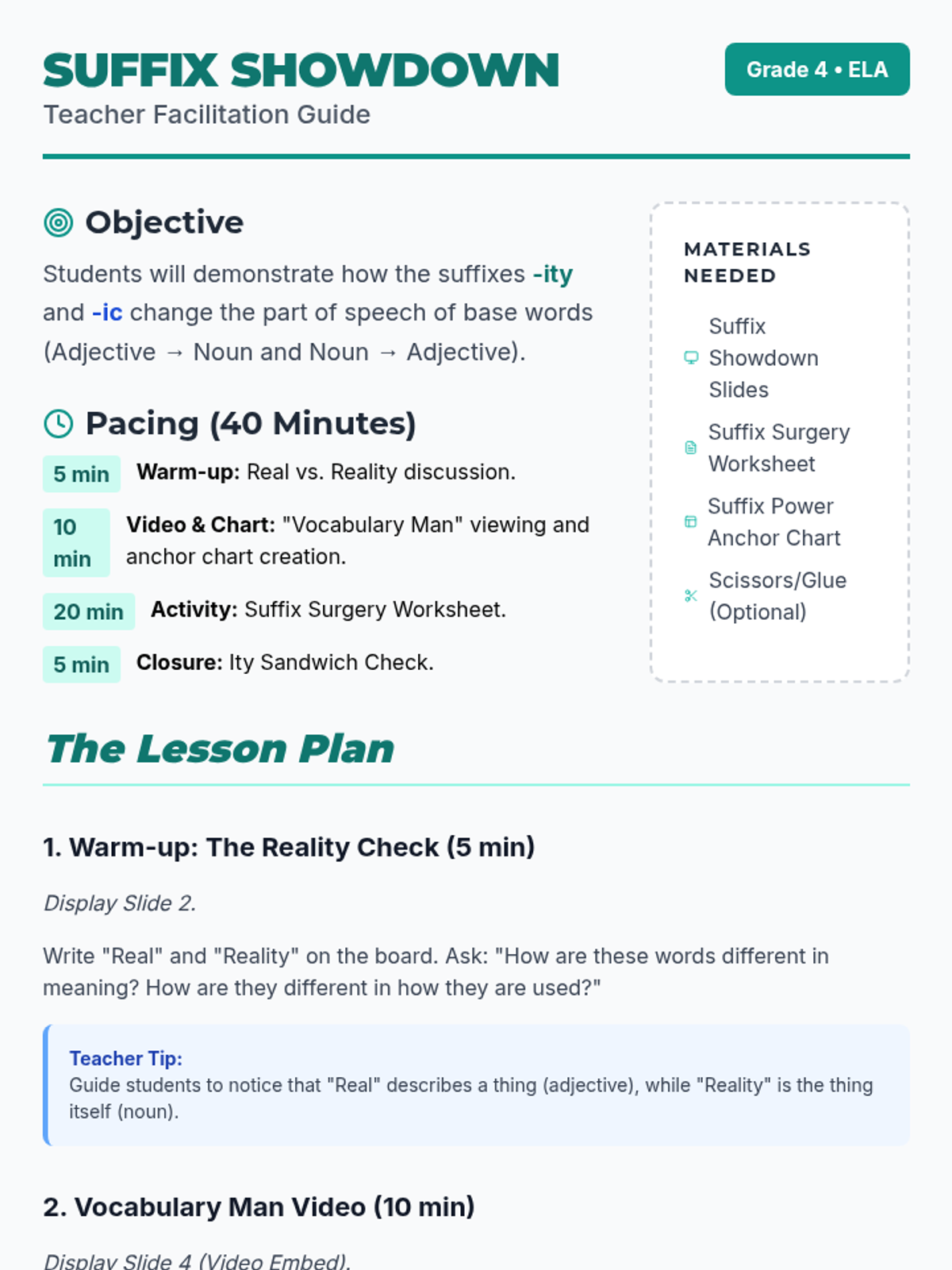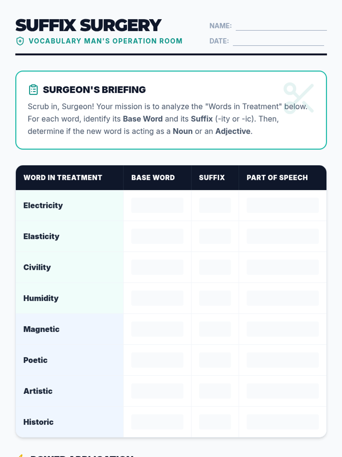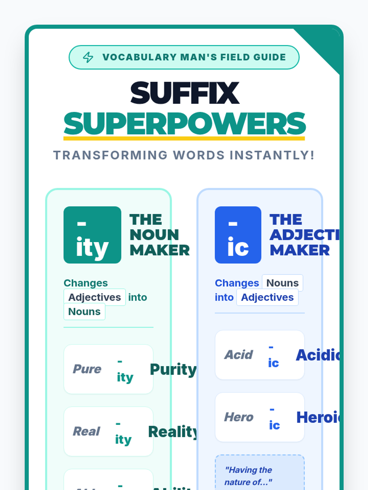 A punchy, superhero-themed lesson sequence focused on how the suffixes -ity and -ic transform base words into different parts of speech, inspired by Vocabulary Man.